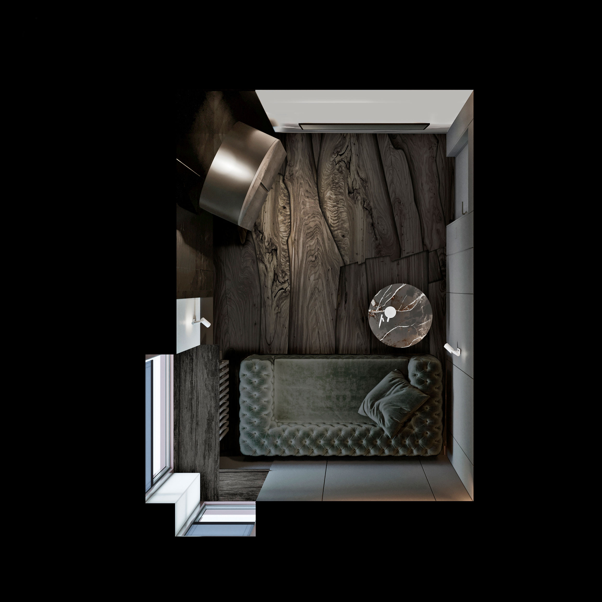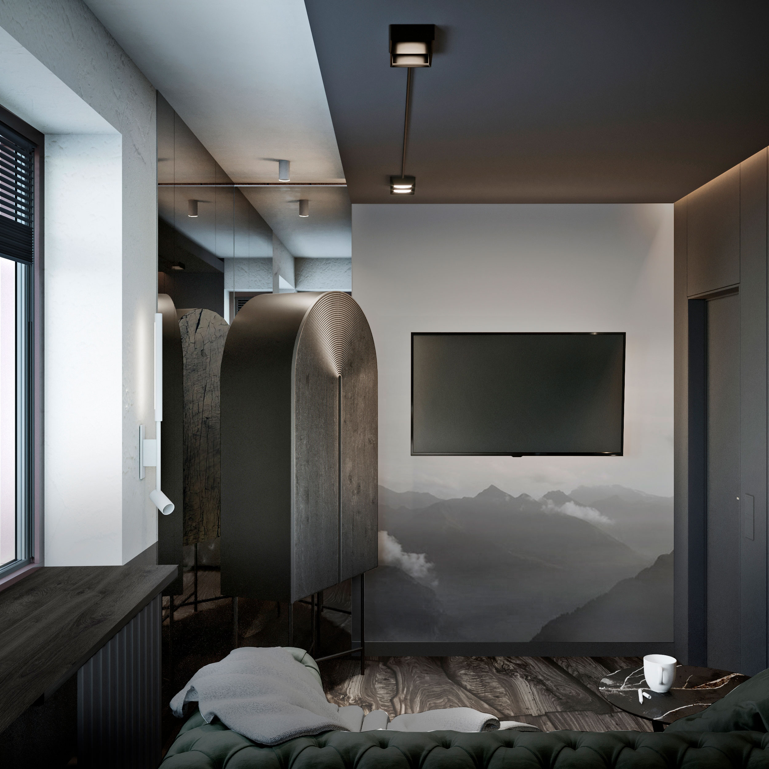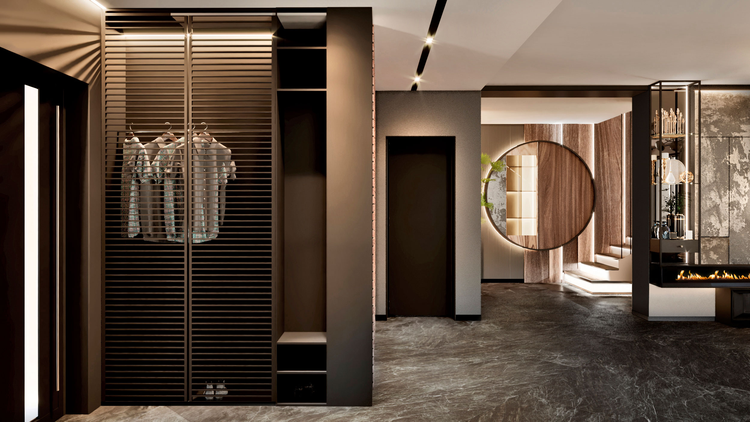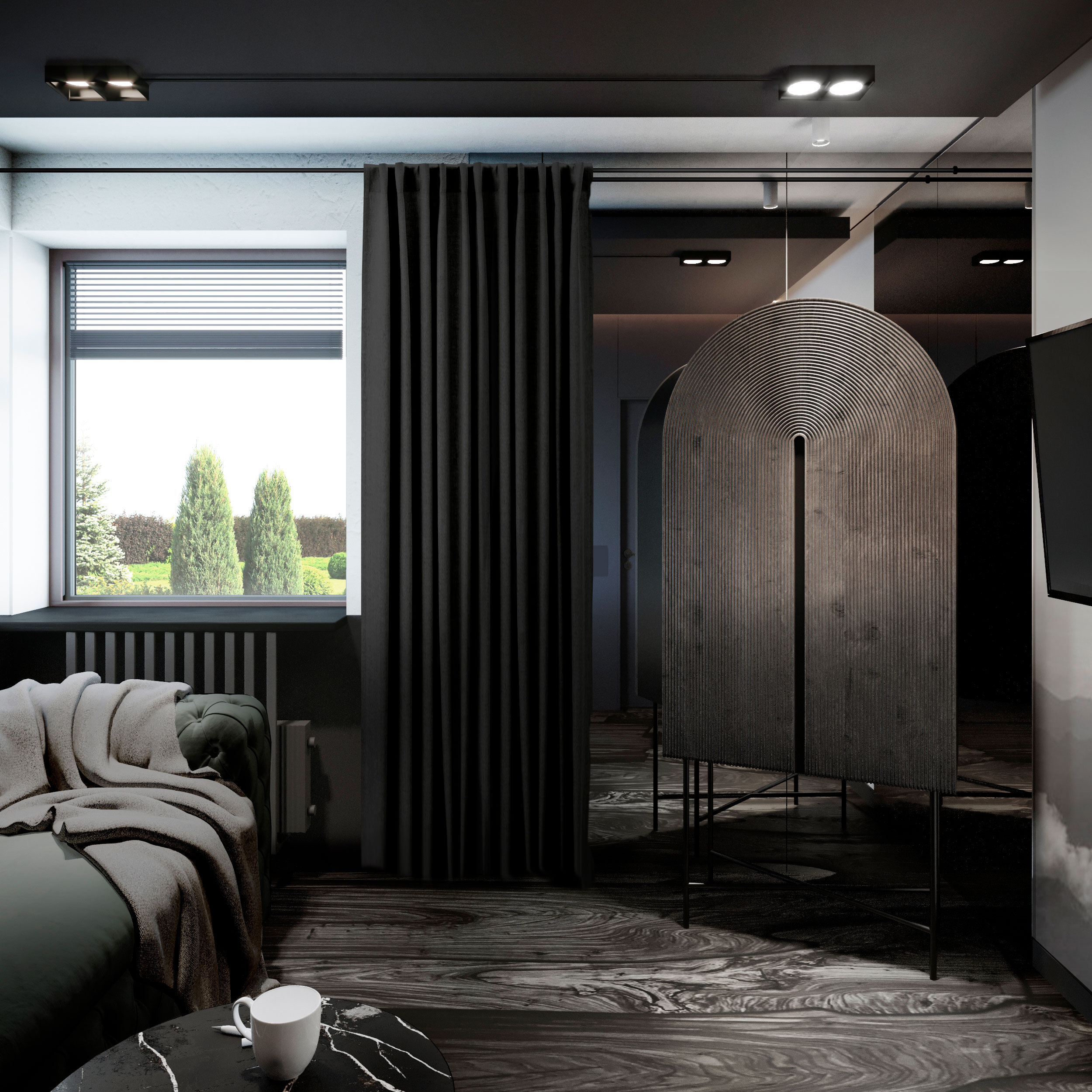 Комнаты 1-го этажа перетекают из одной в другую, это достигается при помощи общей цветовой гаммы, отдельные зоны выделены с помощью арт-объектов, панно. Зона гостиной при поддержке декоративного освещения создает гармоничное пространство для отдыха и приема гостей. Декоративность интерьеру придают панно из слэба дерева, лайтбокс, акцентый элемент - винный погреб с подсветкой. Винная инсталляция акцентирует внимание гостей. Оттенки черного, серого, бежевого в отделке стен, сочетание тонких строгих вертикальных линий и арочных элементов вносят динамику в гостевую комнату.