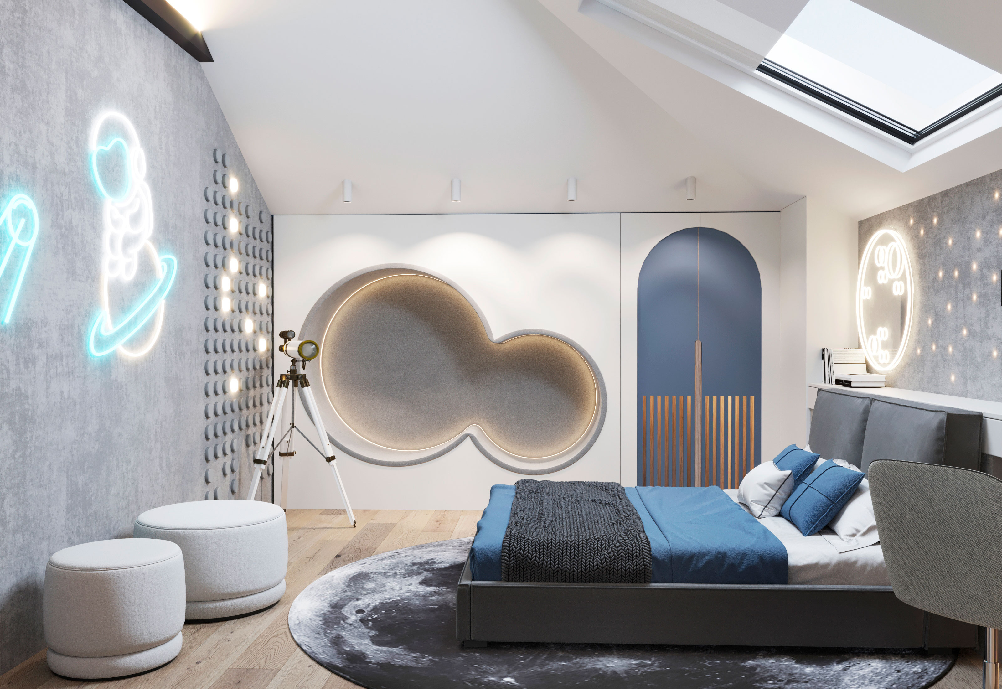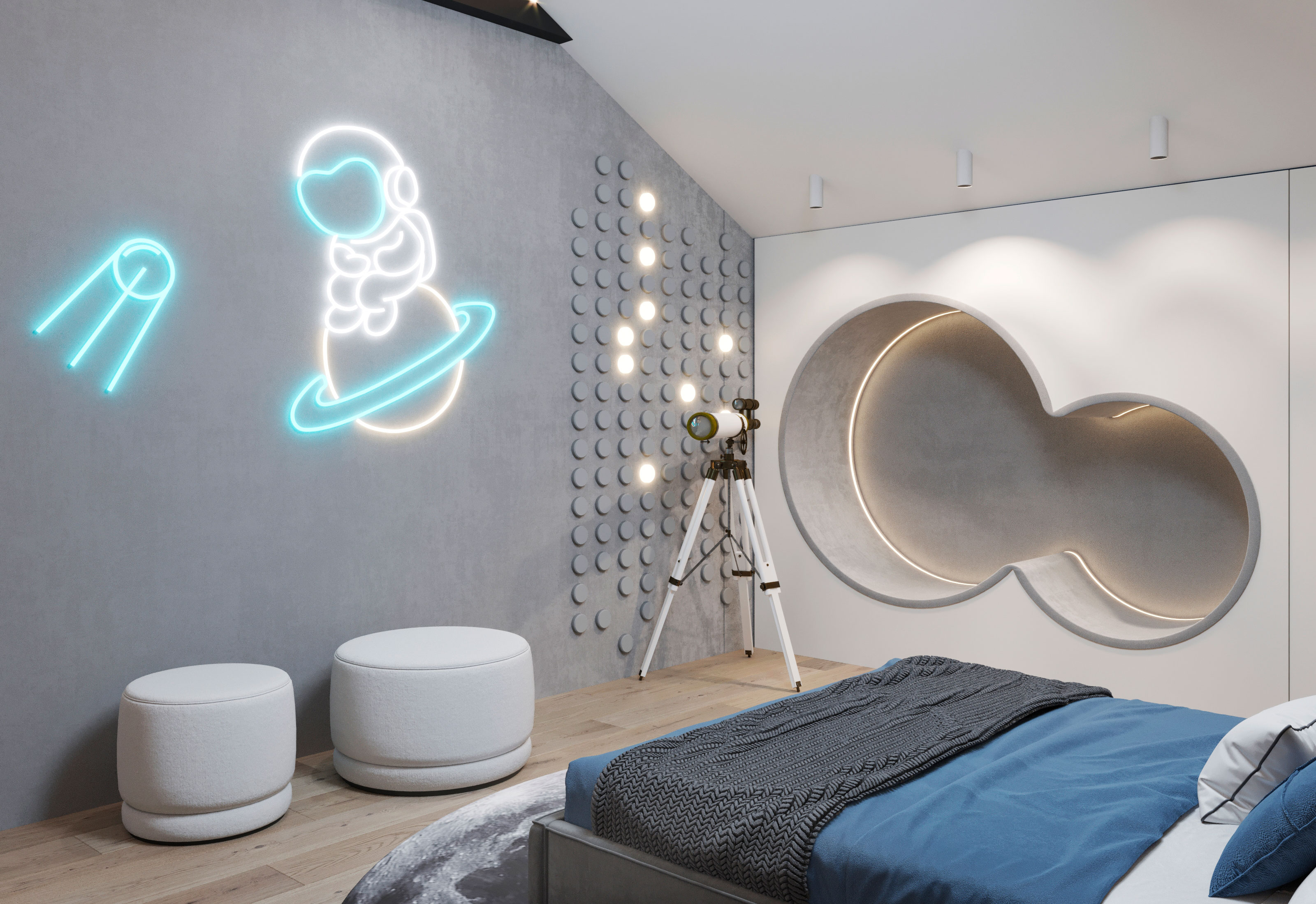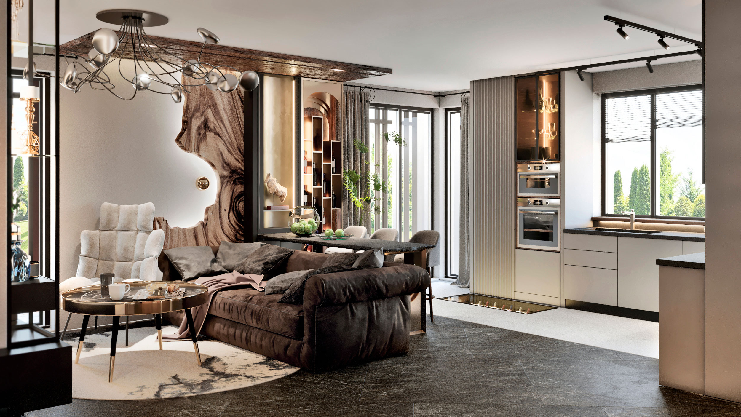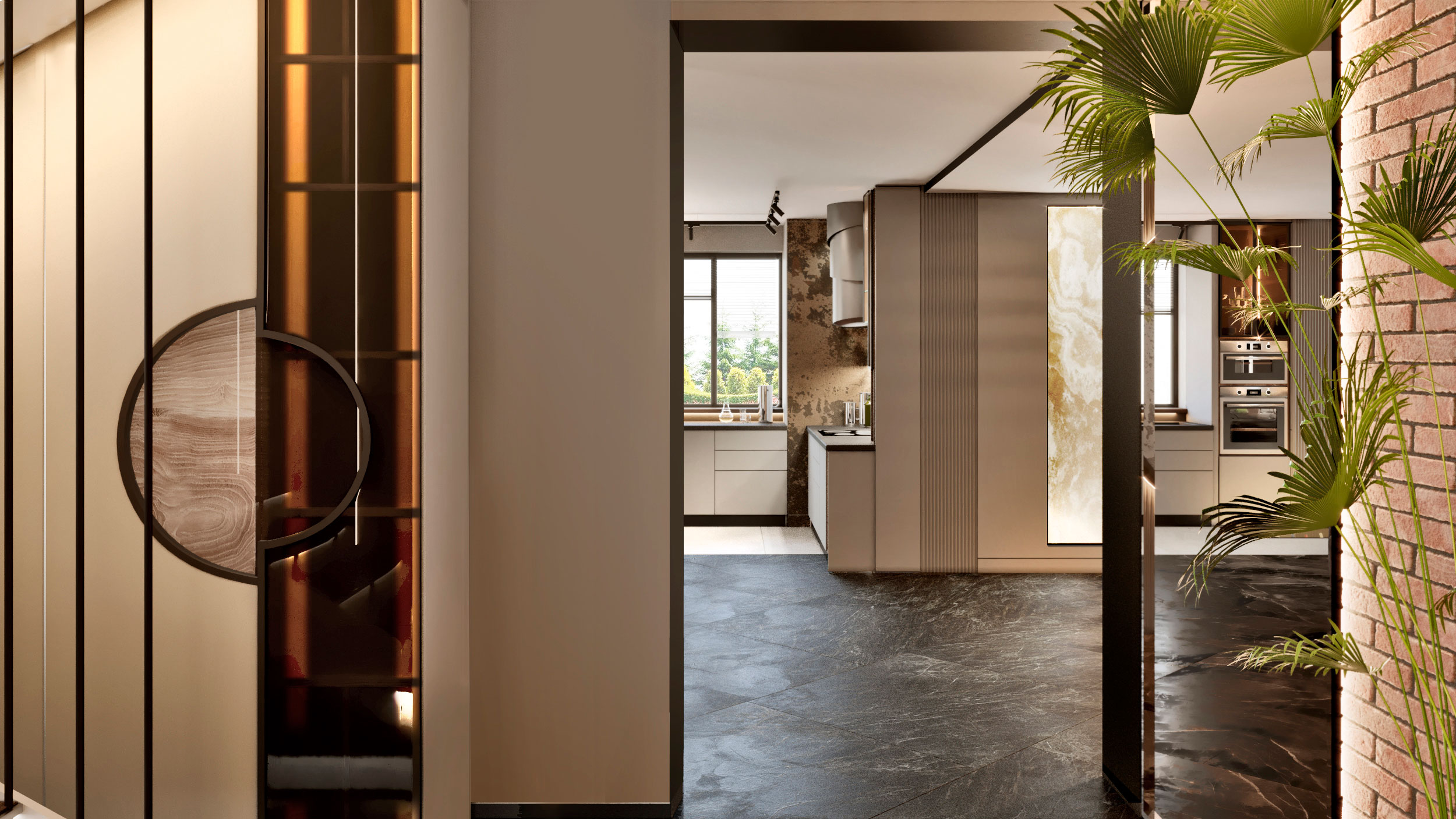 Каждое помещение имеет свой характер: аскетичная затемненная гостевая и яркая, парадная, наполненная декором, гостиная, космическая невесомость в детской комнате и зеленый уголок в ванной. Художественное оформление интерьера, арт-объекты и декор в целом создают уникальное наполненное искусством пространство.
