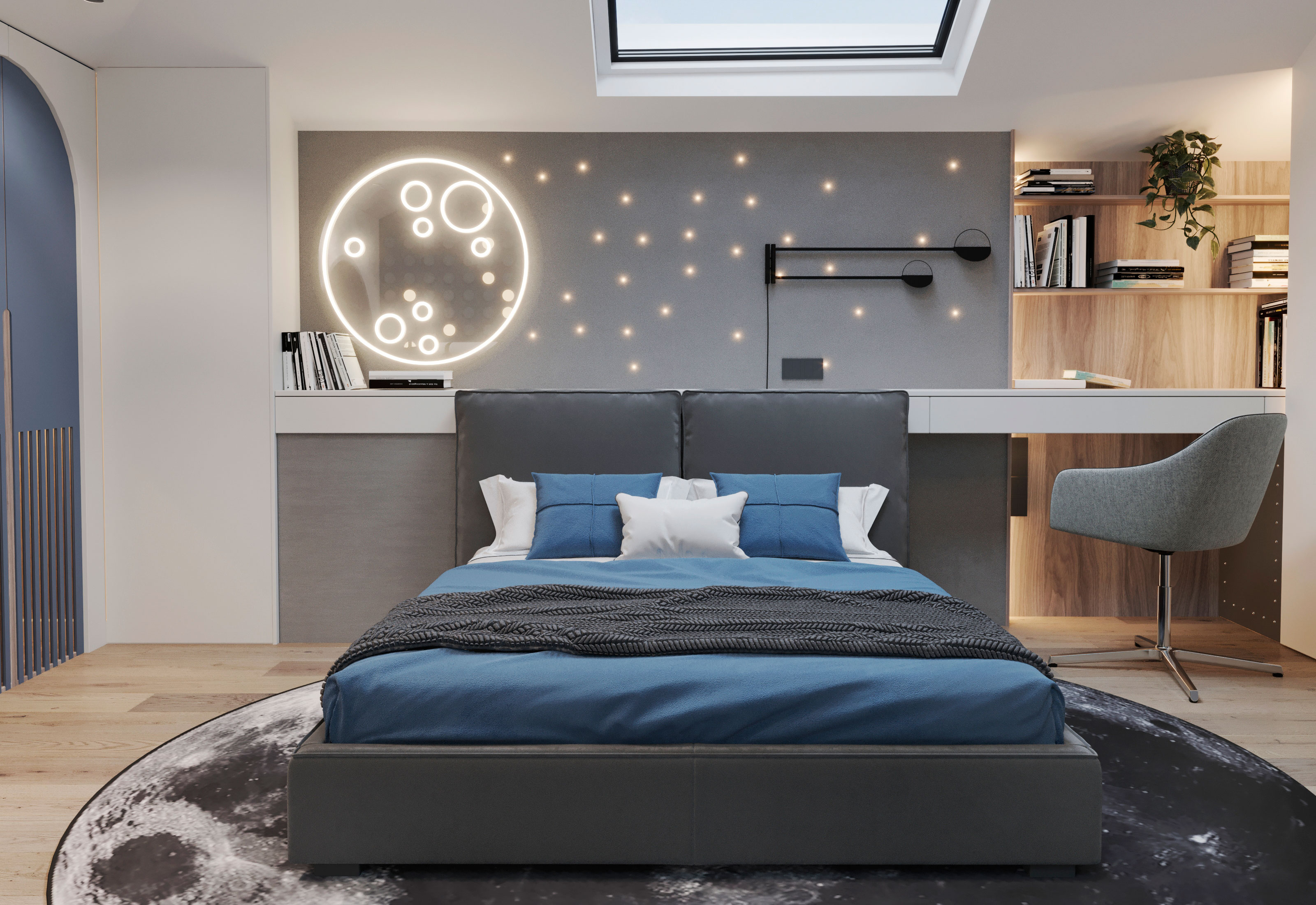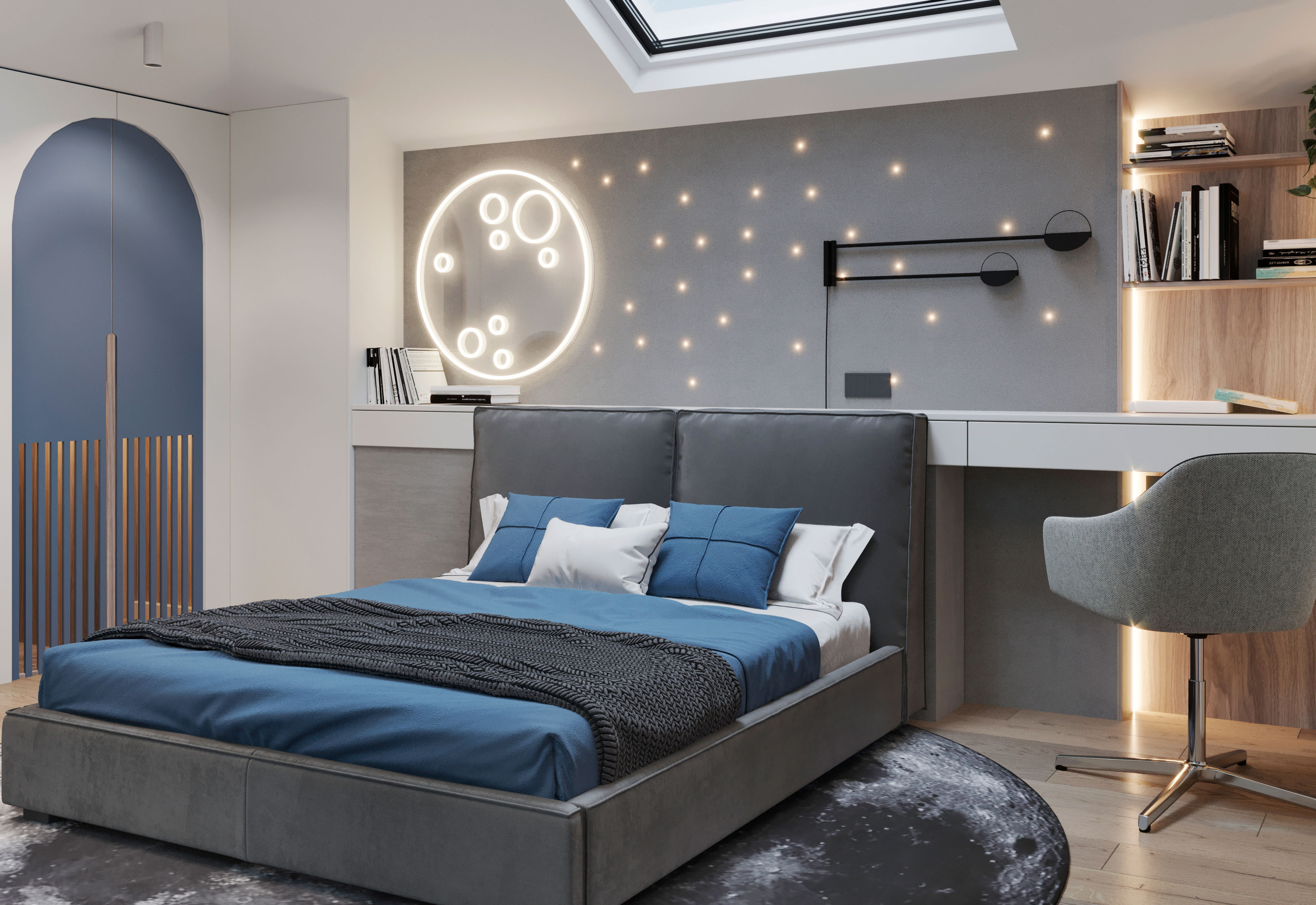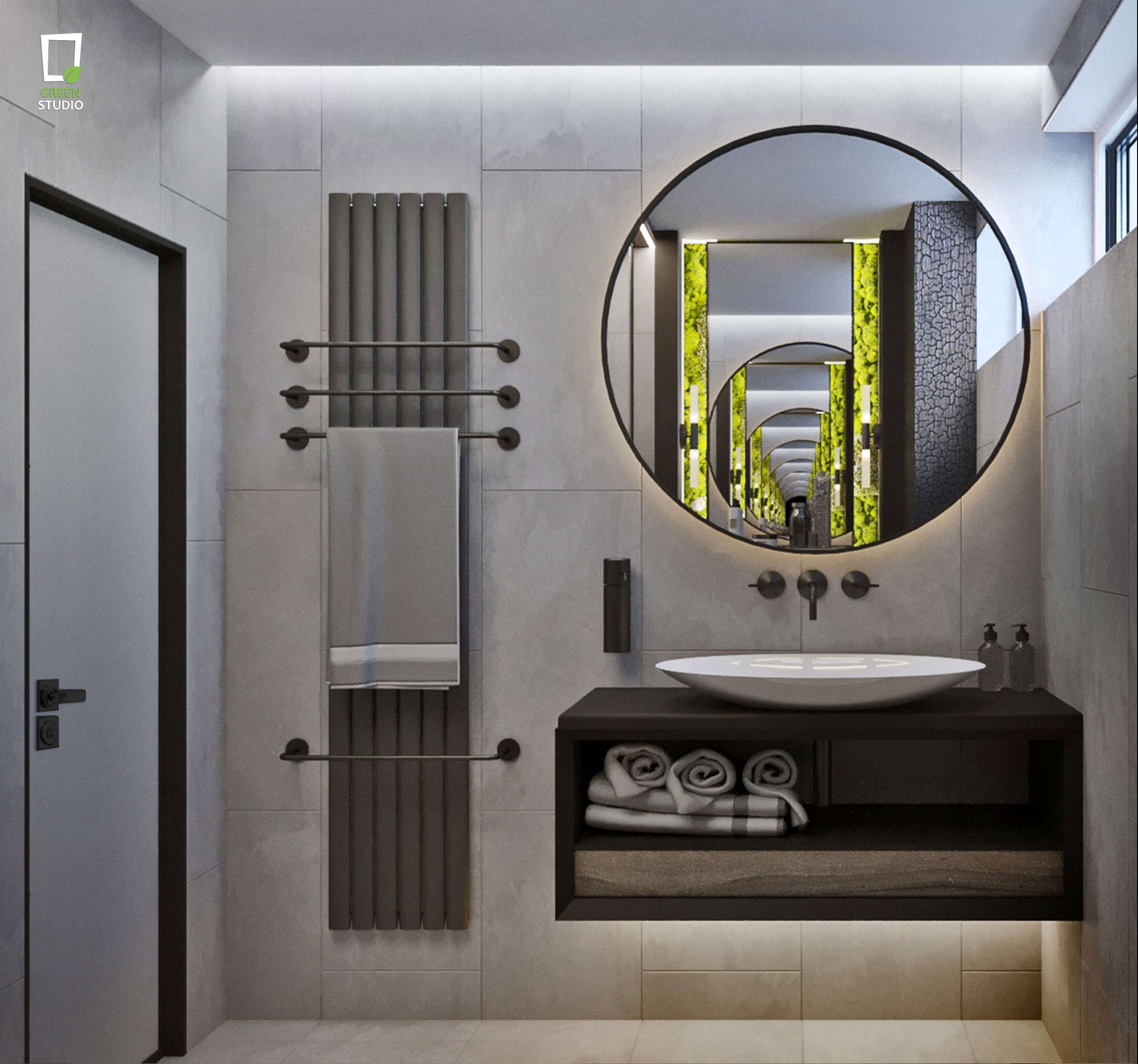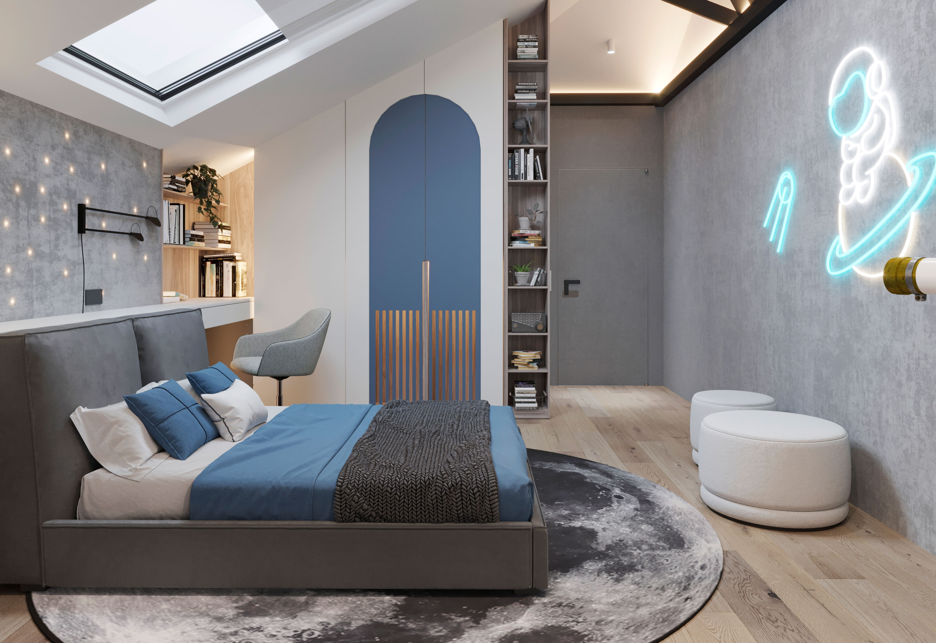 Каждое помещение имеет свой характер: аскетичная затемненная гостевая и яркая, парадная, наполненная декором, гостиная, космическая невесомость в детской комнате и зеленый уголок в ванной. Художественное оформление интерьера, арт-объекты и декор в целом создают уникальное наполненное искусством пространство.