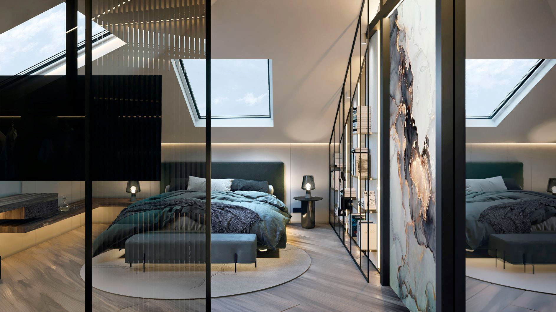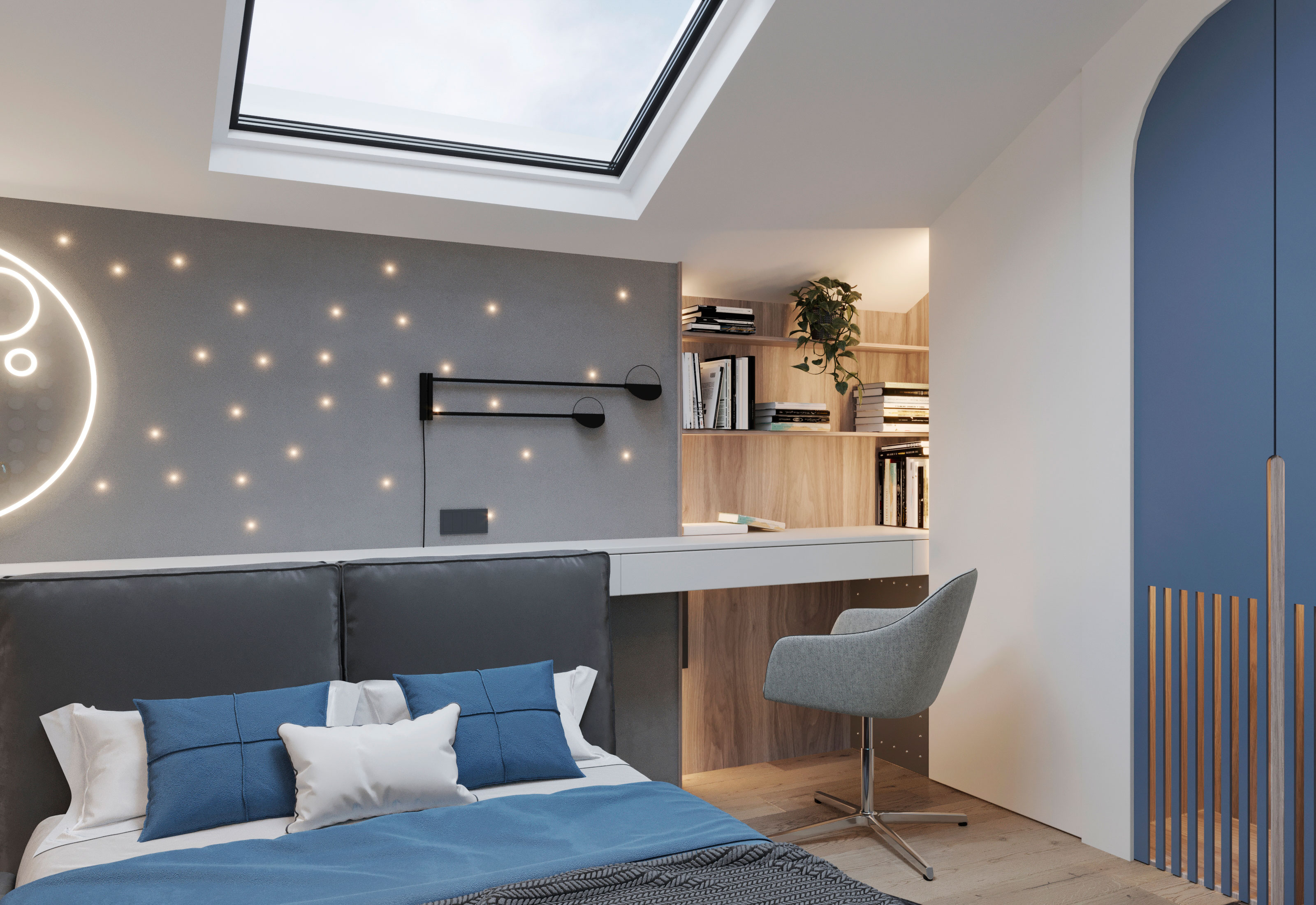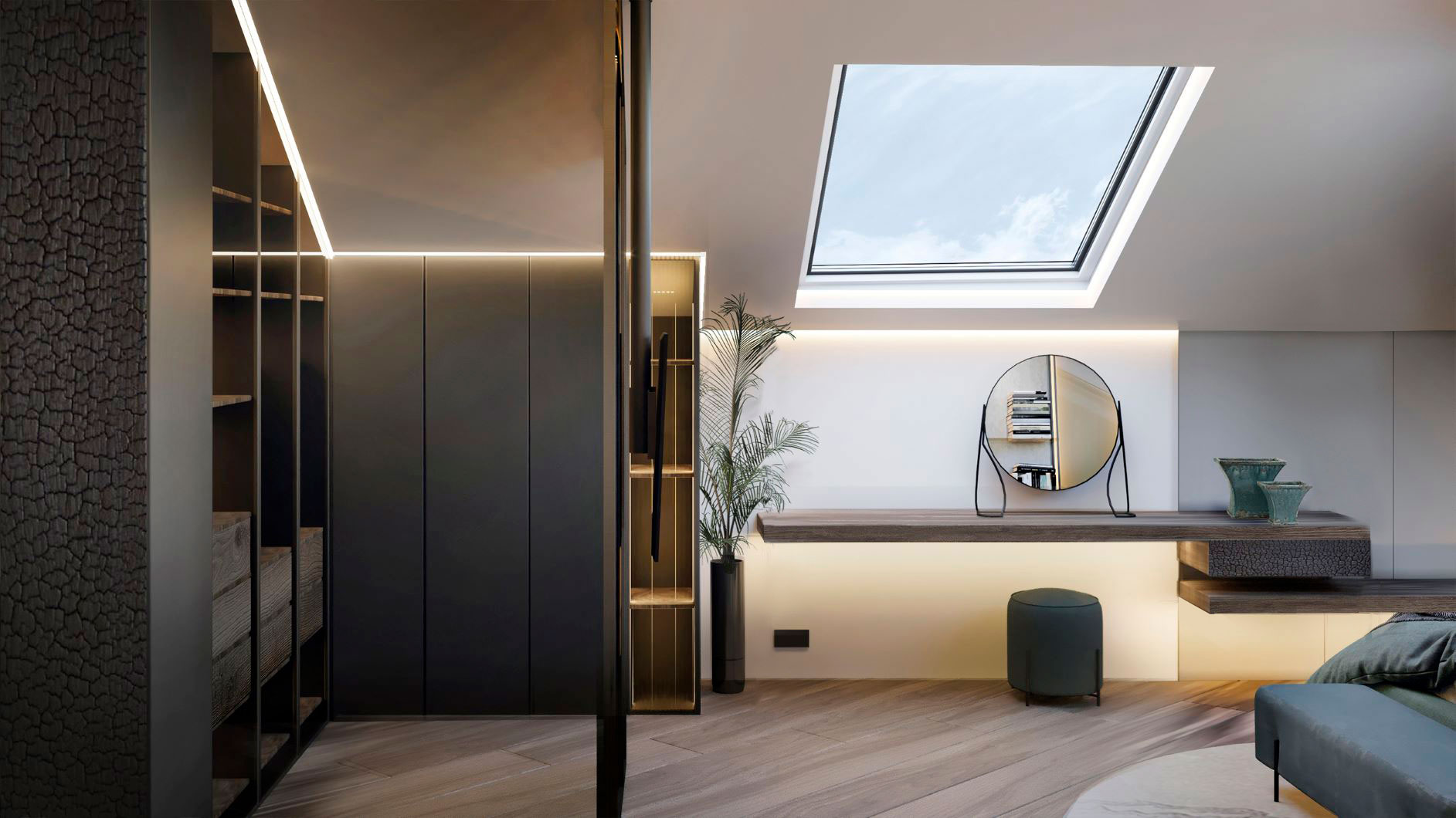 Воздушная легкость, солнечность интерьеров на 2-ом этаже достигнута при помощи светлых тонов, полупрозрачных поверхностей и различных сценариев освещения. Стеклянные тонированные перегородки выполняют функцию зонирования. Подсветка потолка вместе с направленным светом из окон увеличивают высоту помещений и создают эффект парения