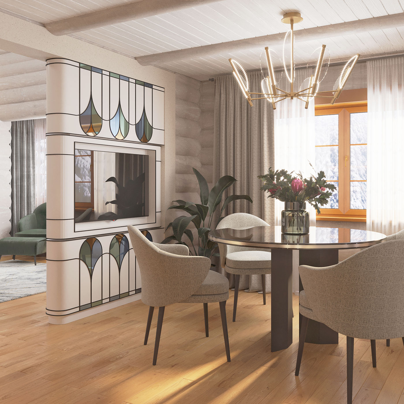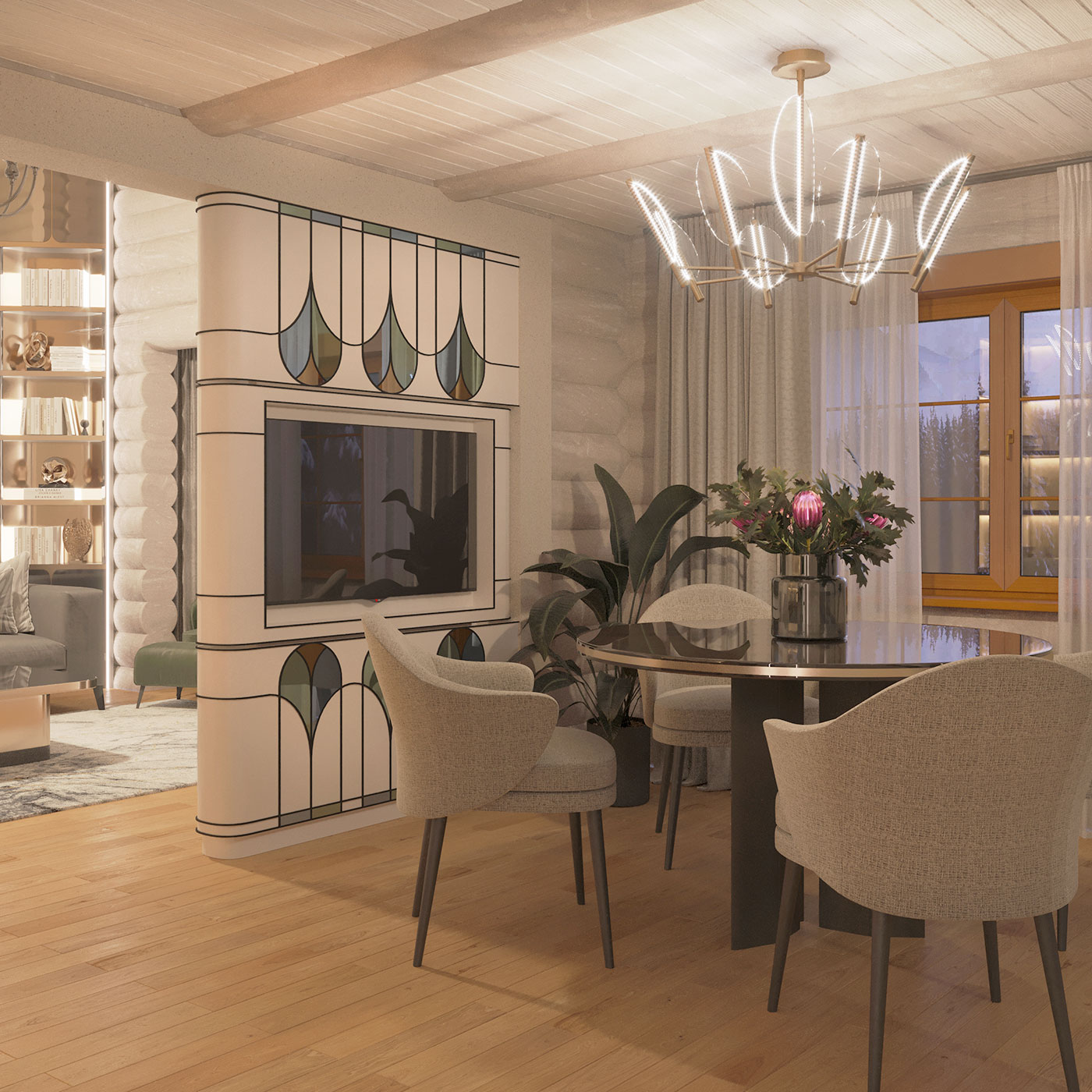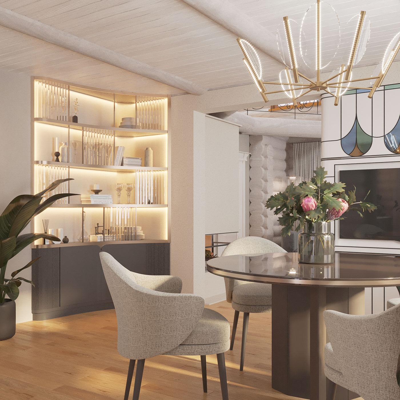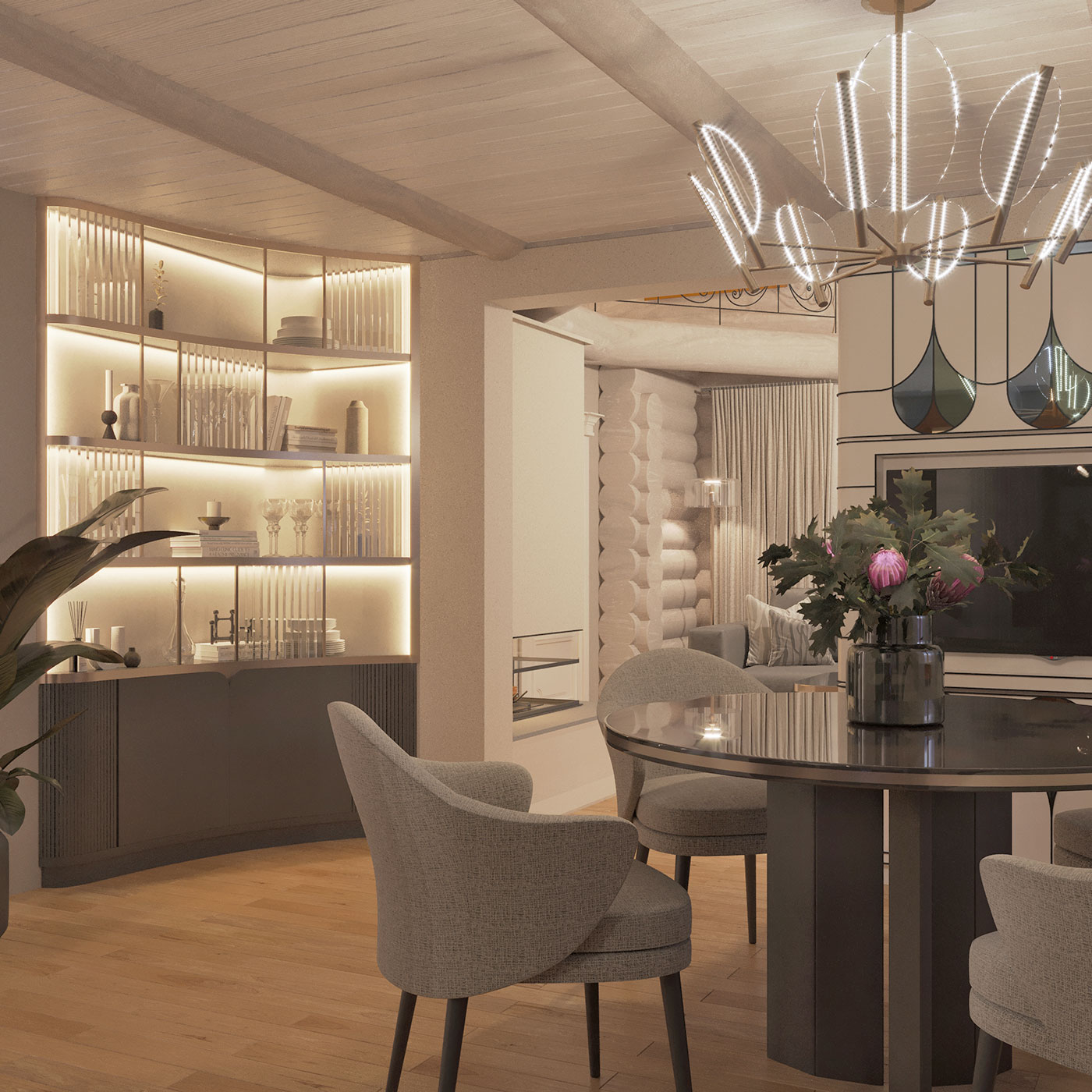 Интерьер многослойный, состоит из сложных переплетений плавных форм, графичных акцентов, цветовых акцентов, ненавязчивой элегантной роскоши и домашнего, располагающего к отдыху, уюта.