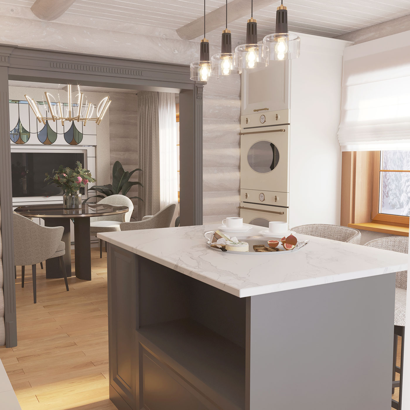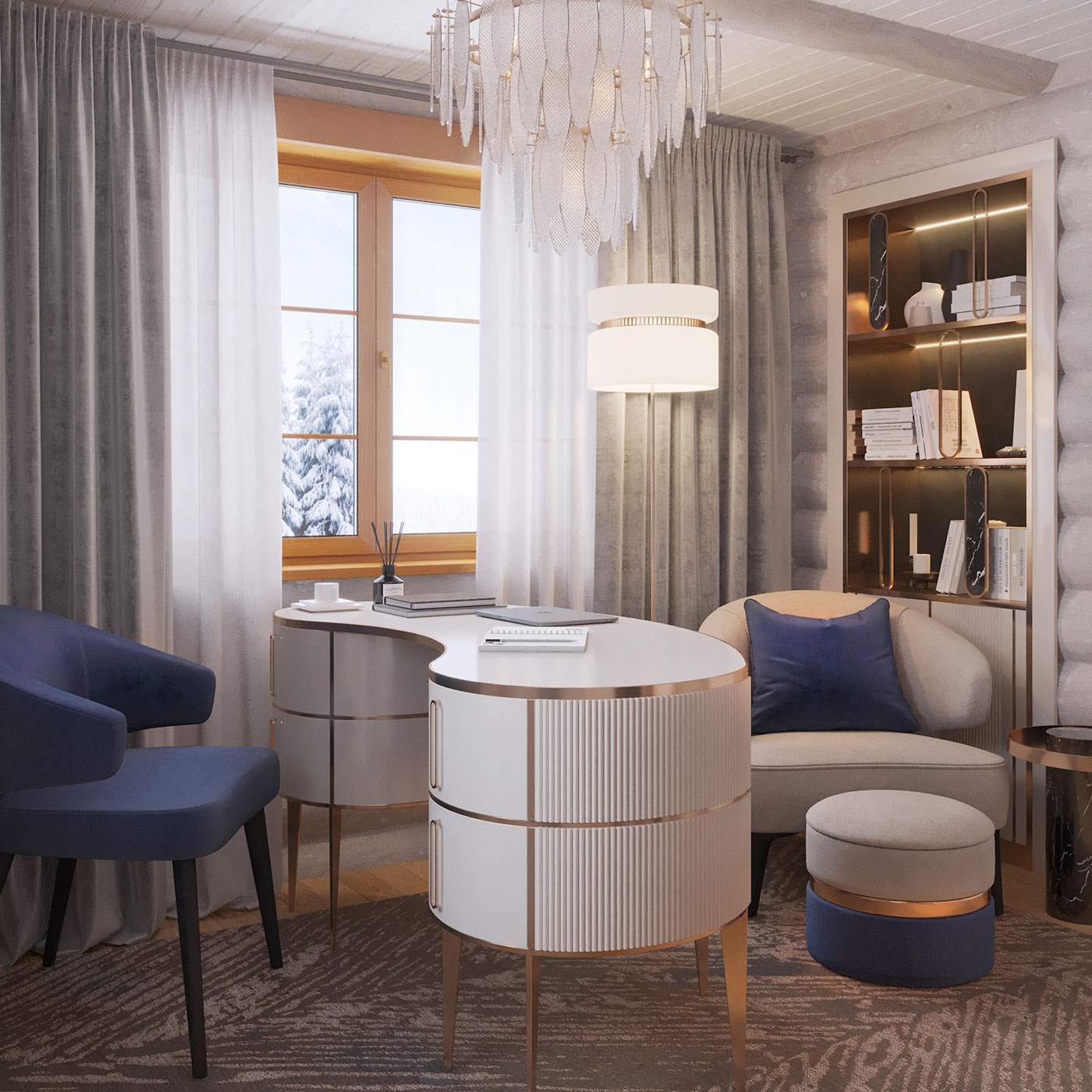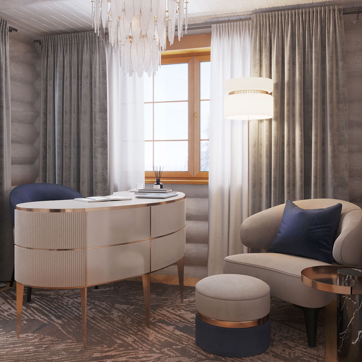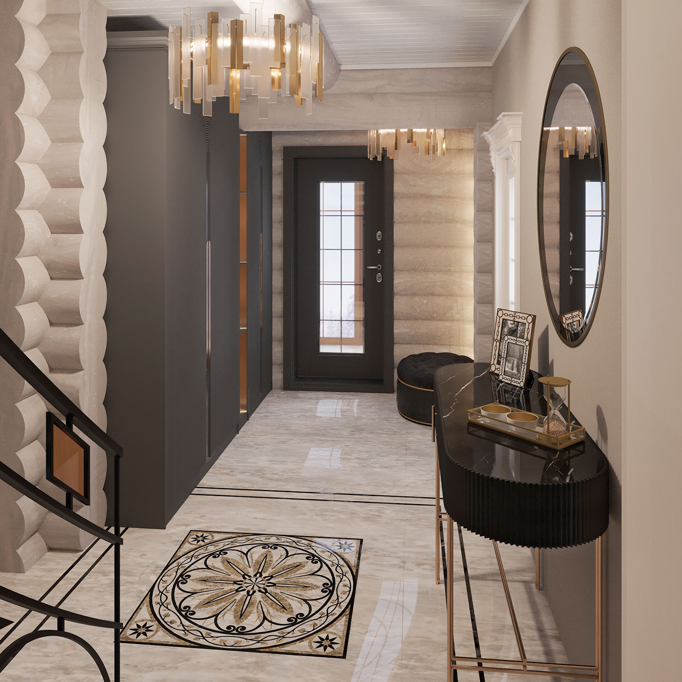Интерьер многослойный, состоит из сложных переплетений плавных форм, графичных акцентов, цветовых акцентов, ненавязчивой элегантной роскоши и домашнего, располагающего к отдыху, уюта.