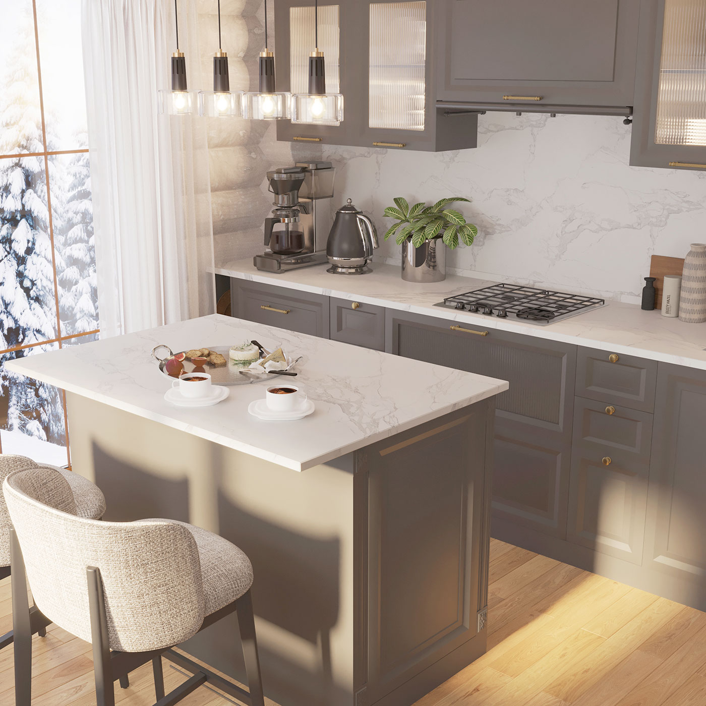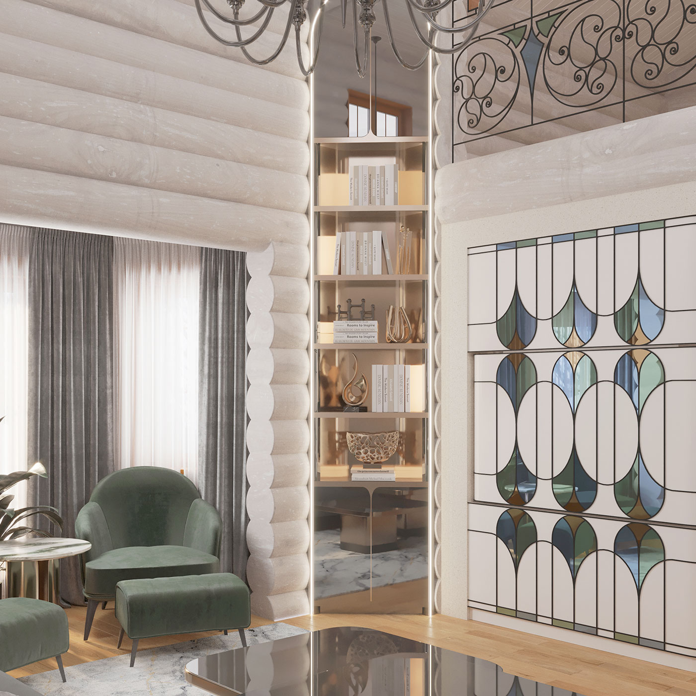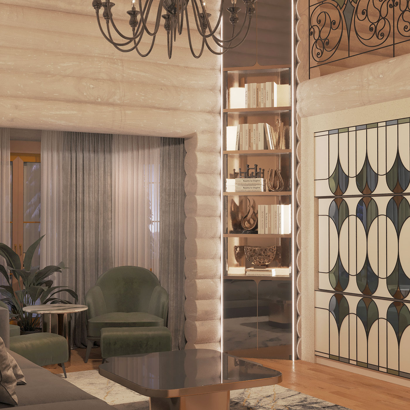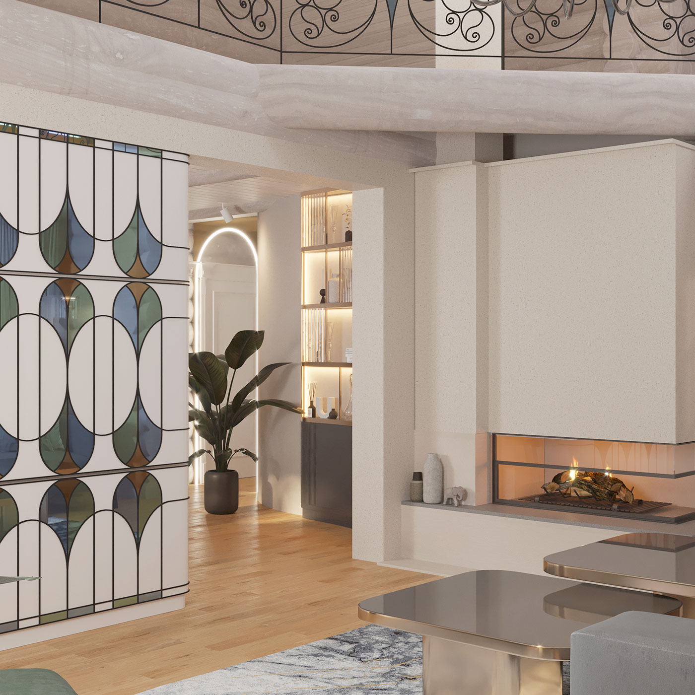 Элегантность проявляется в виде акцентных графичных элементов мебели: в оттенках теплой бронзы в сочетании с натуральным камнем, бликах цветного стекла, обрамленного графичным контуром.