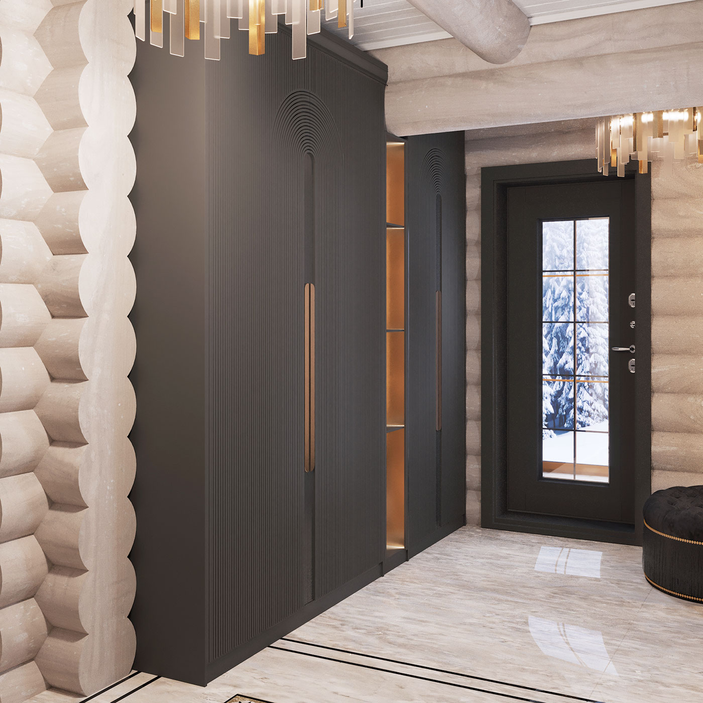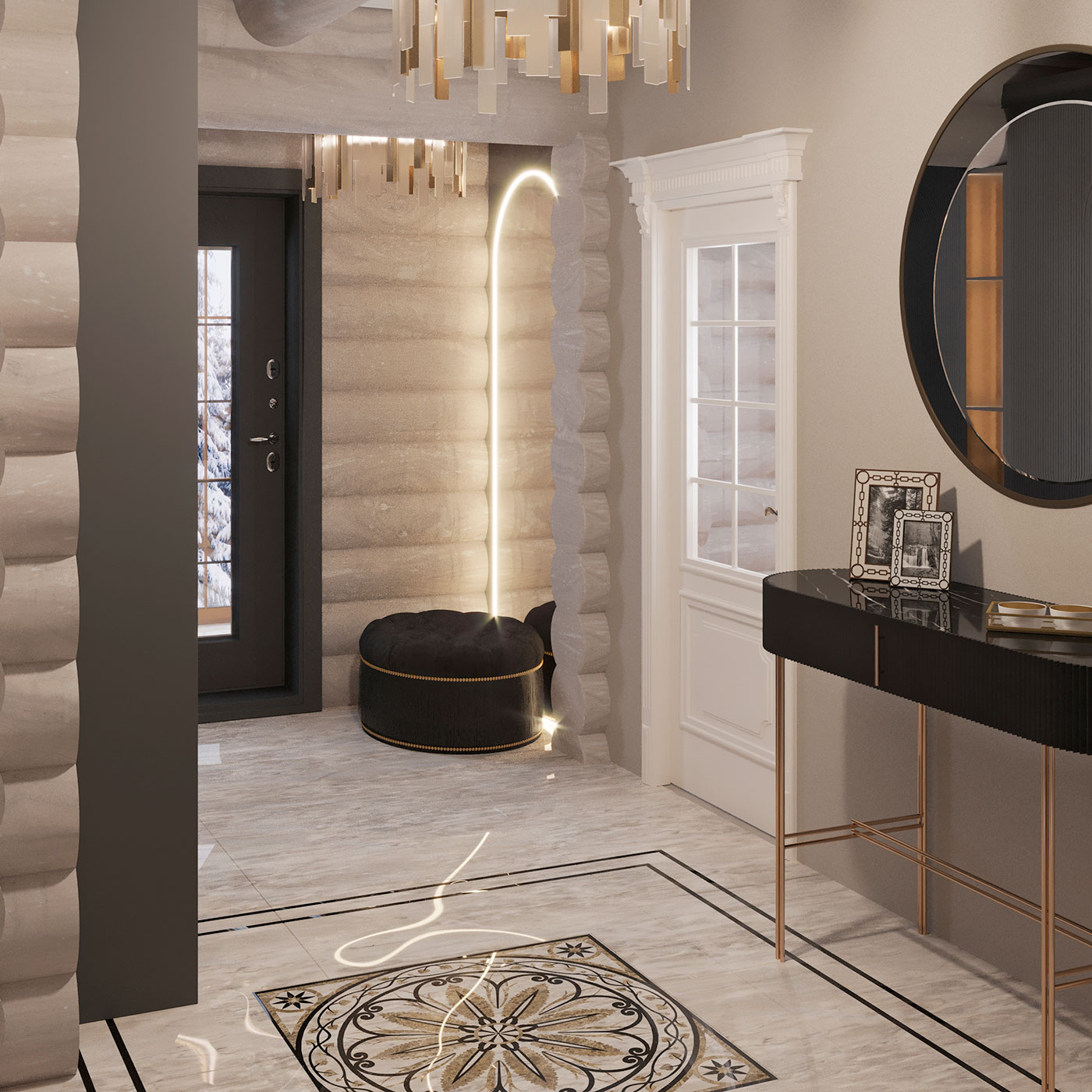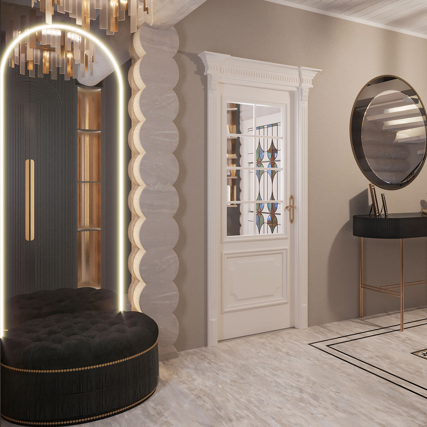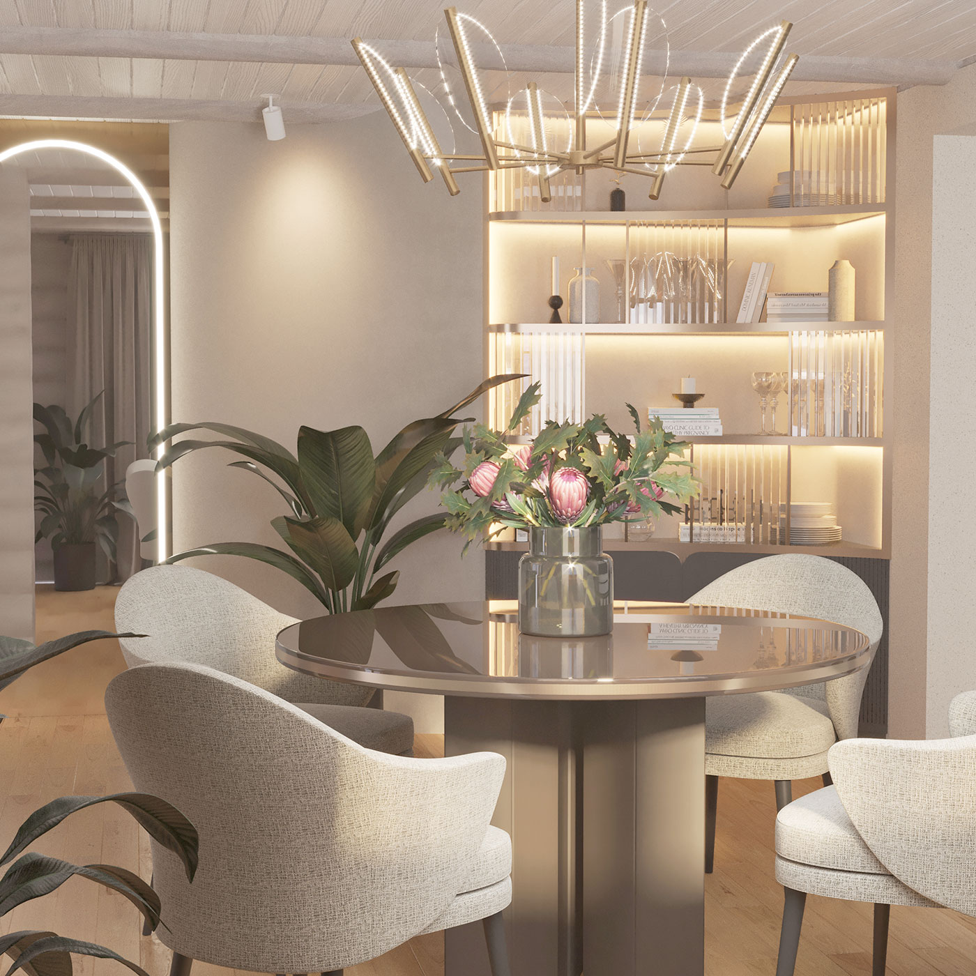 Мягкости интерьеру добавляют скрытые подсветки стеллажей, шкафов, акцентом являются арочные композиции из LED-подсветки на зеркальных поверхностях в холле, гостиной и столовой.