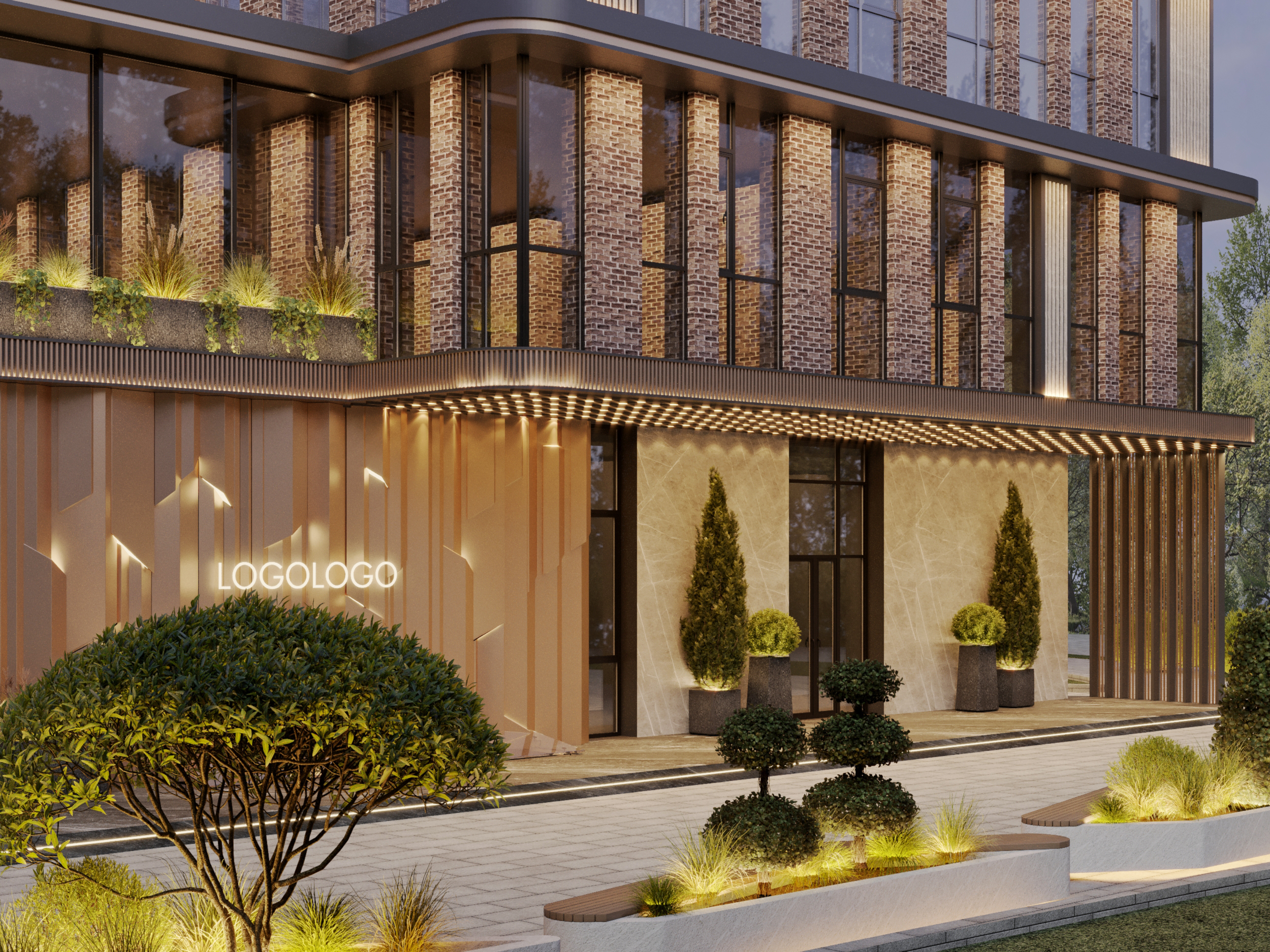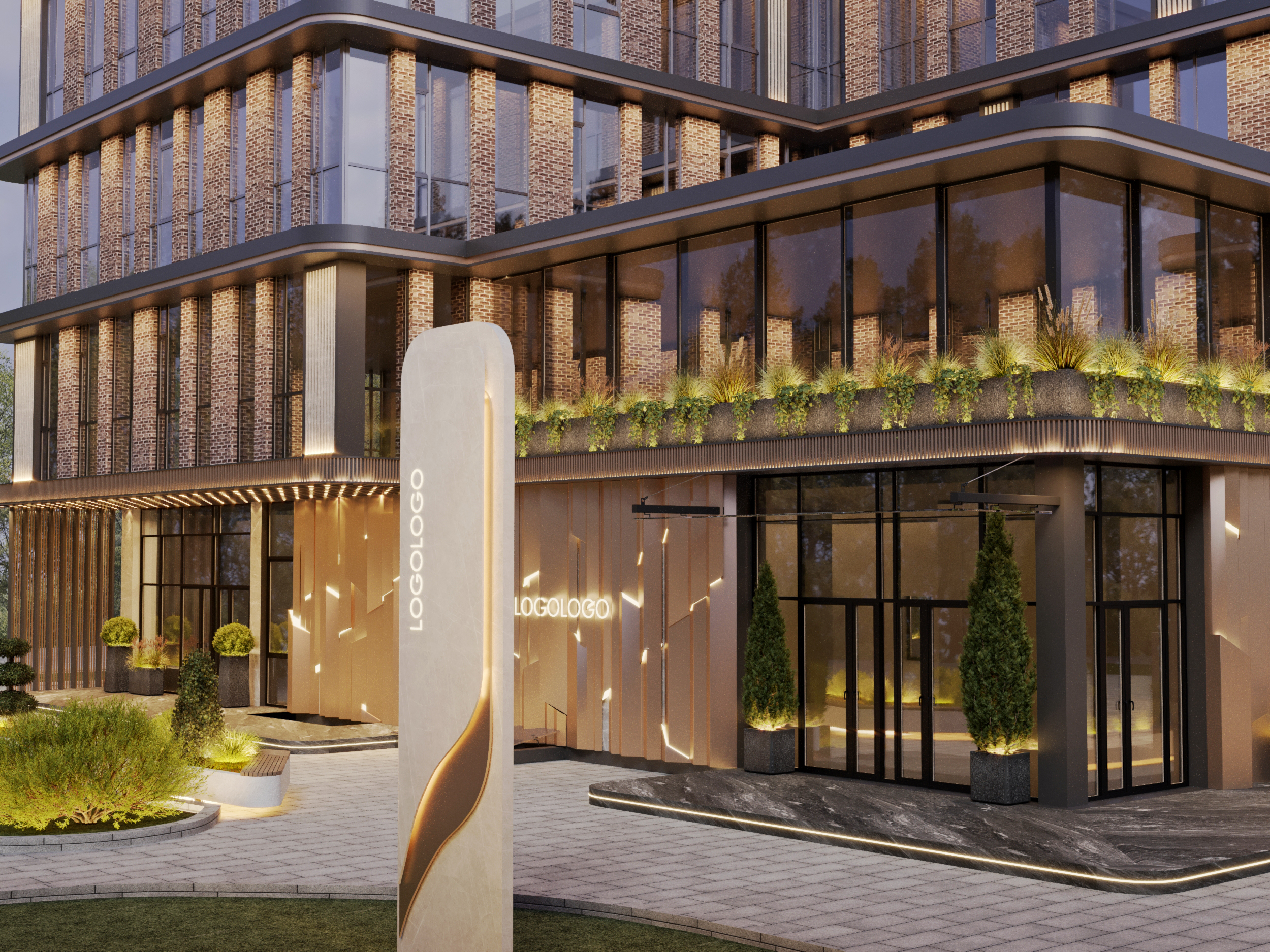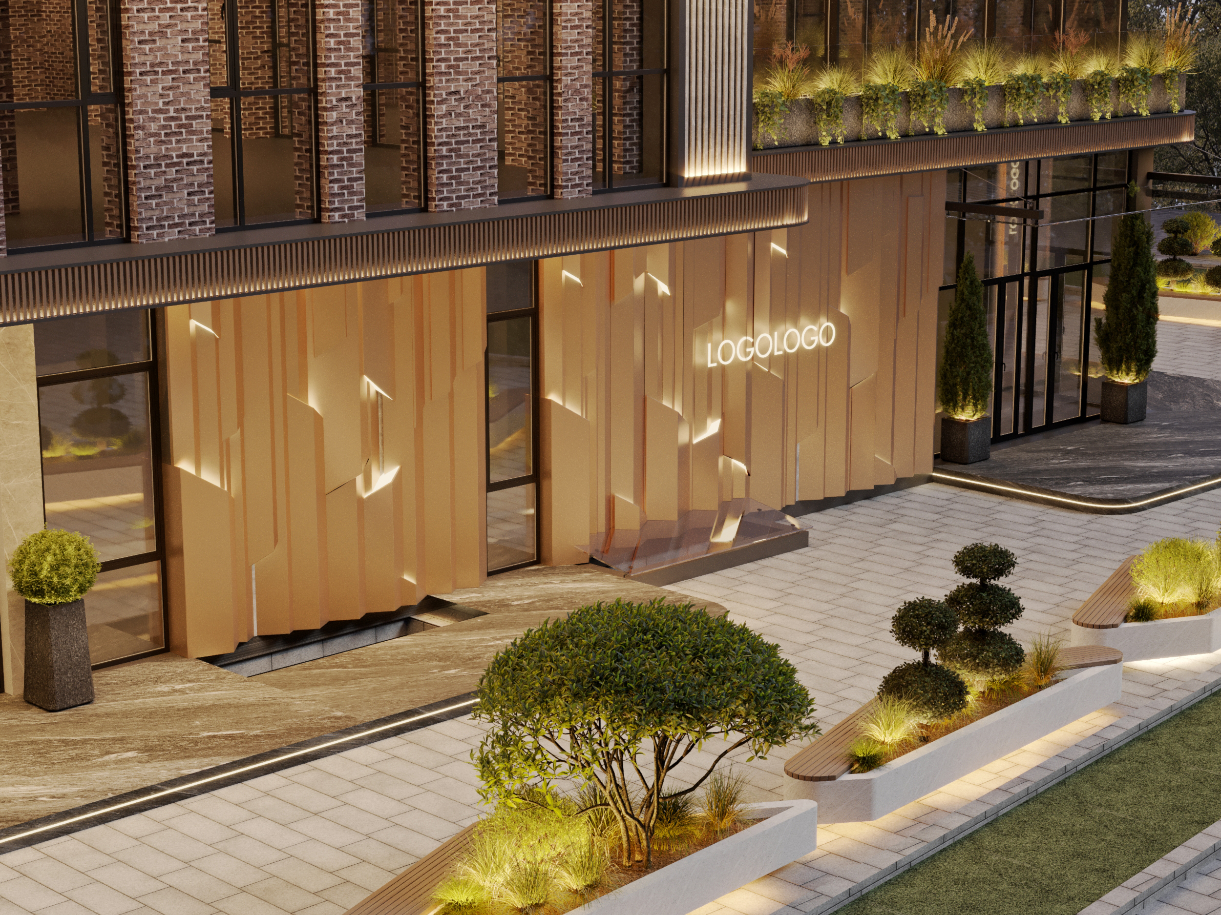 Входные группы обрамлены роскошными акцентными бронзовыми инсталляциями с мягкой подсветкой, и дополнены акцентной световой инсталляцией консольных вылетов в стиле старого голливуда. Строгие фасады обрамляют фризы плавных форм, отделанные ритмичными бронзовыми линиями, и дополненные теплыми подсветками.