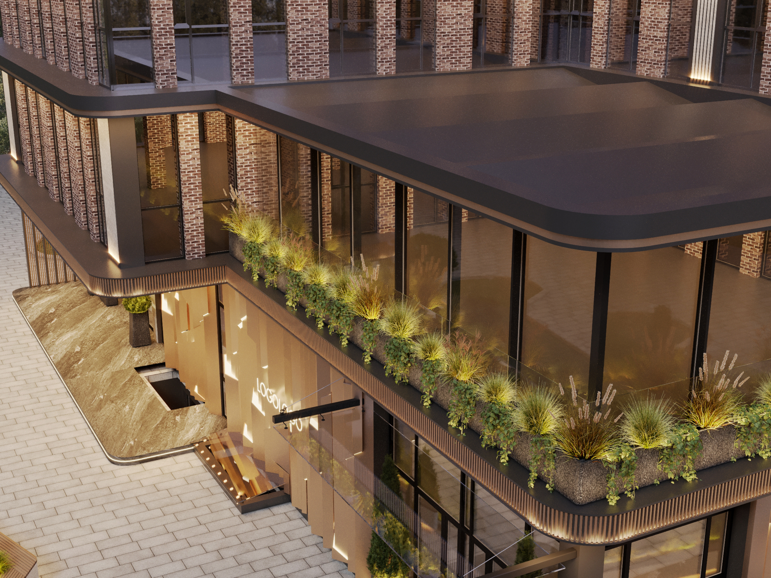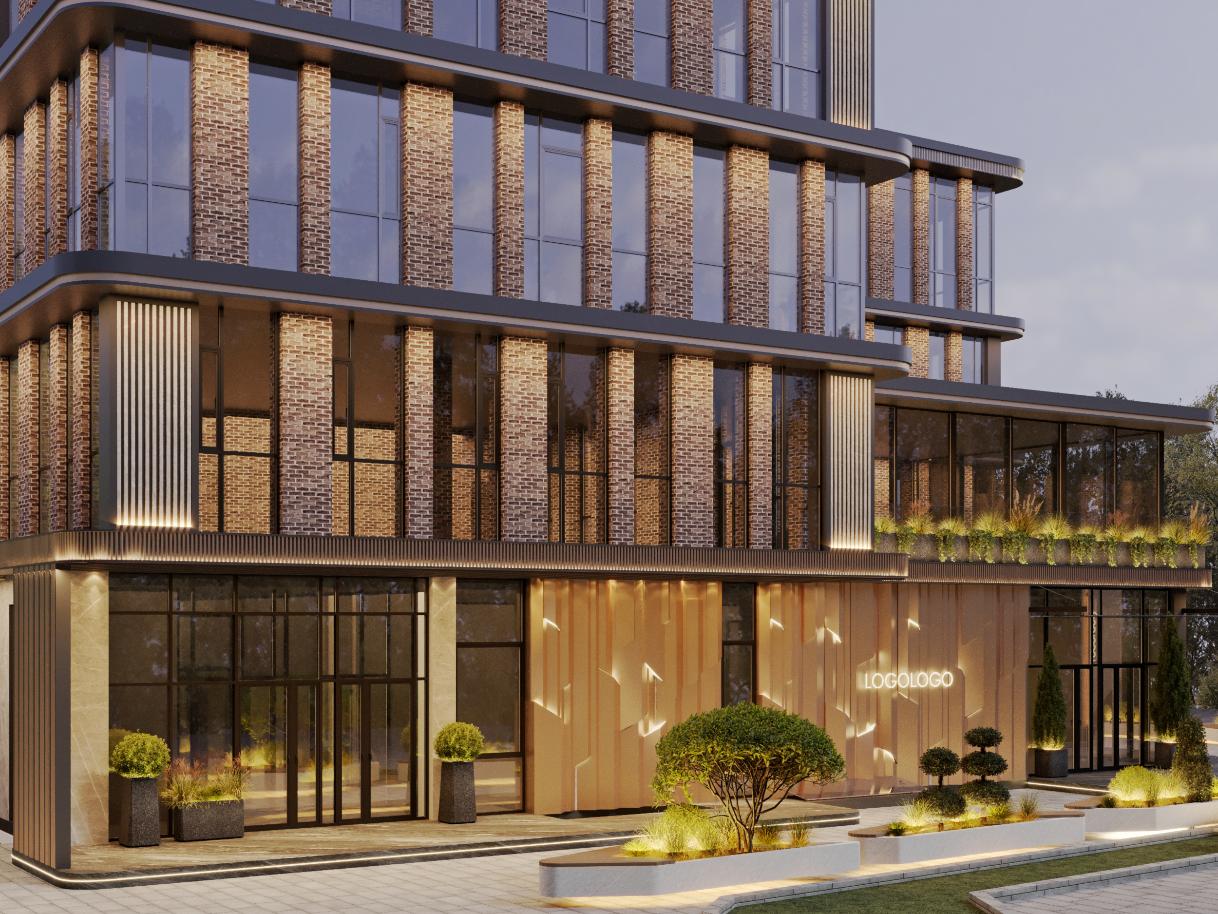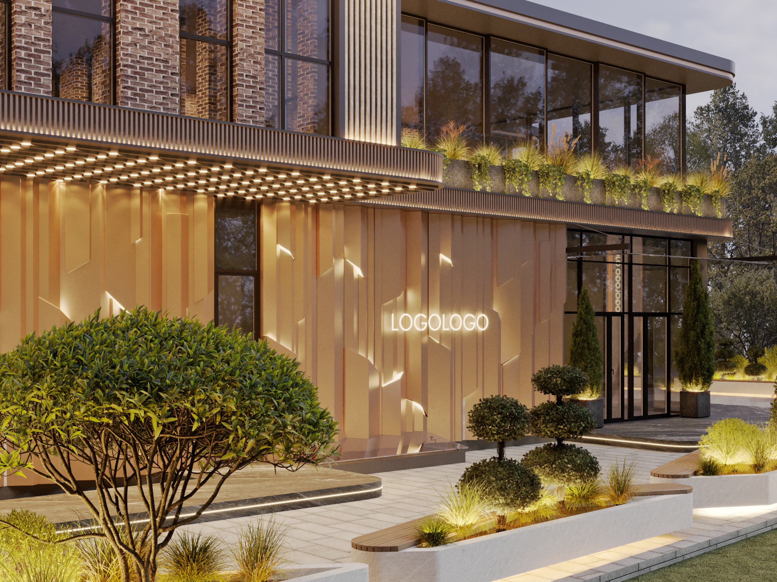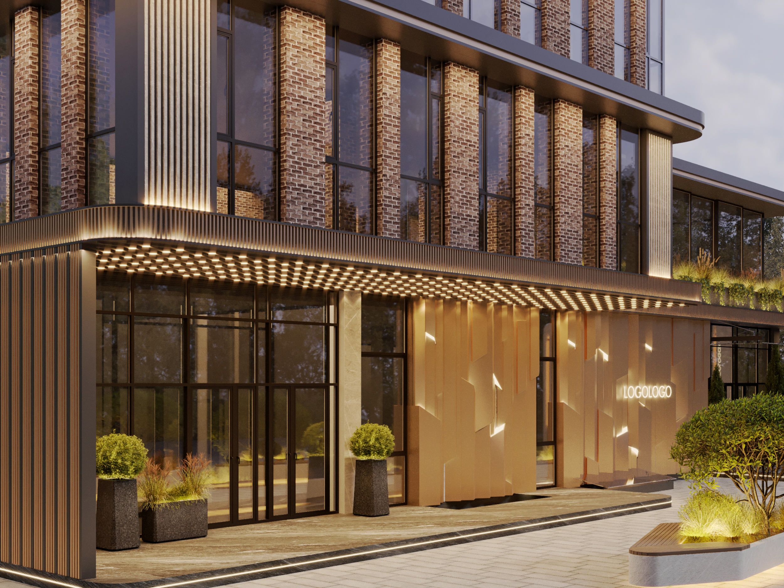 Входные группы обрамлены роскошными акцентными бронзовыми инсталляциями с мягкой подсветкой, и дополнены акцентной световой инсталляцией консольных вылетов в стиле старого голливуда. Строгие фасады обрамляют фризы плавных форм, отделанные ритмичными бронзовыми линиями, и дополненные теплыми подсветками.