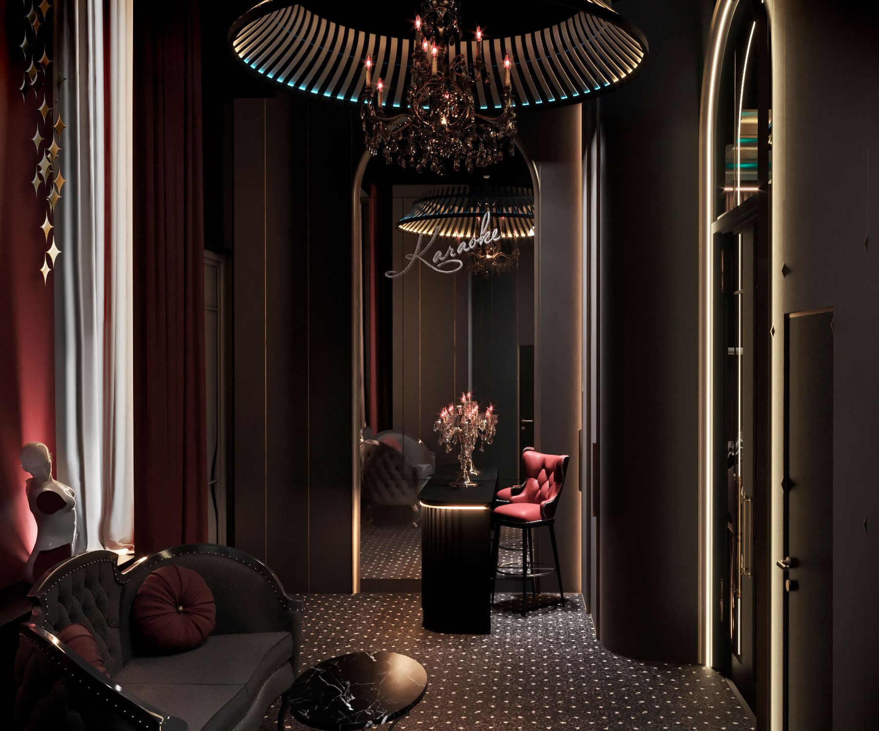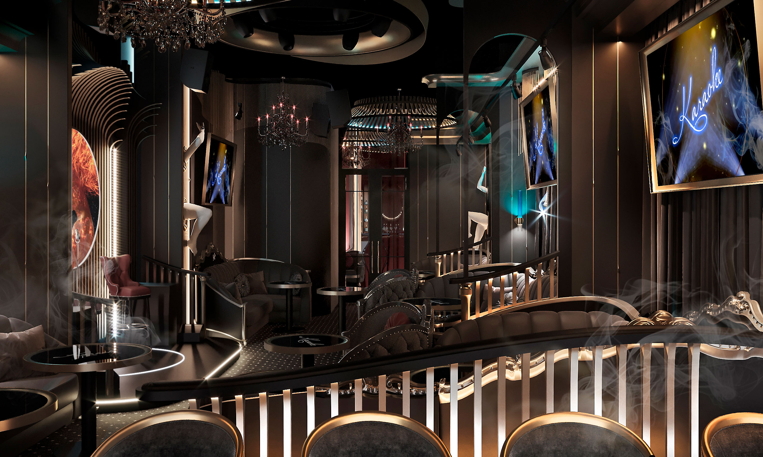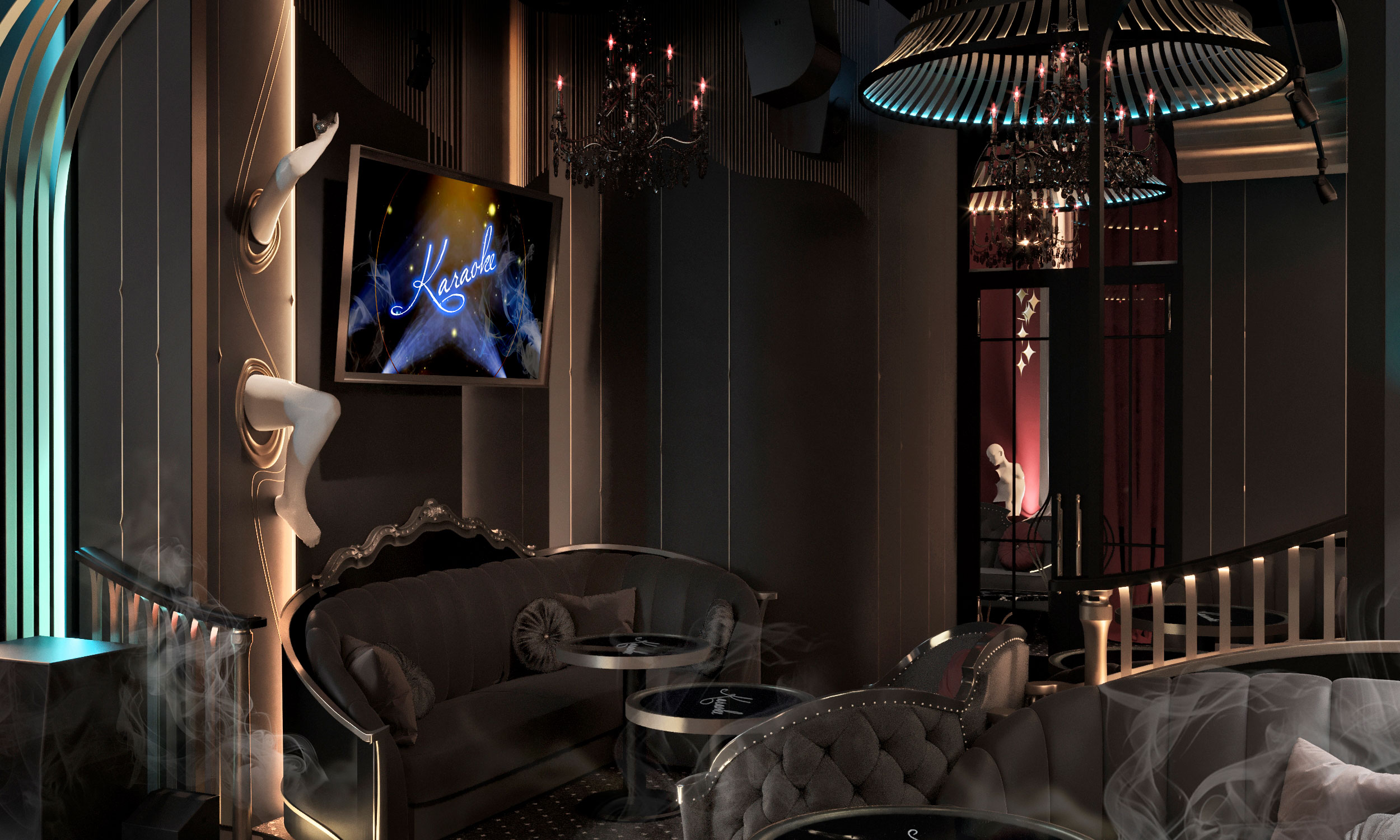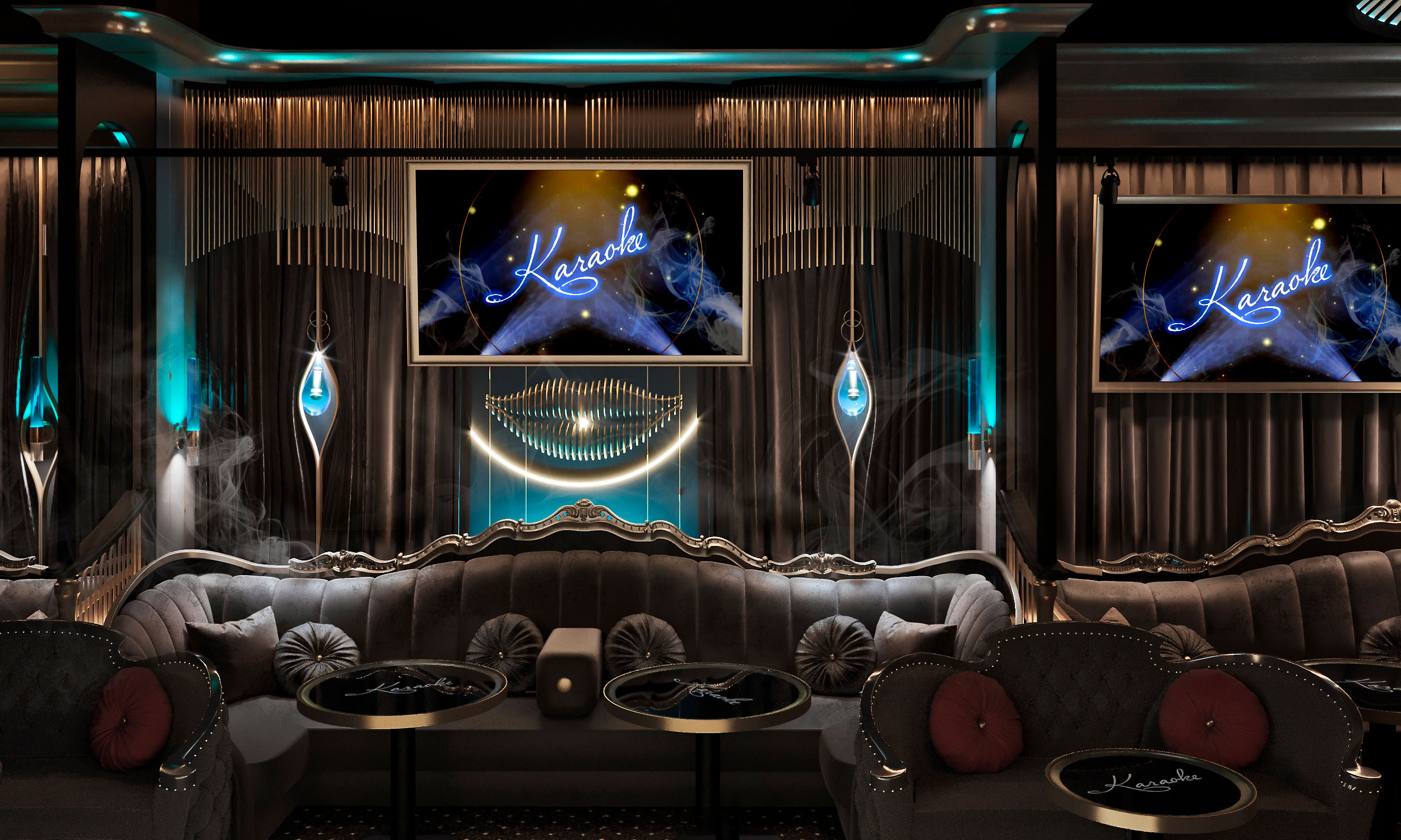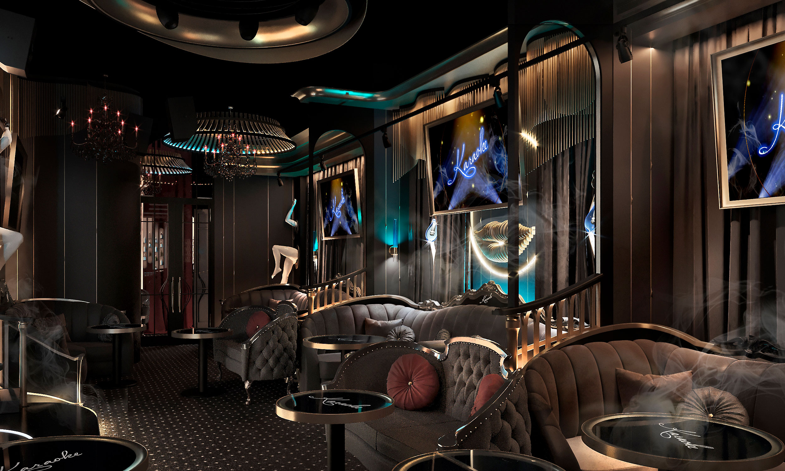 Тонкие изящные линии отделки, мягкий текстиль и фигурная лепнина поддерживают игривость и кураж в концепции караоке-клуба.