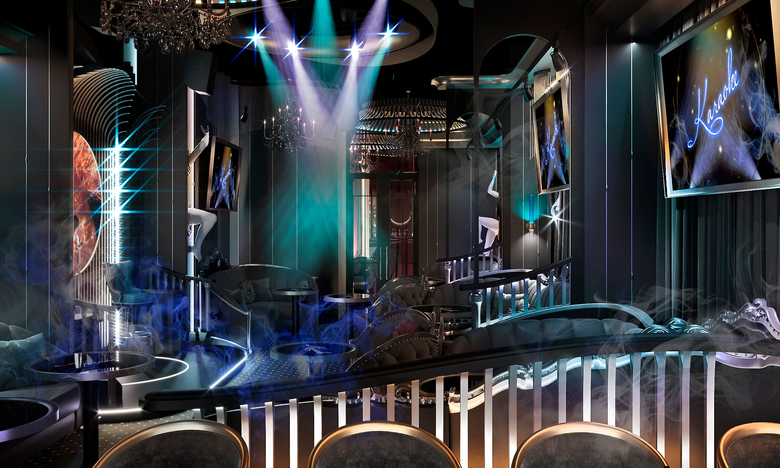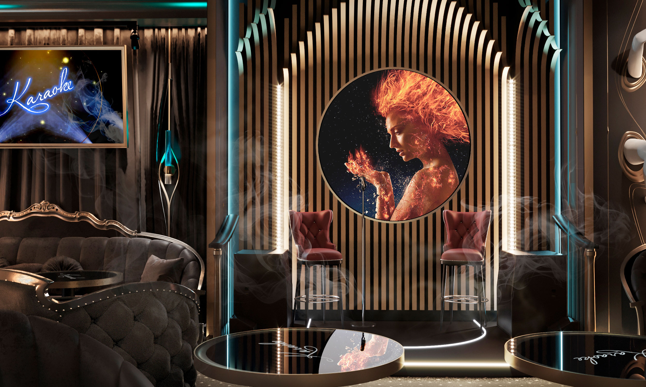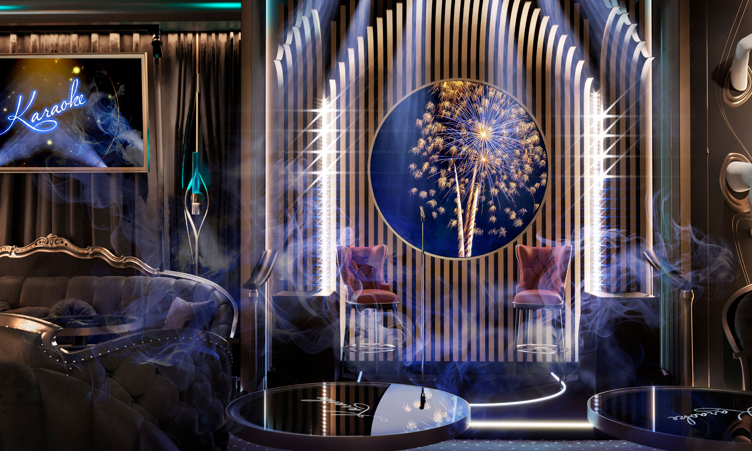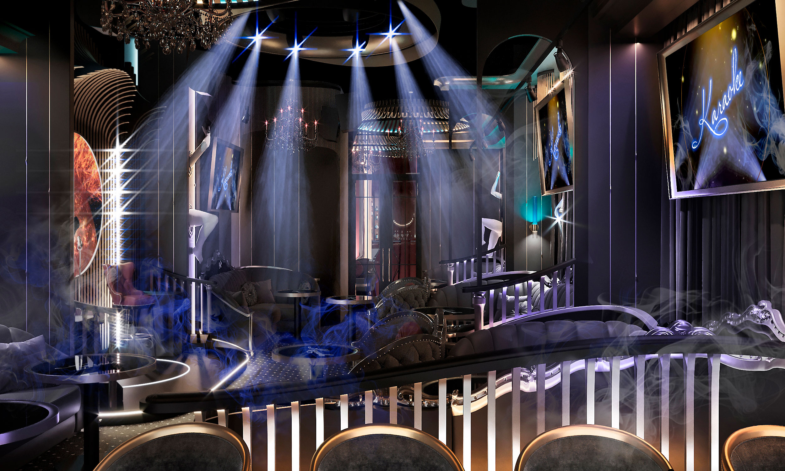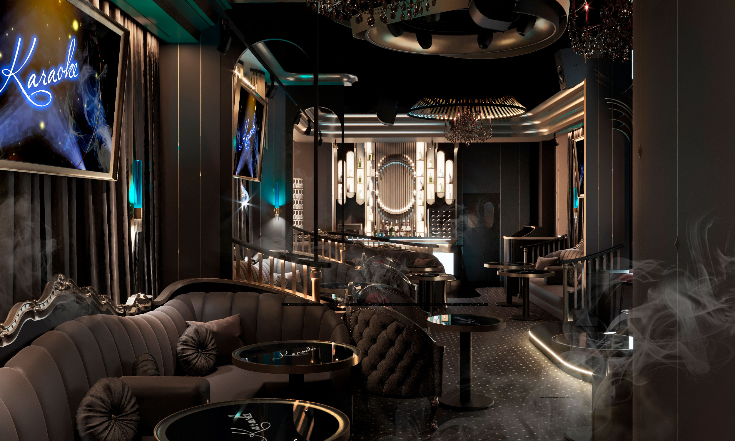 Тонкие изящные линии отделки, мягкий текстиль и фигурная лепнина поддерживают игривость и кураж в концепции караоке-клуба.