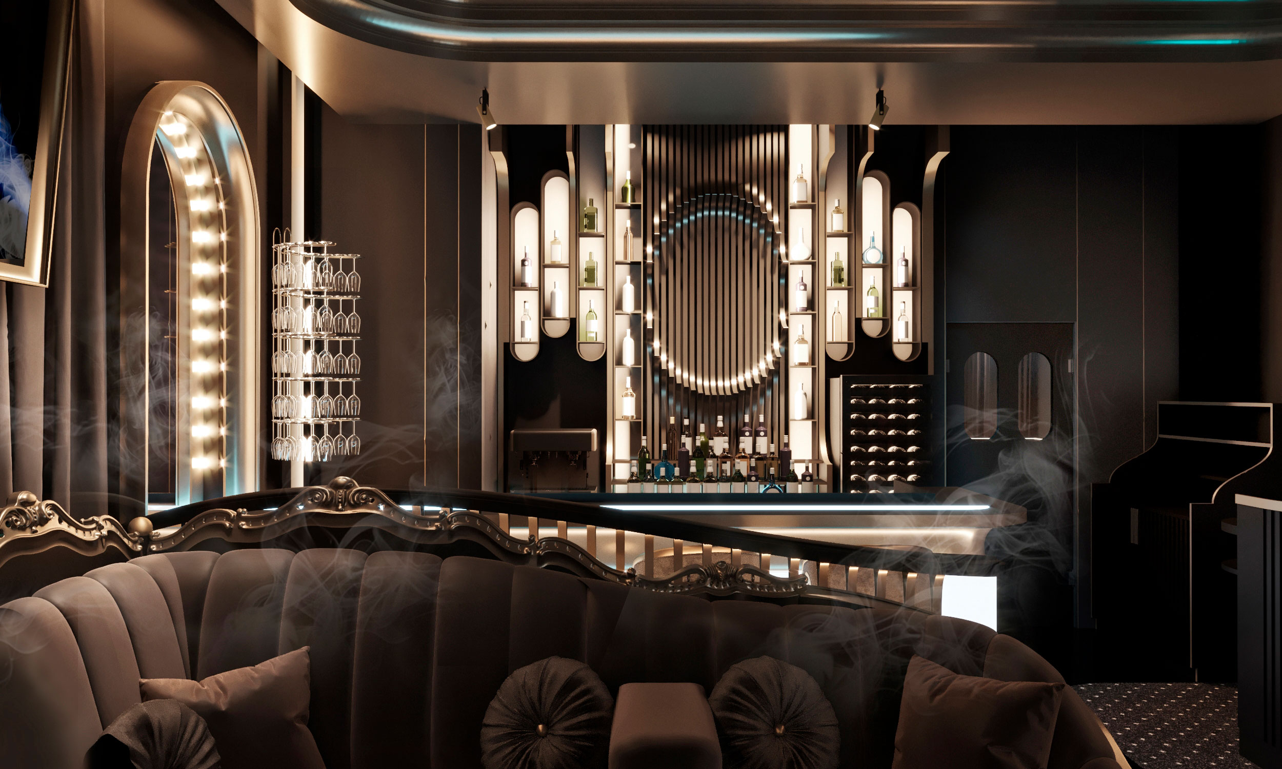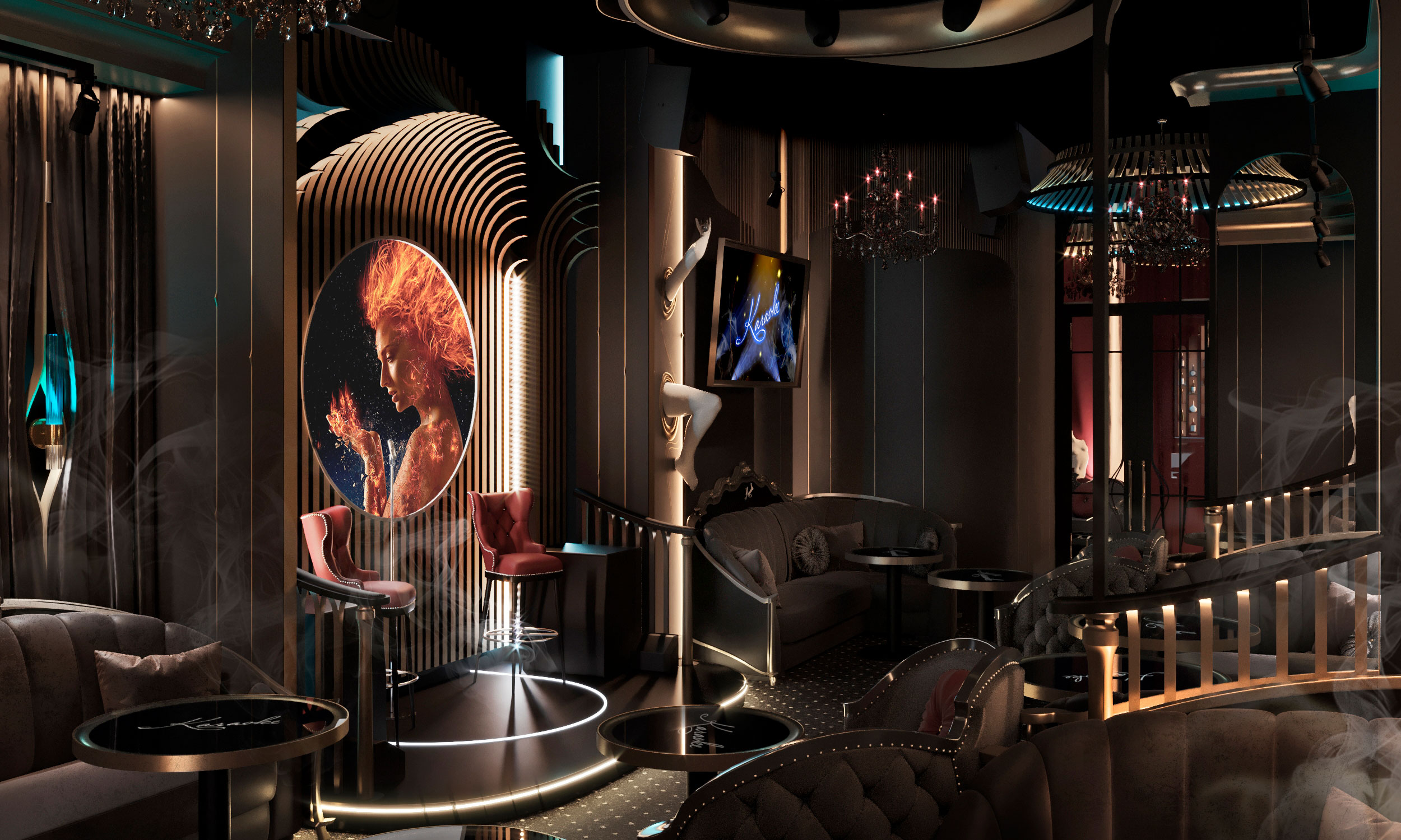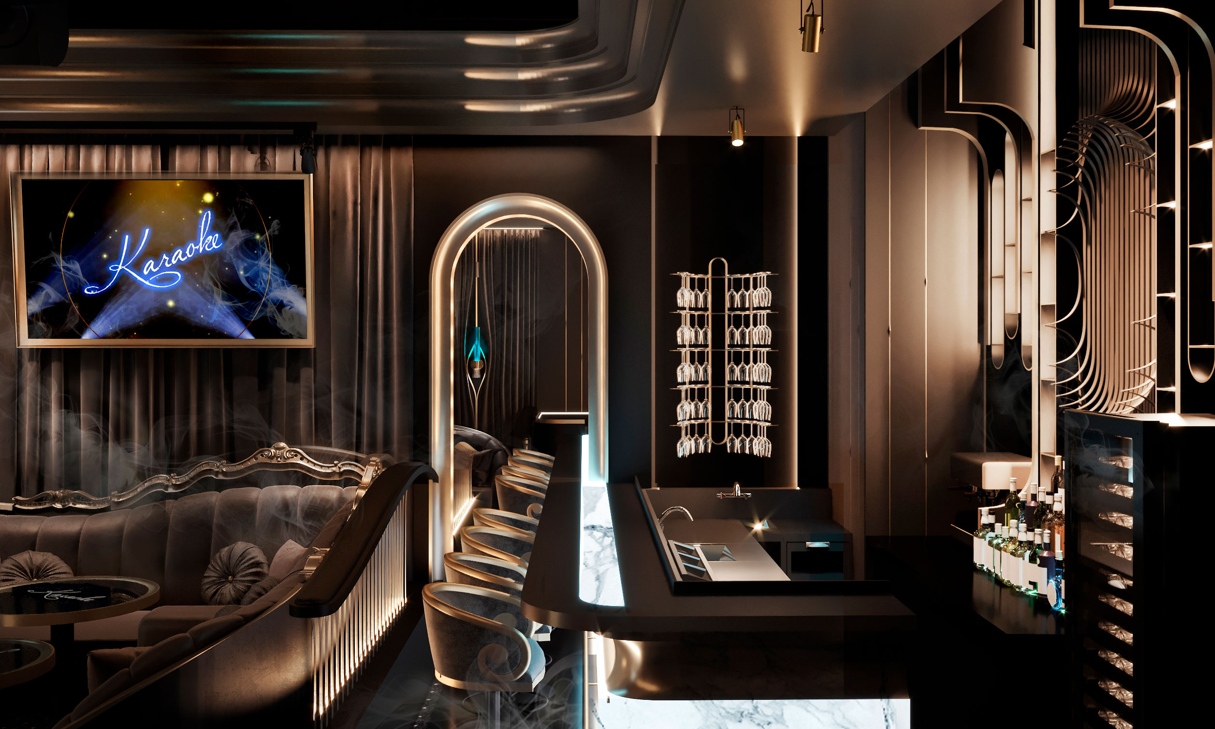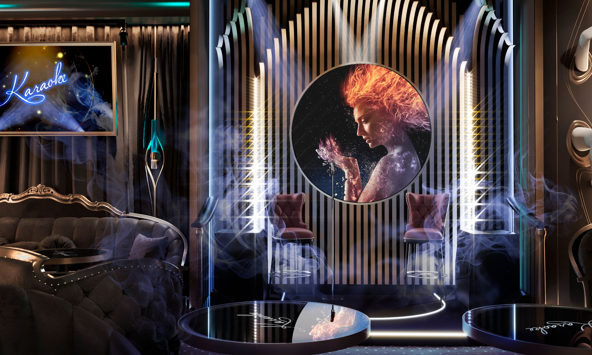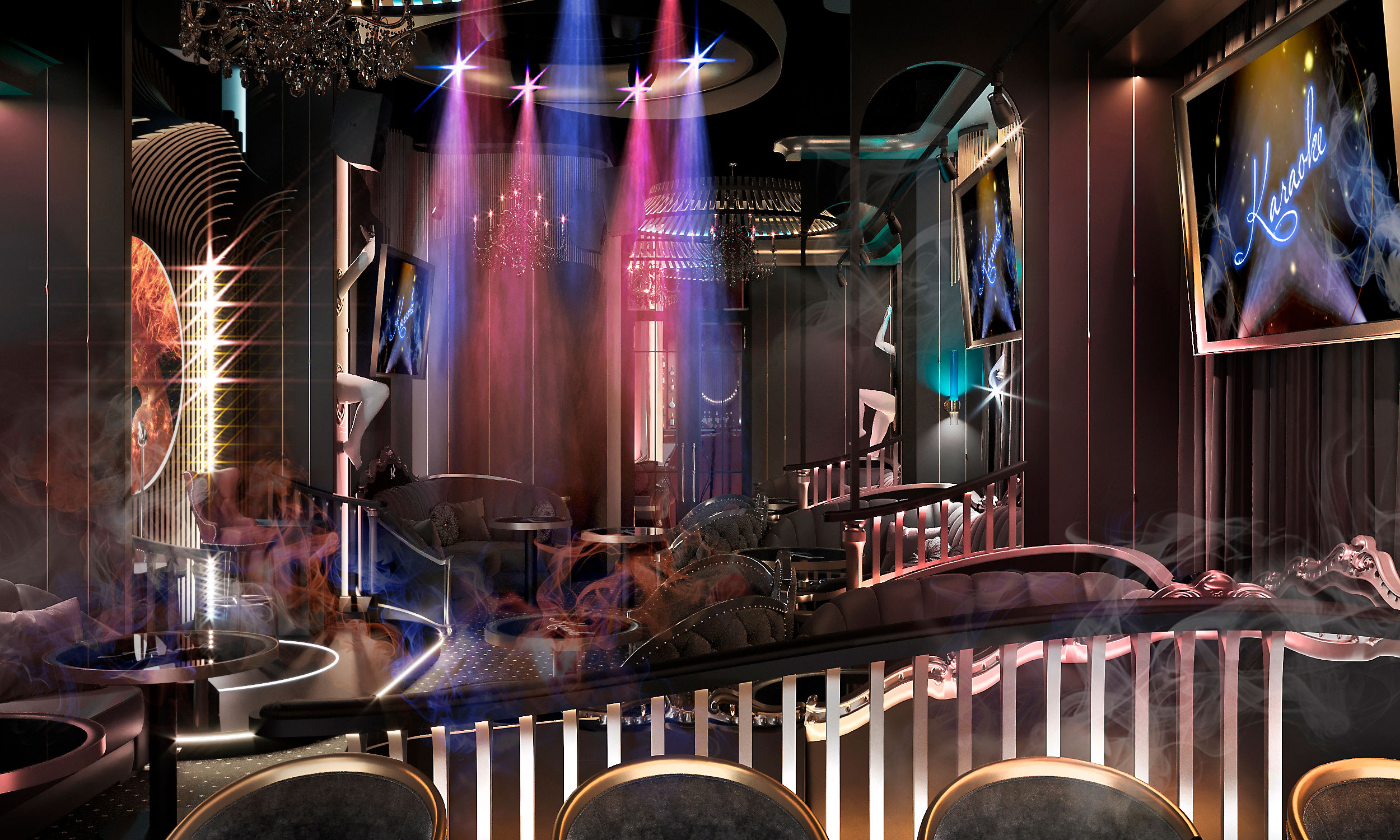 Тонкие изящные линии отделки, мягкий текстиль и фигурная лепнина поддерживают игривость и кураж в концепции караоке-клуба.