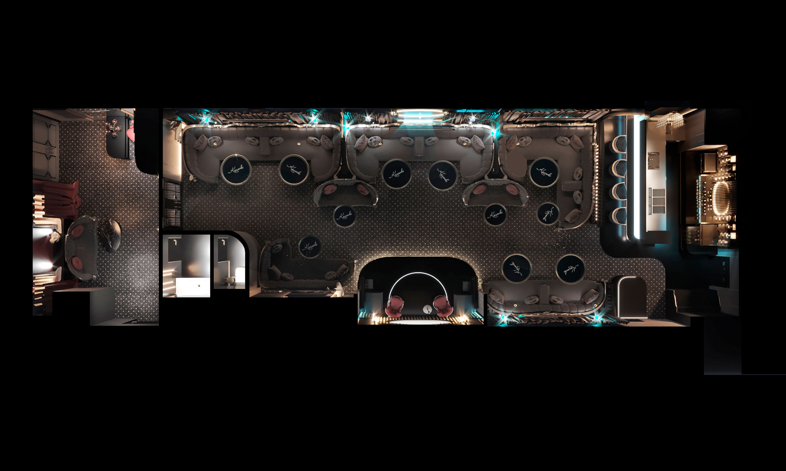 Клиентский зал акцентирован авторской сценой, которая является сердцем заведения. Декоративные вертикальные элементы сцены, круглый экран в сочетании с программируемой подсветкой выделяют подиум как место для основного сценического светового шоу.