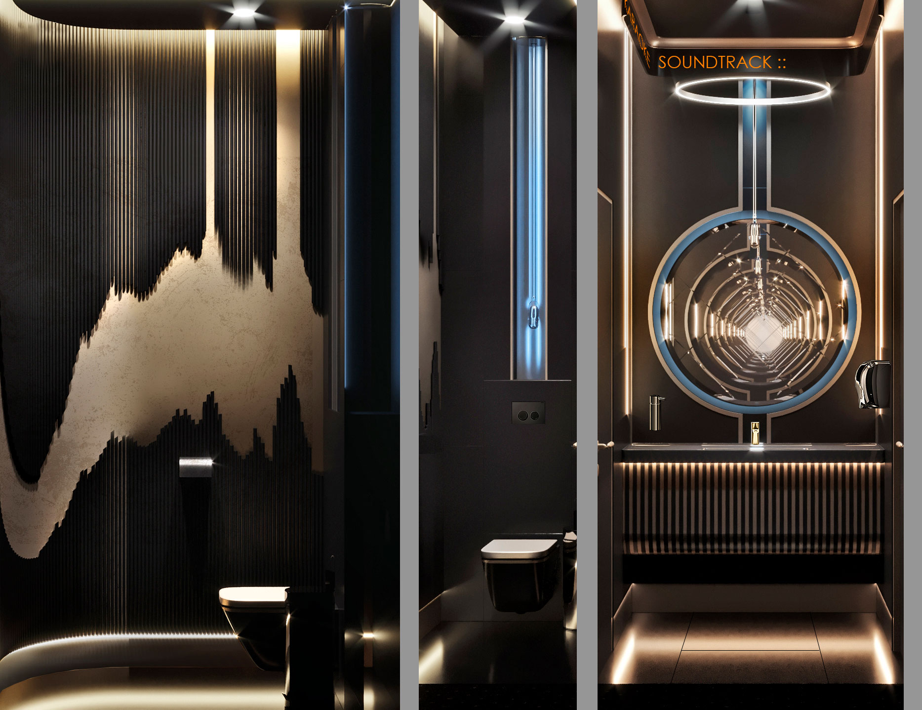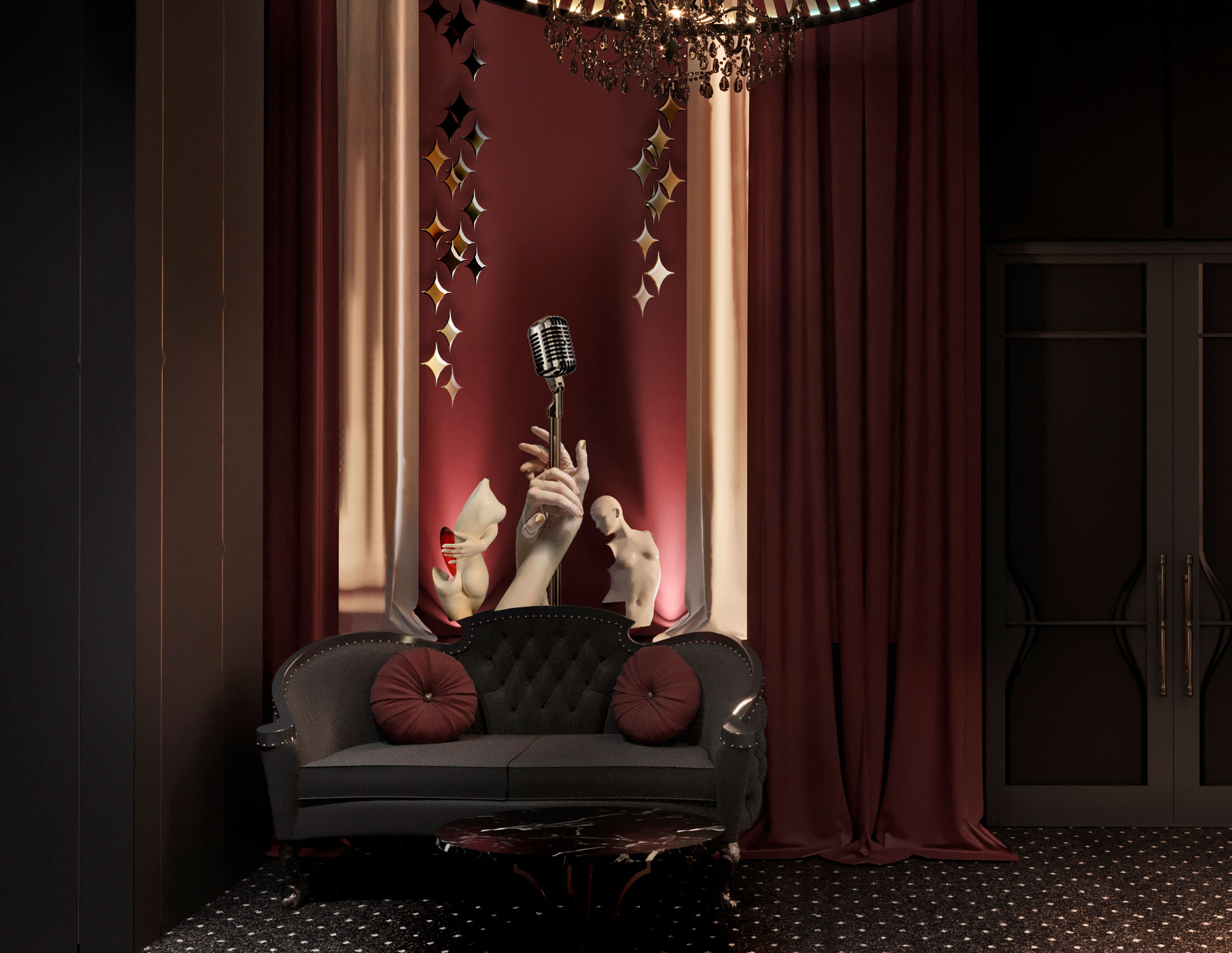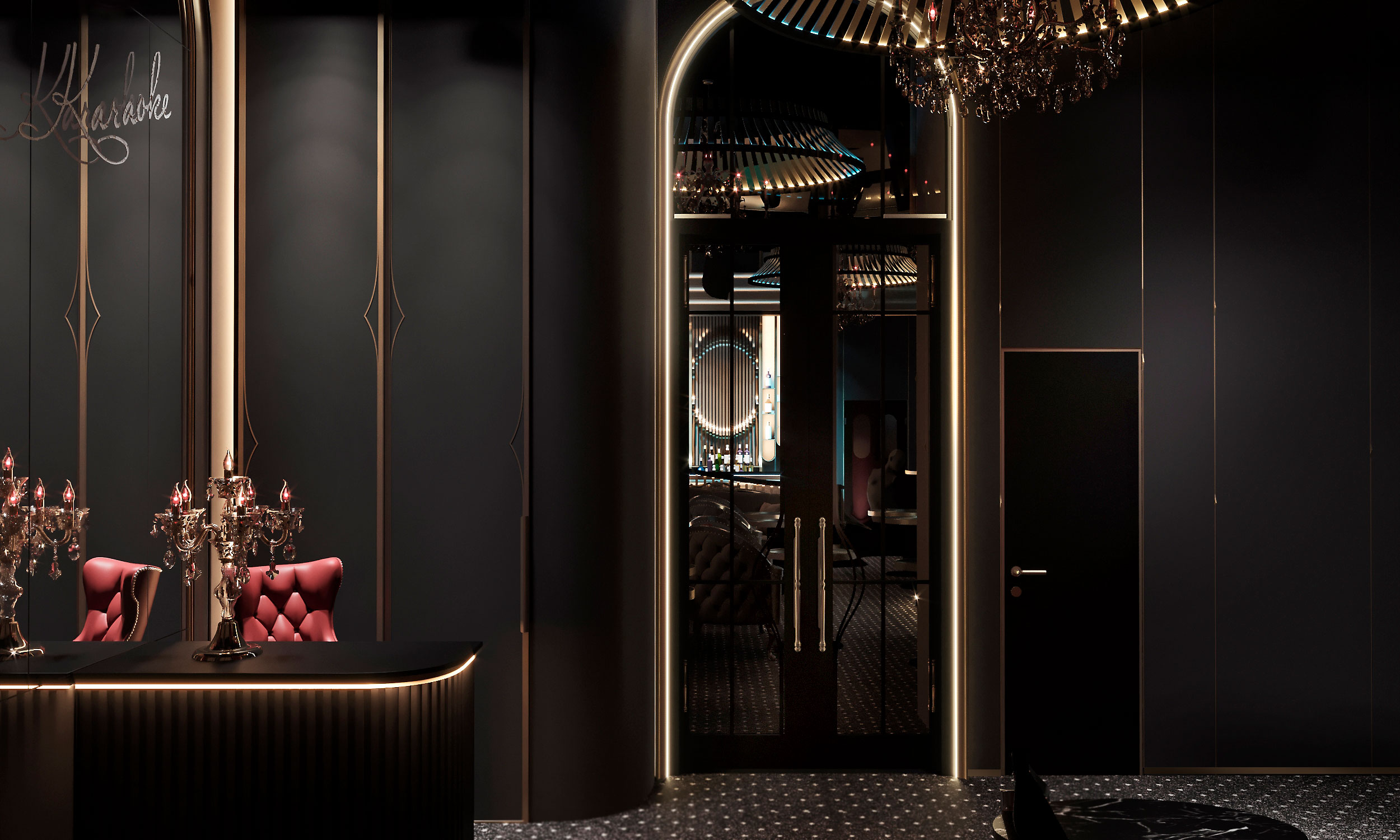 Команда GREEN STUDIO разработала концепцию караоке-клуба, которая несет в себе идею притягательной утонченной роскоши в сочетании со сценической игрой, символизирующей голос.