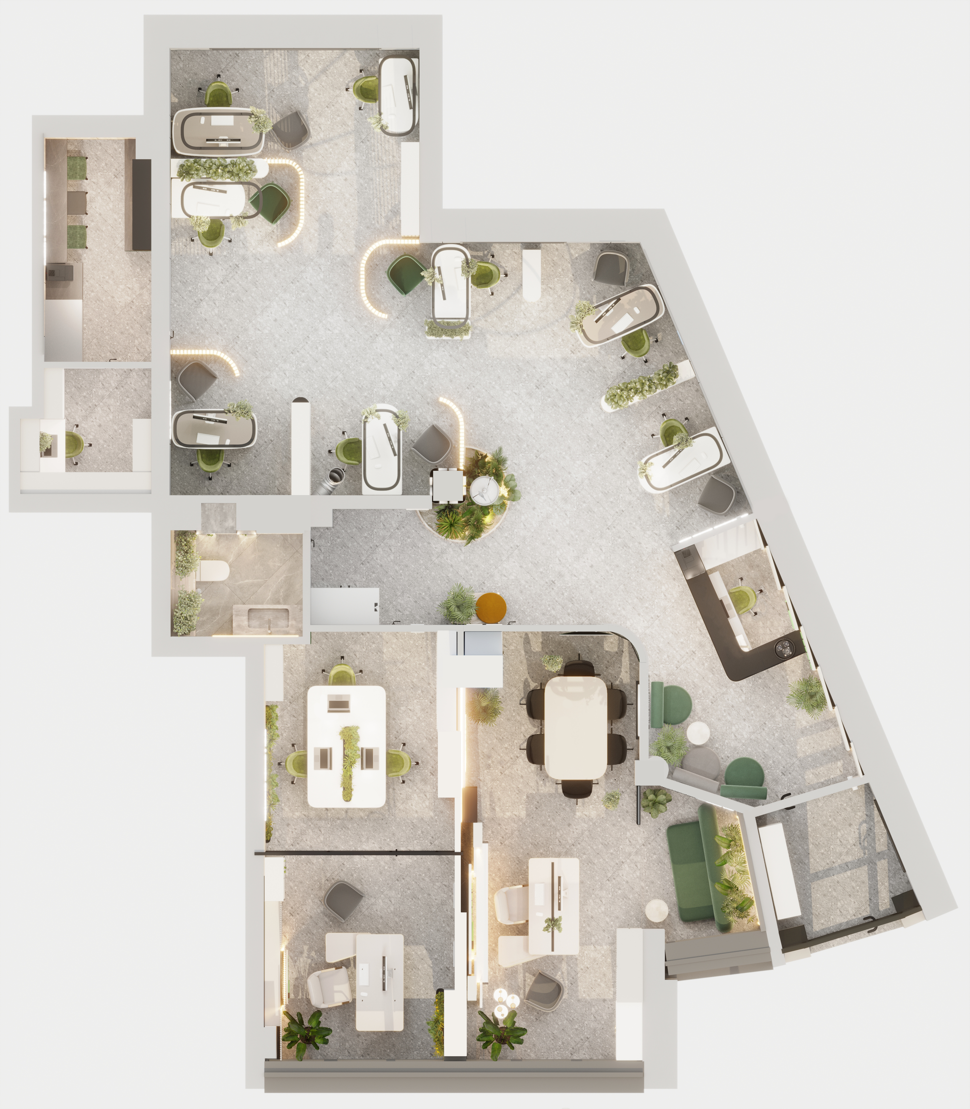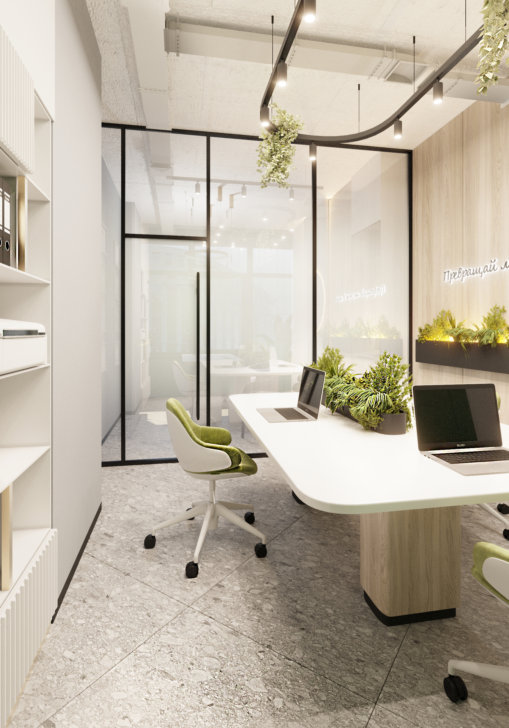 Ярким и притягательным приемом являются атмосферно зонированные рабочие места по принципу открытых капсул, которые добавляют комфорт сотрудникам и клиентам.