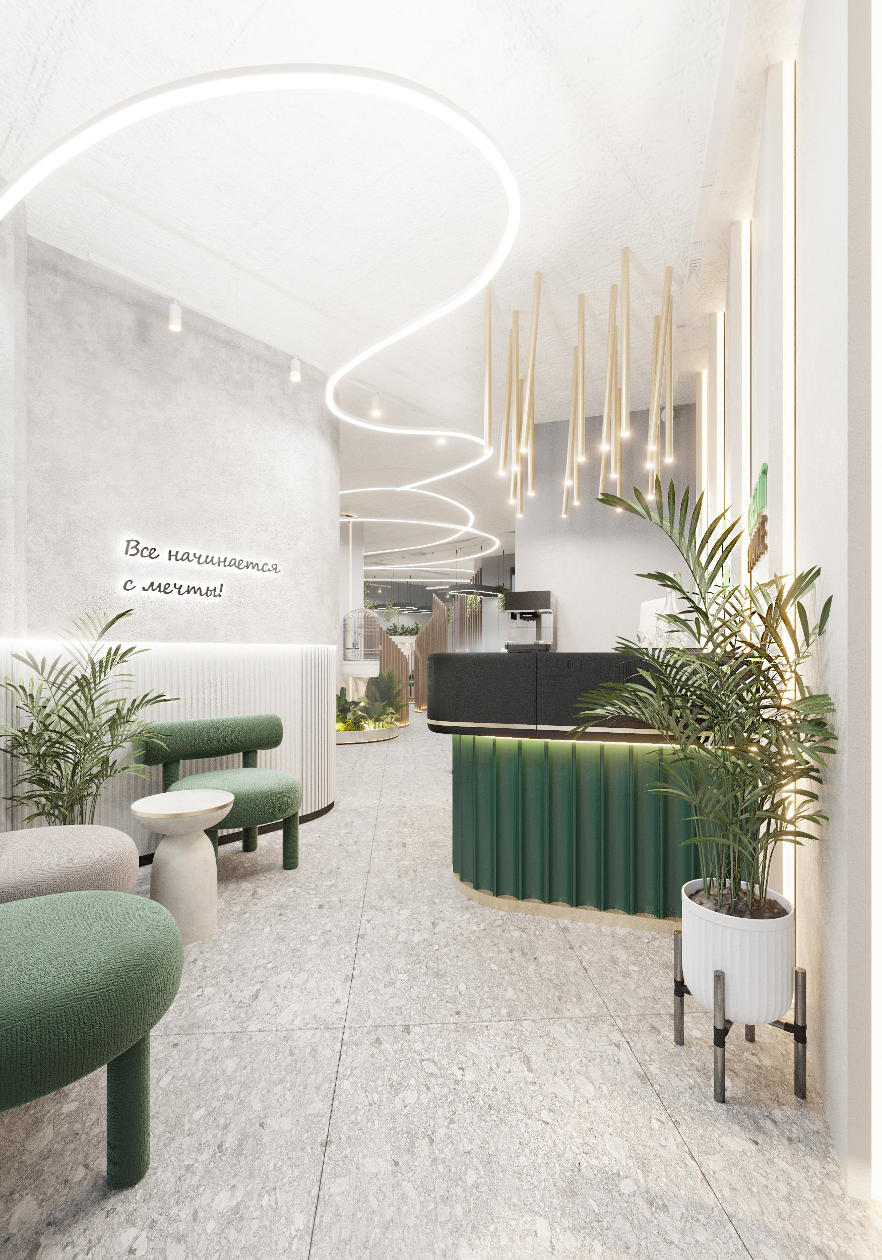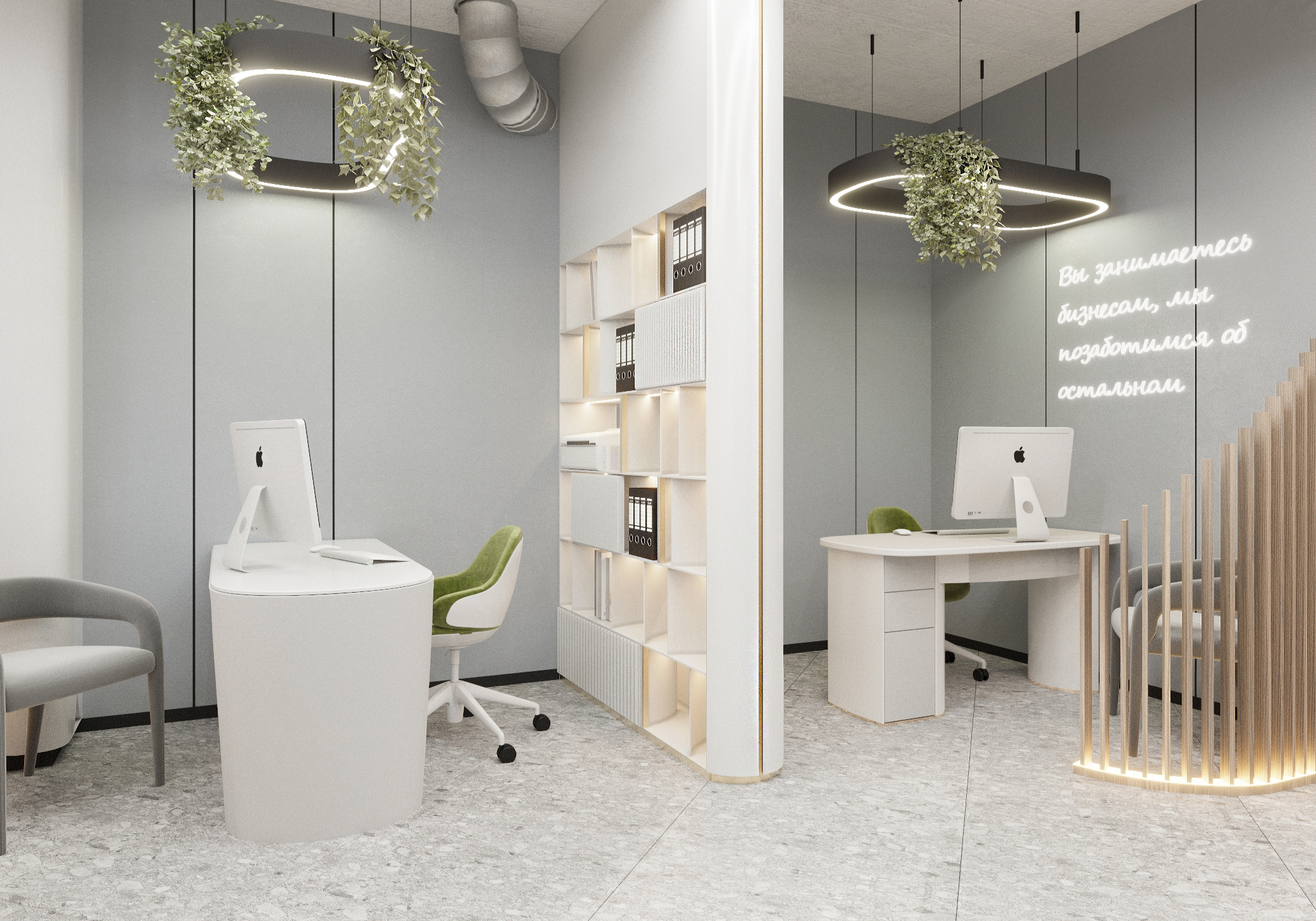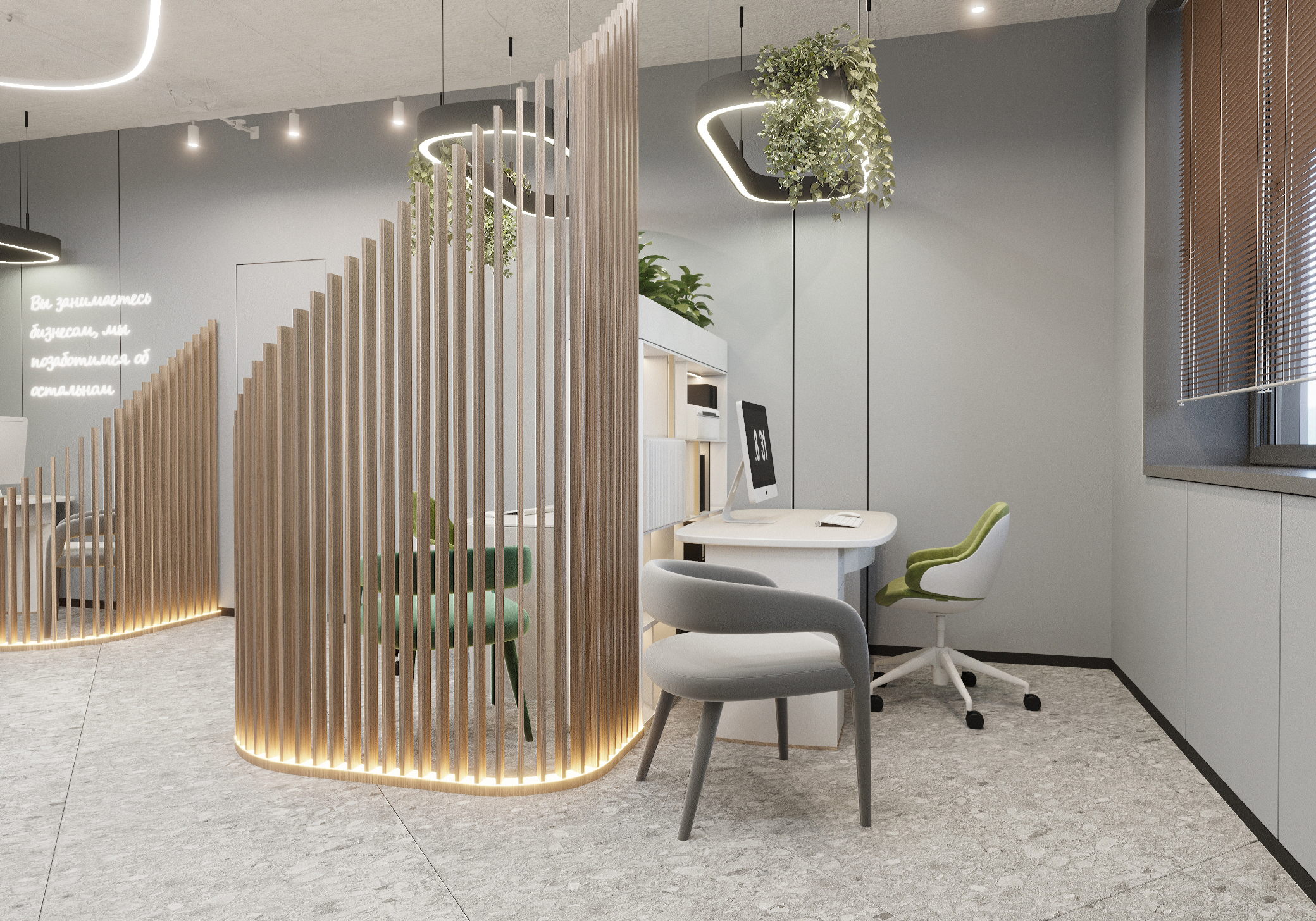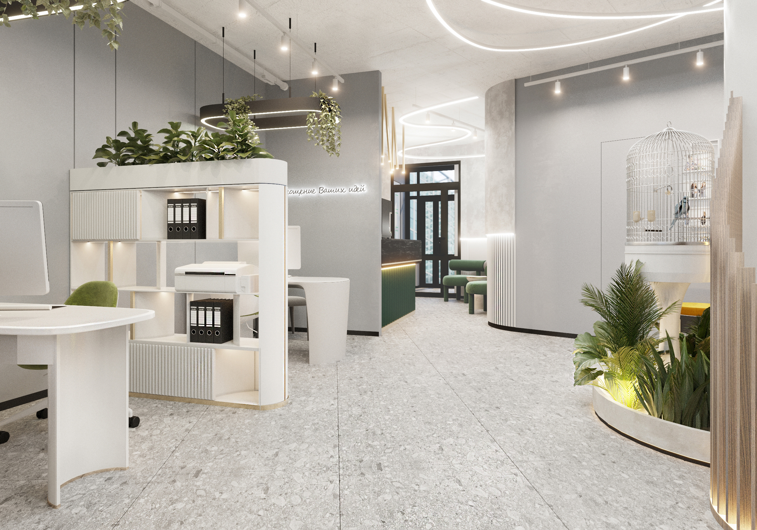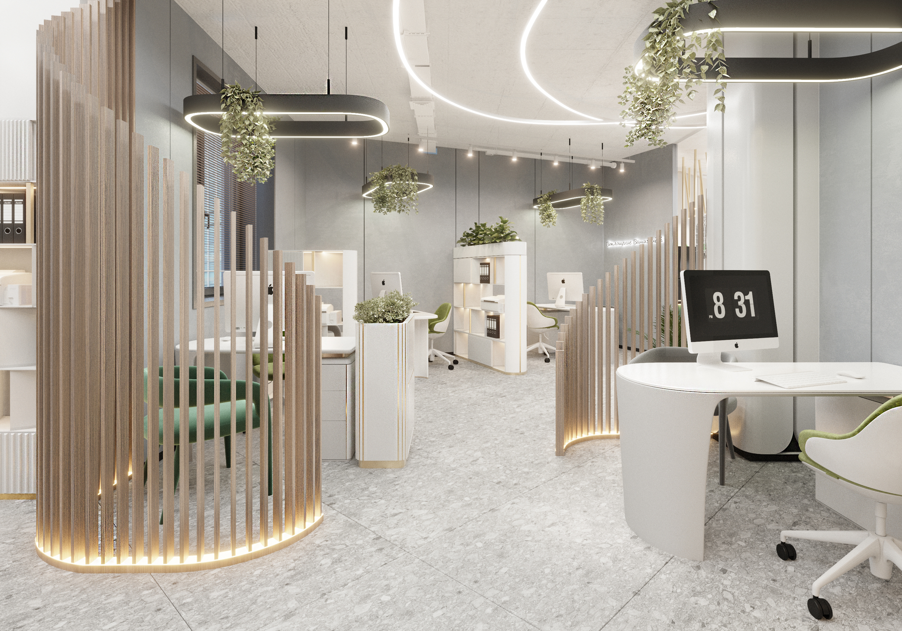 Дизайн-концепция офиса читается в светлом и динамичном интерьере, плавных линиях, ярких акцентах и парящих световых приемах.Светлая входная группа и зона ресепшн с эффектно представленным в интерьере брендом, визуально расскажет своим клиентам о философии и преимуществах компании.