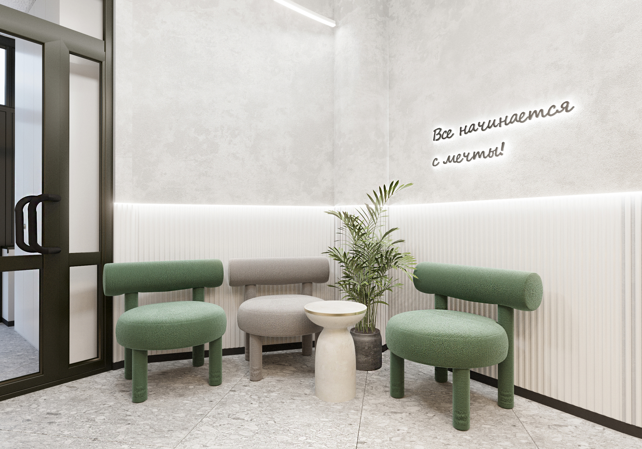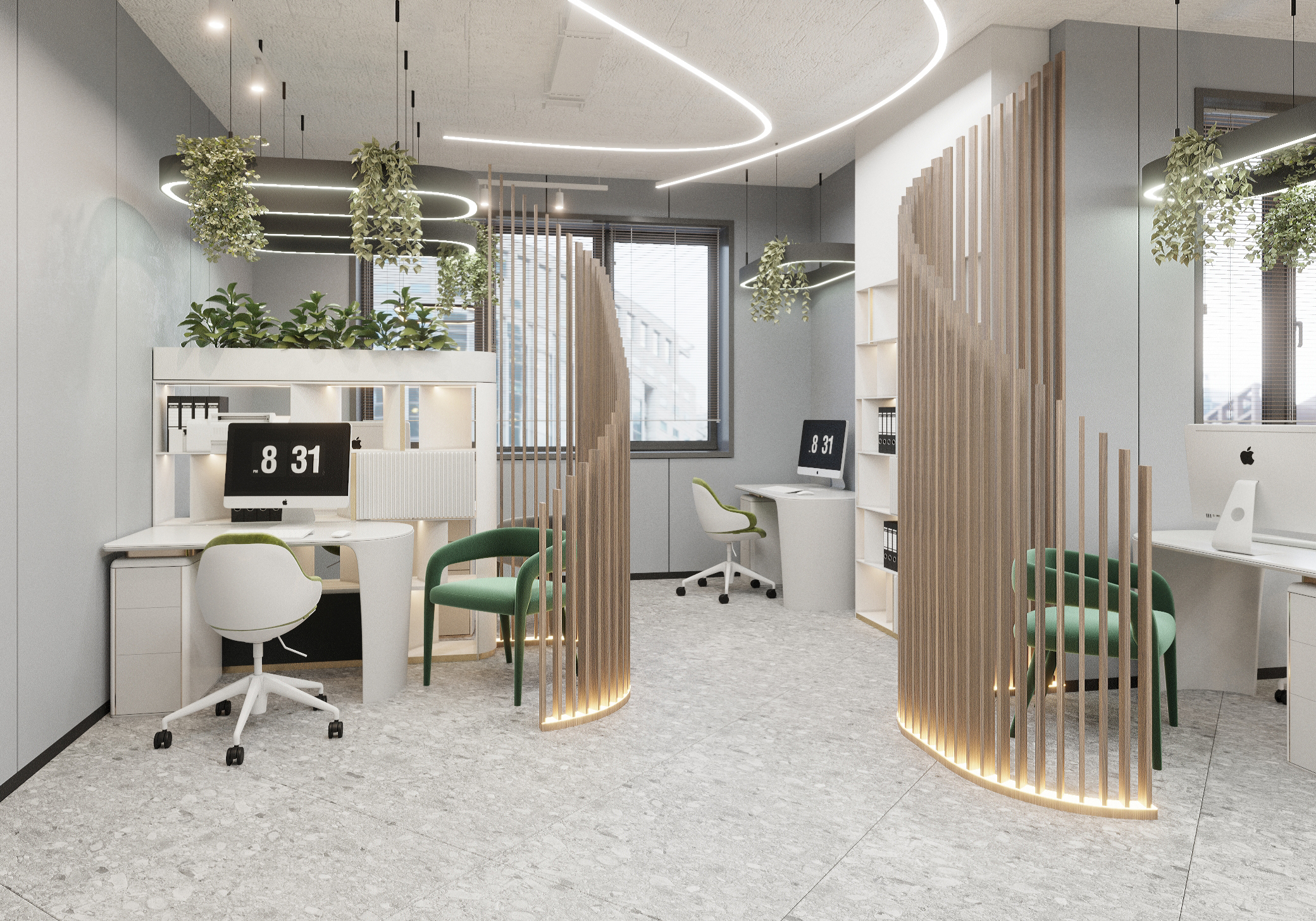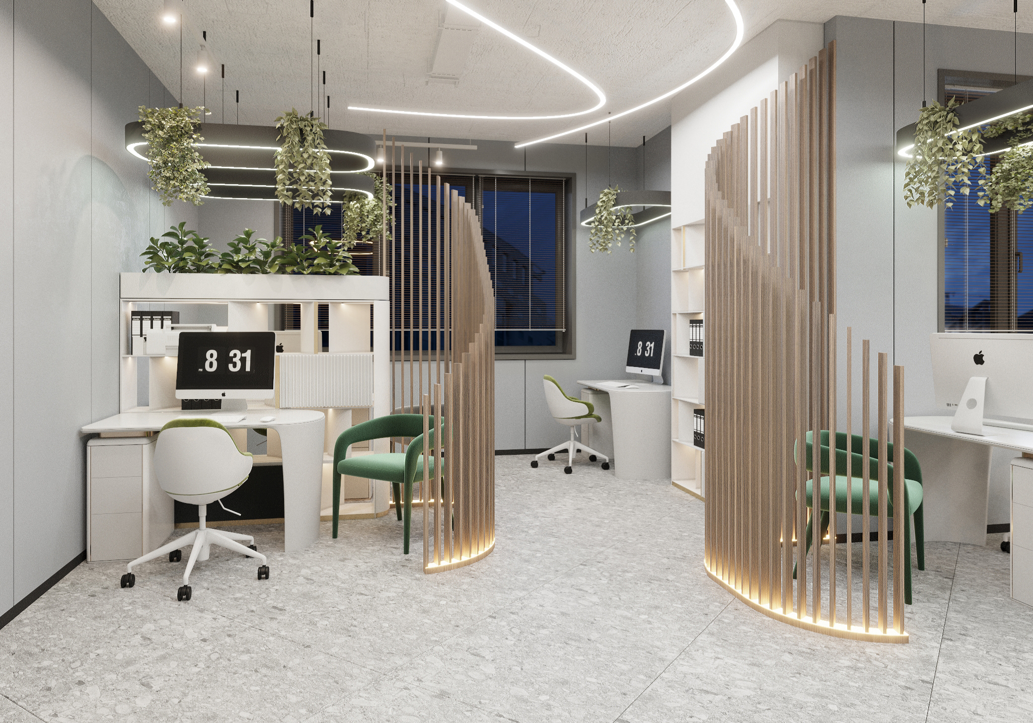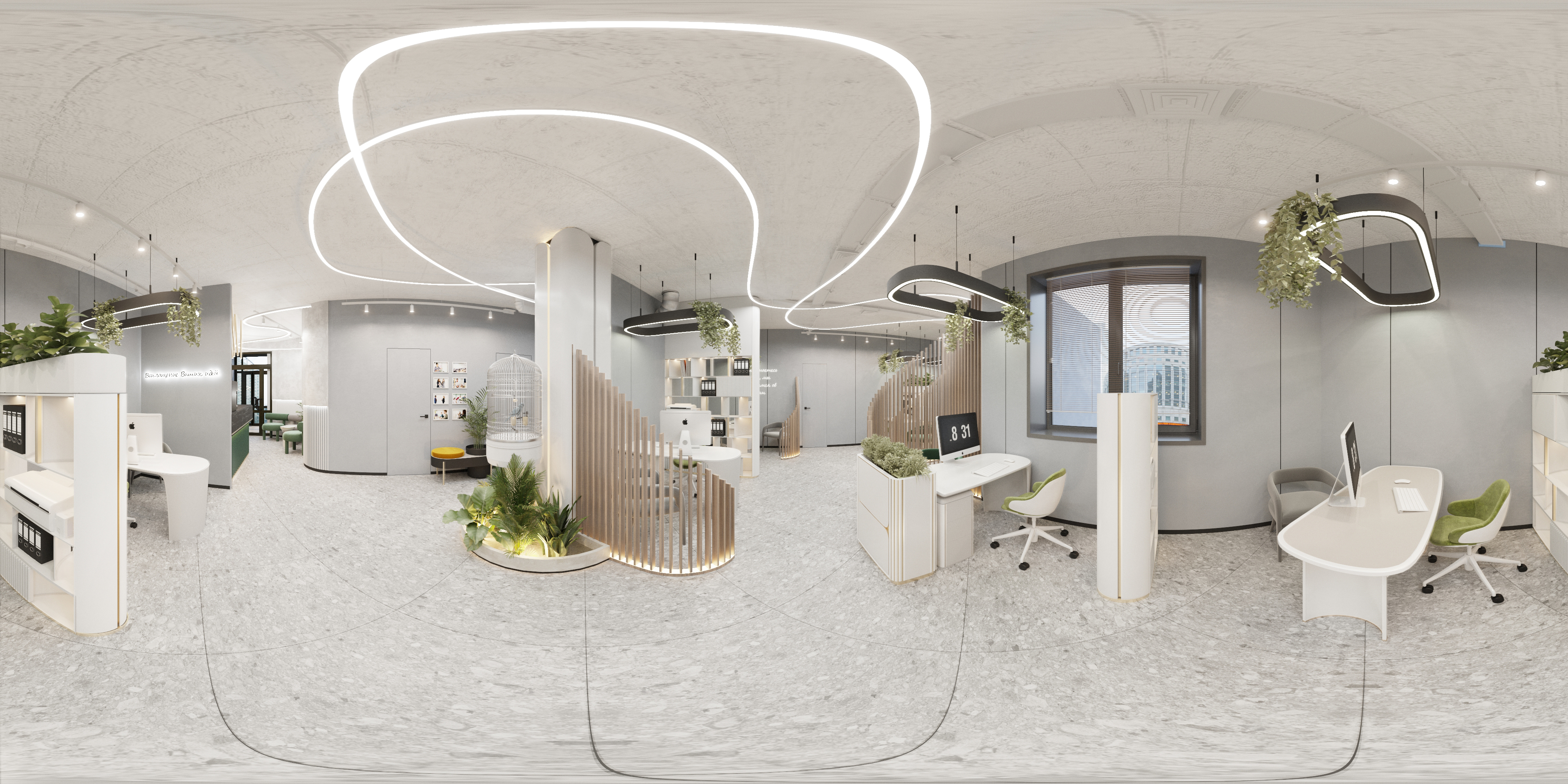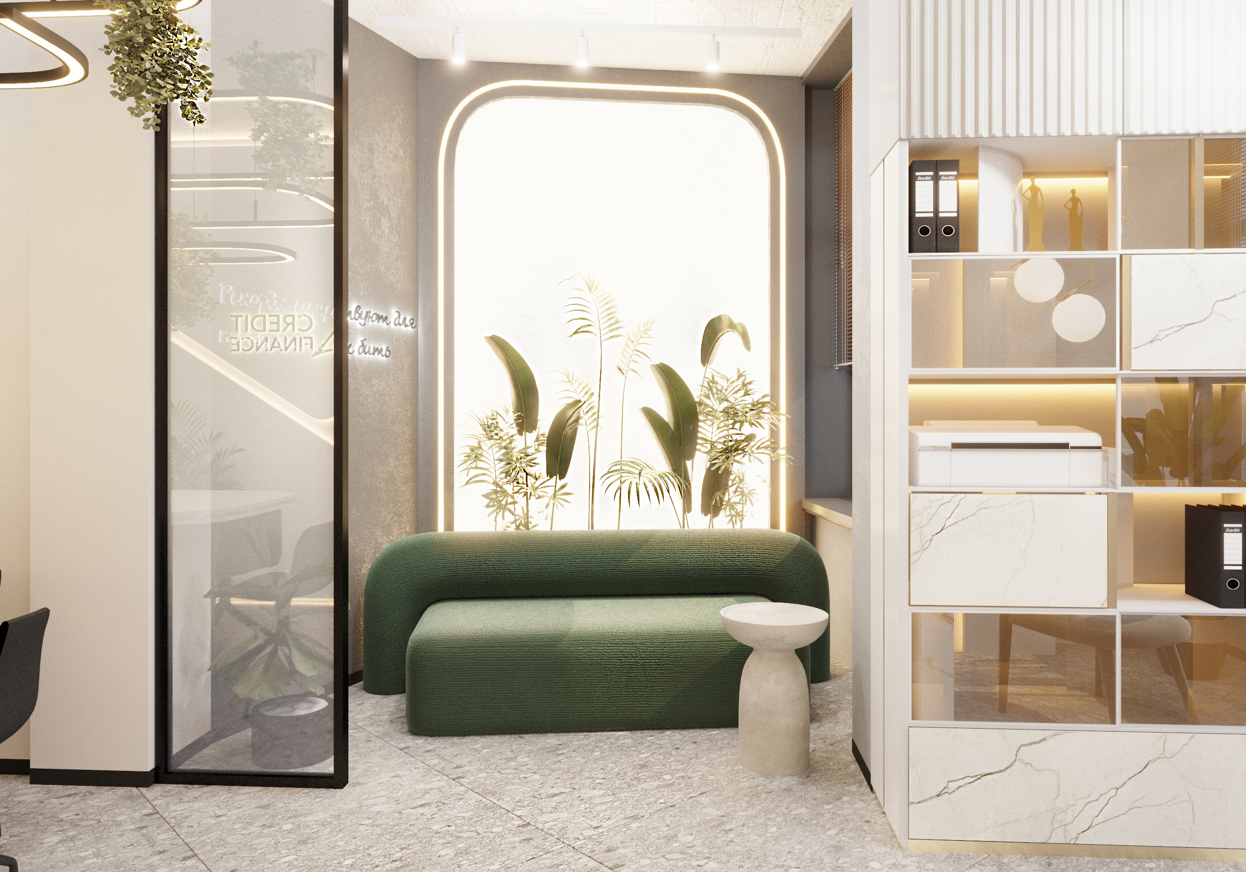 Дизайн-концепция офиса читается в светлом и динамичном интерьере, плавных линиях, ярких акцентах и парящих световых приемах.Светлая входная группа и зона ресепшн с эффектно представленным в интерьере брендом, визуально расскажет своим клиентам о философии и преимуществах компании.