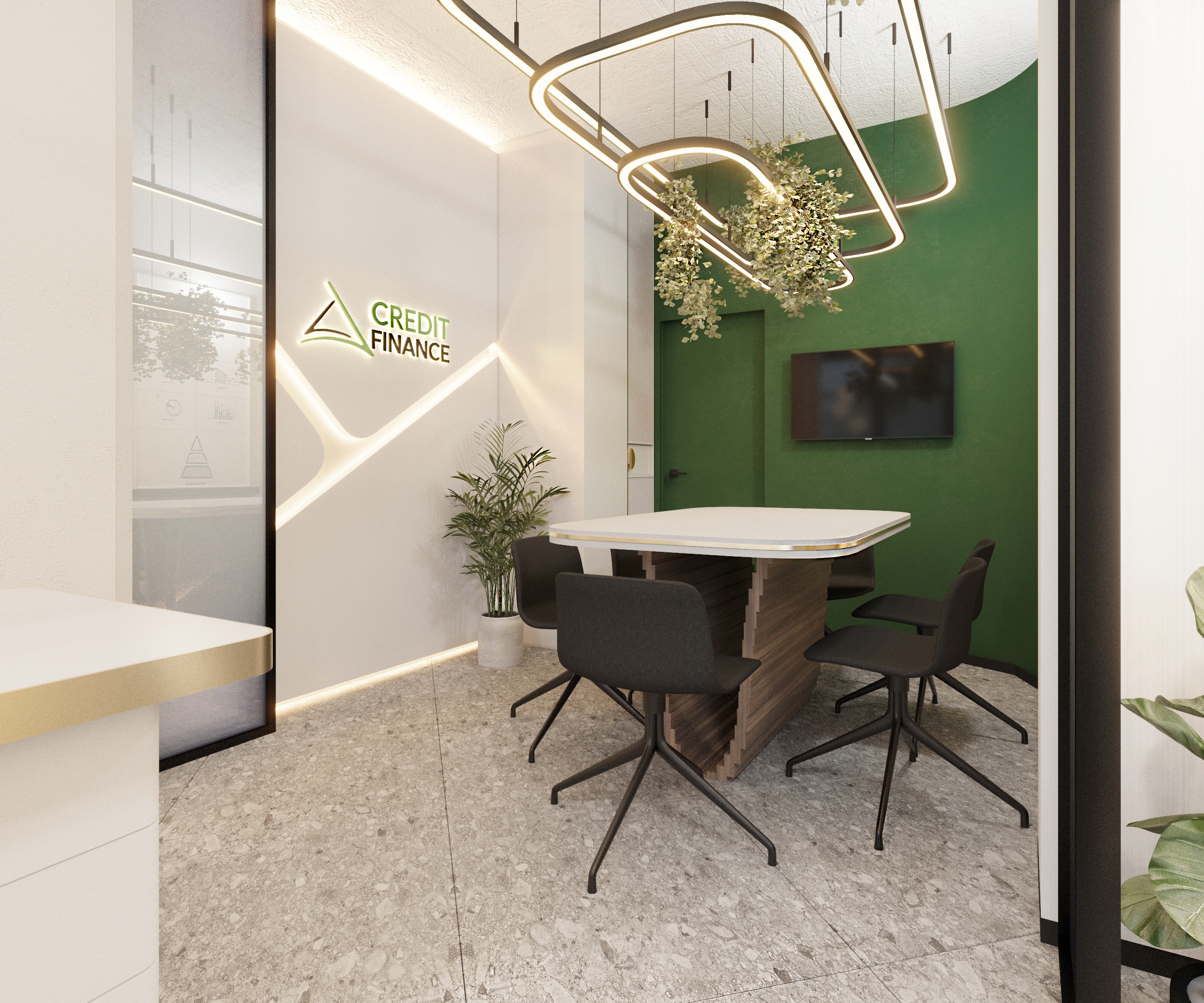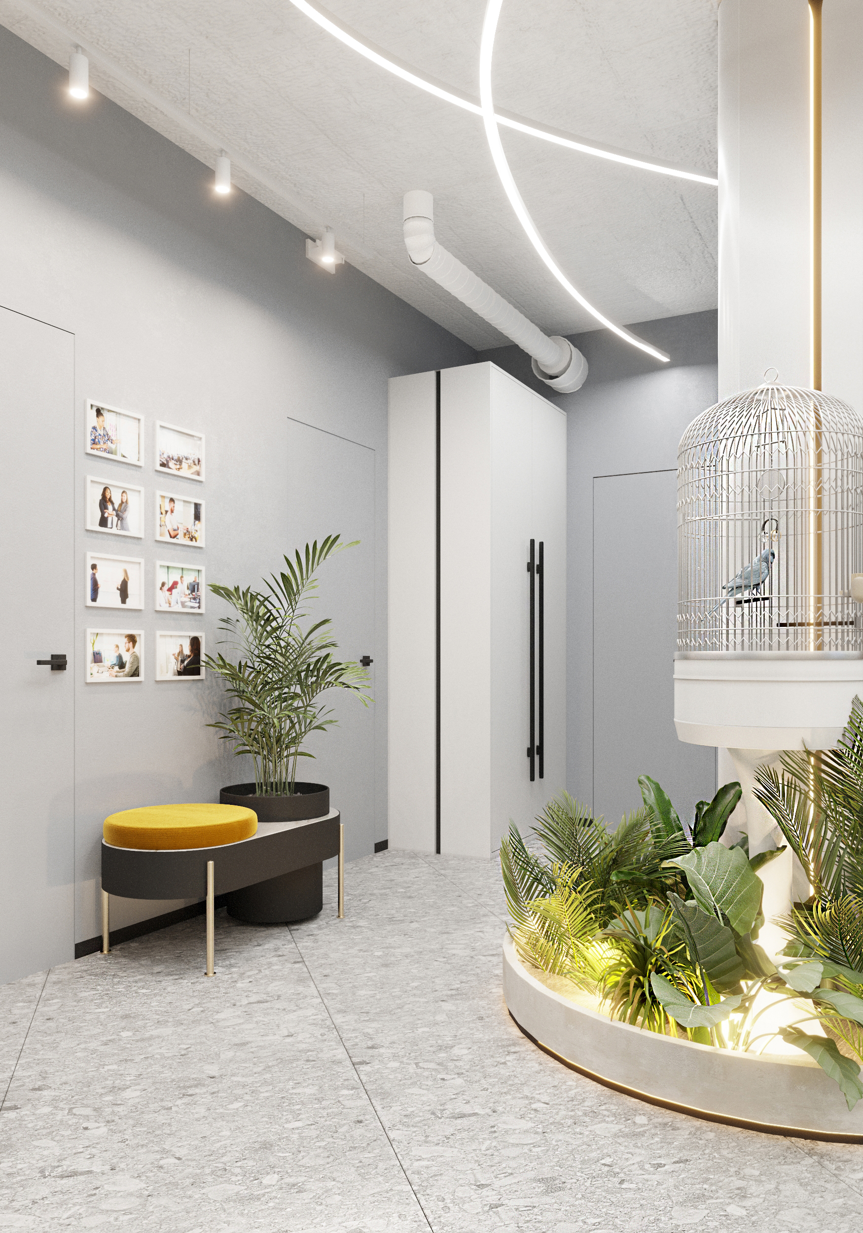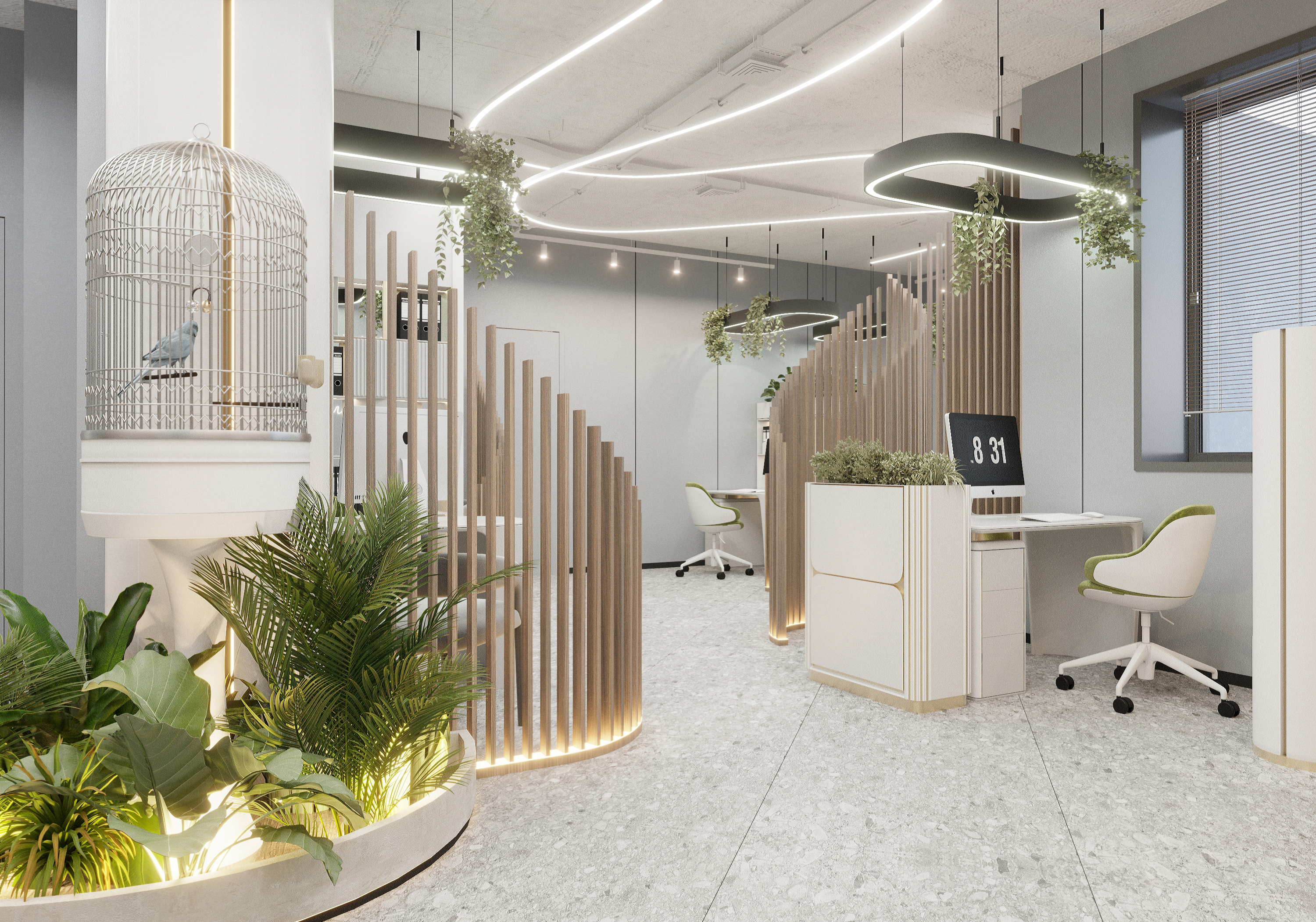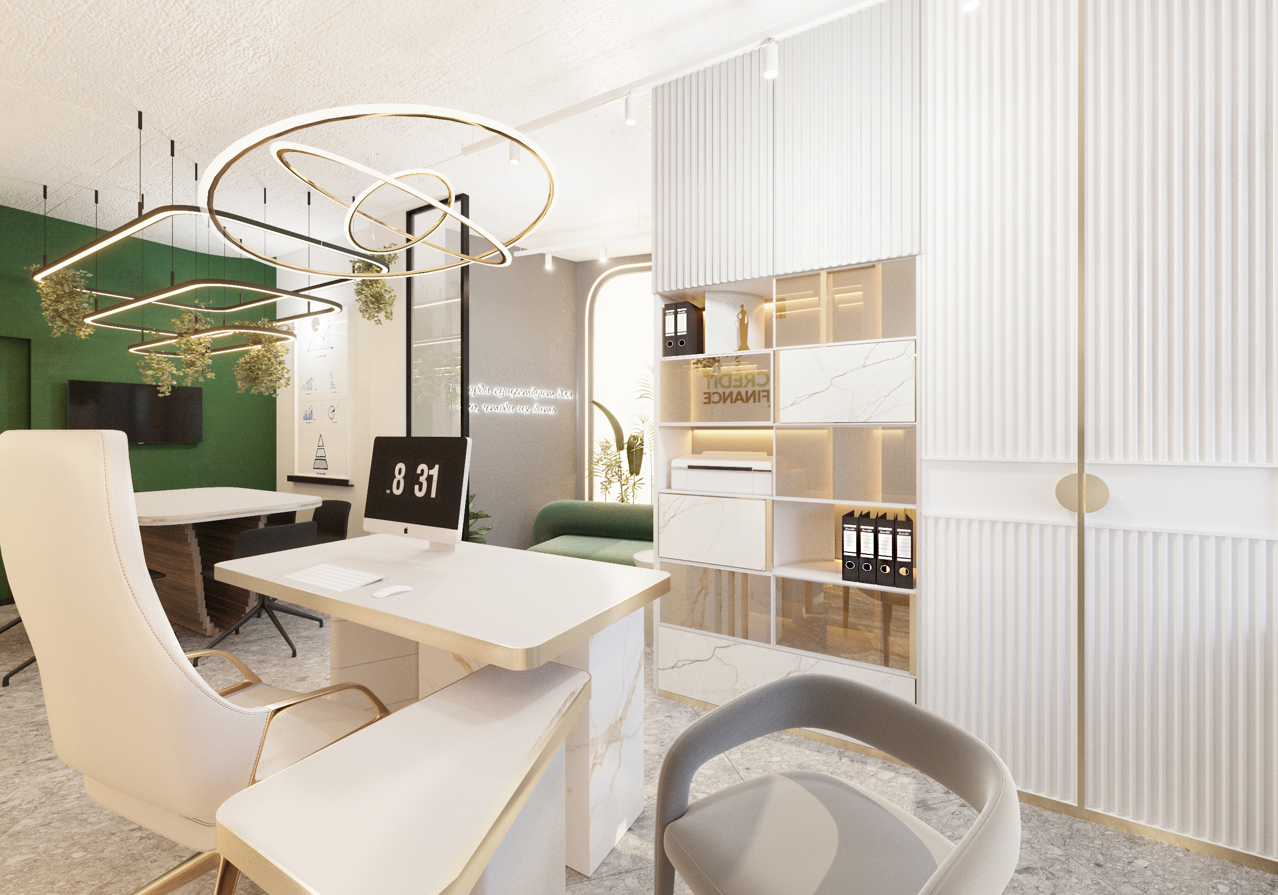 Дизайн-концепция офиса читается в светлом и динамичном интерьере, плавных линиях, ярких акцентах и парящих световых приемах.Светлая входная группа и зона ресепшн с эффектно представленным в интерьере брендом, визуально расскажет своим клиентам о философии и преимуществах компании.