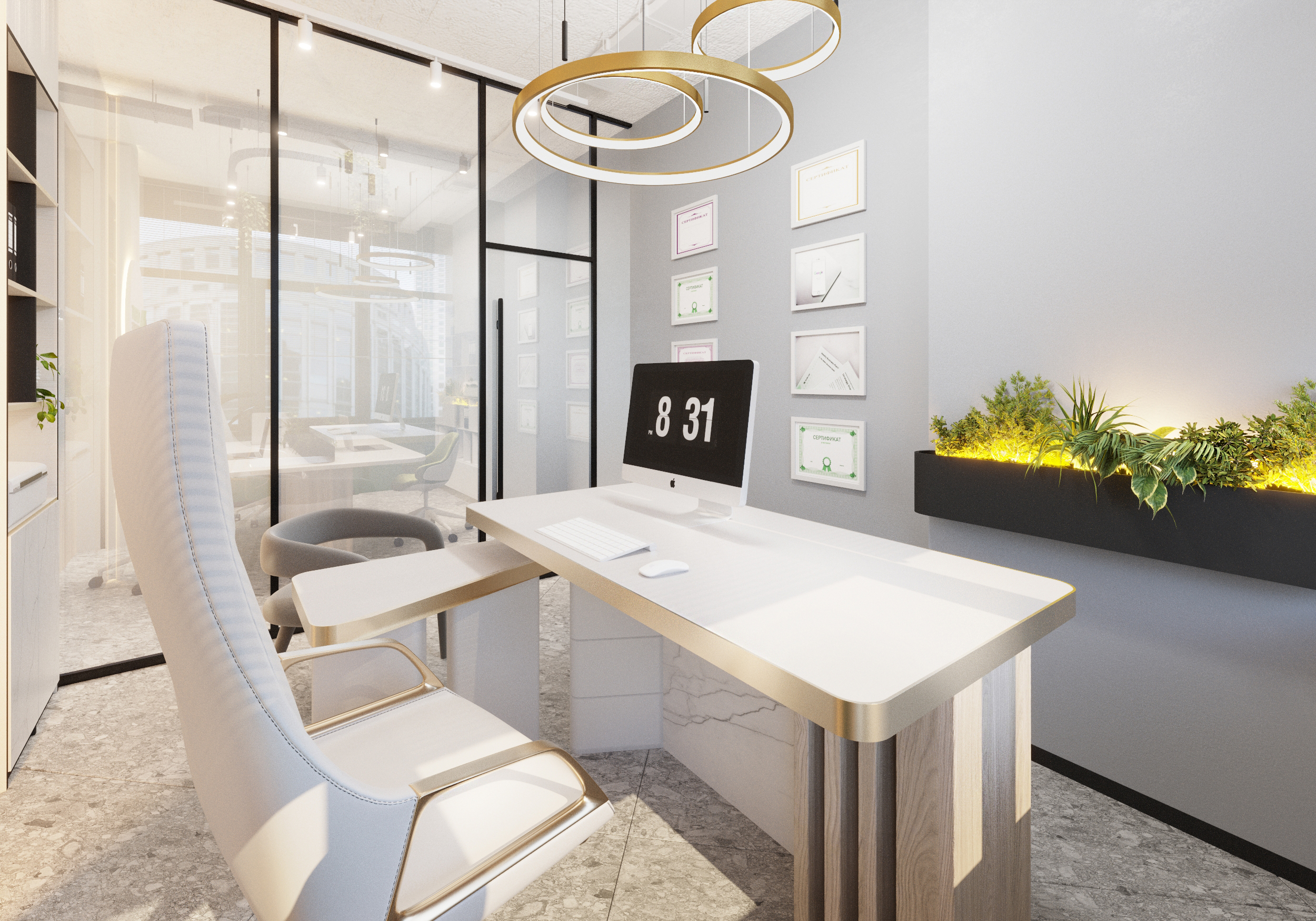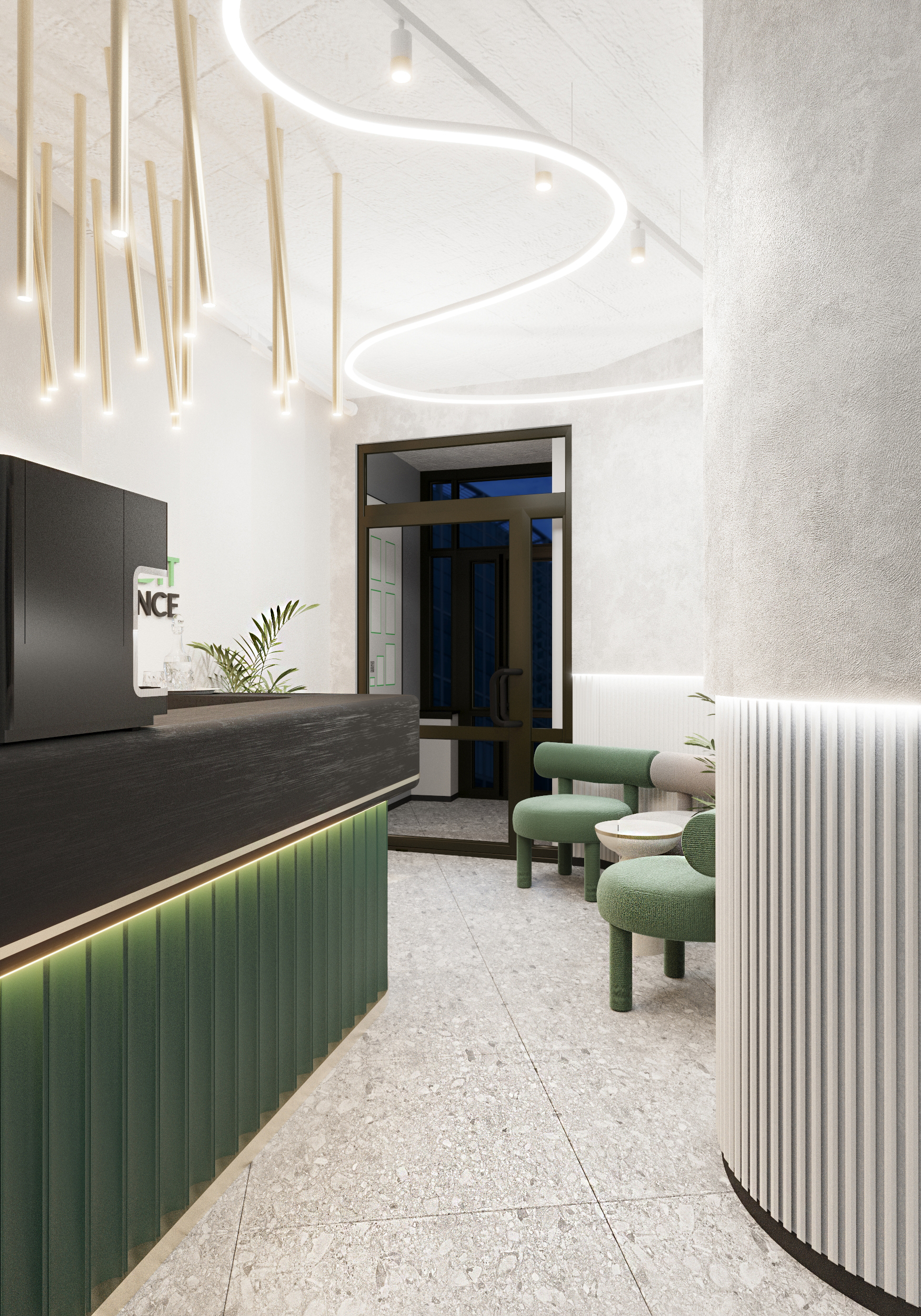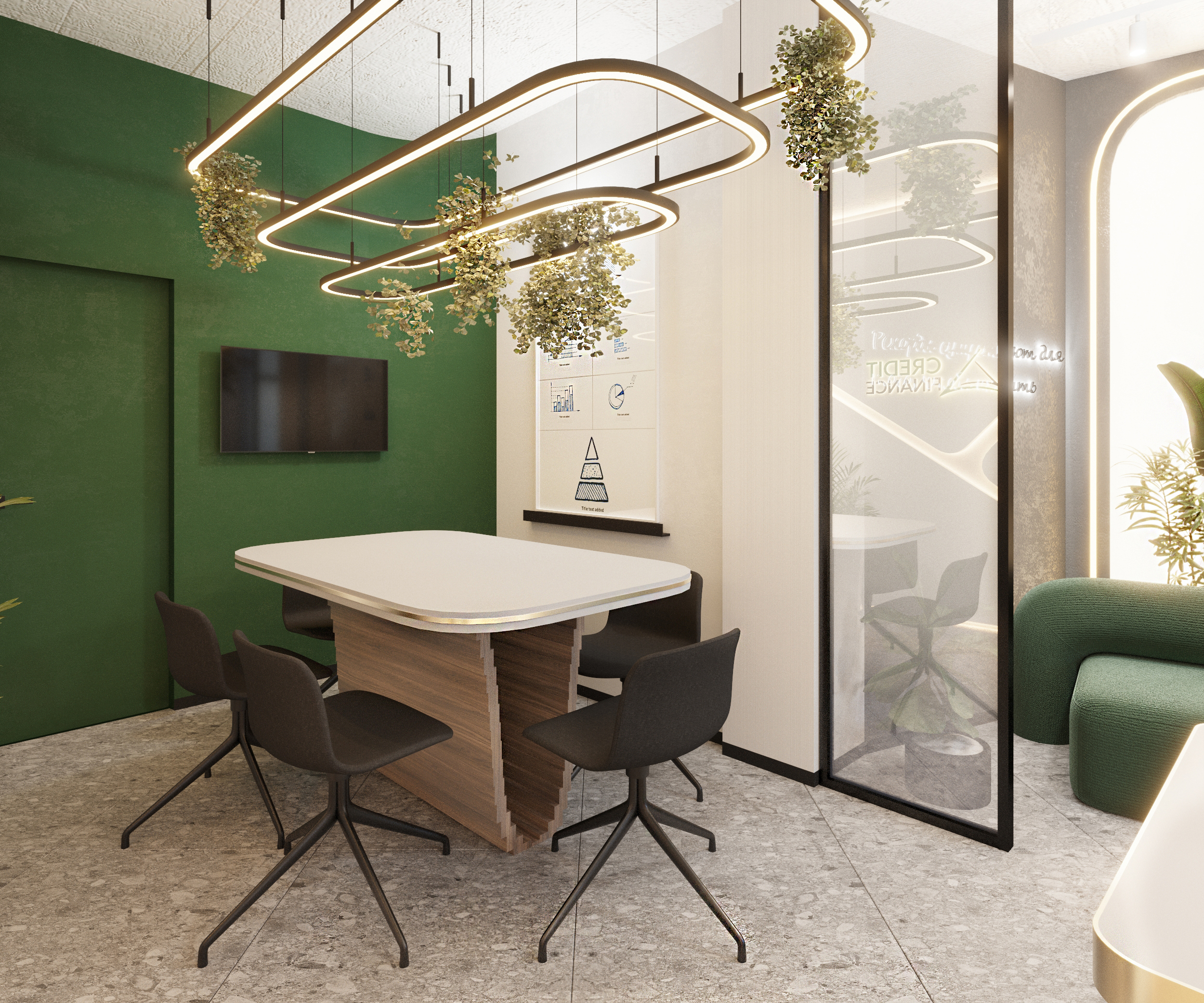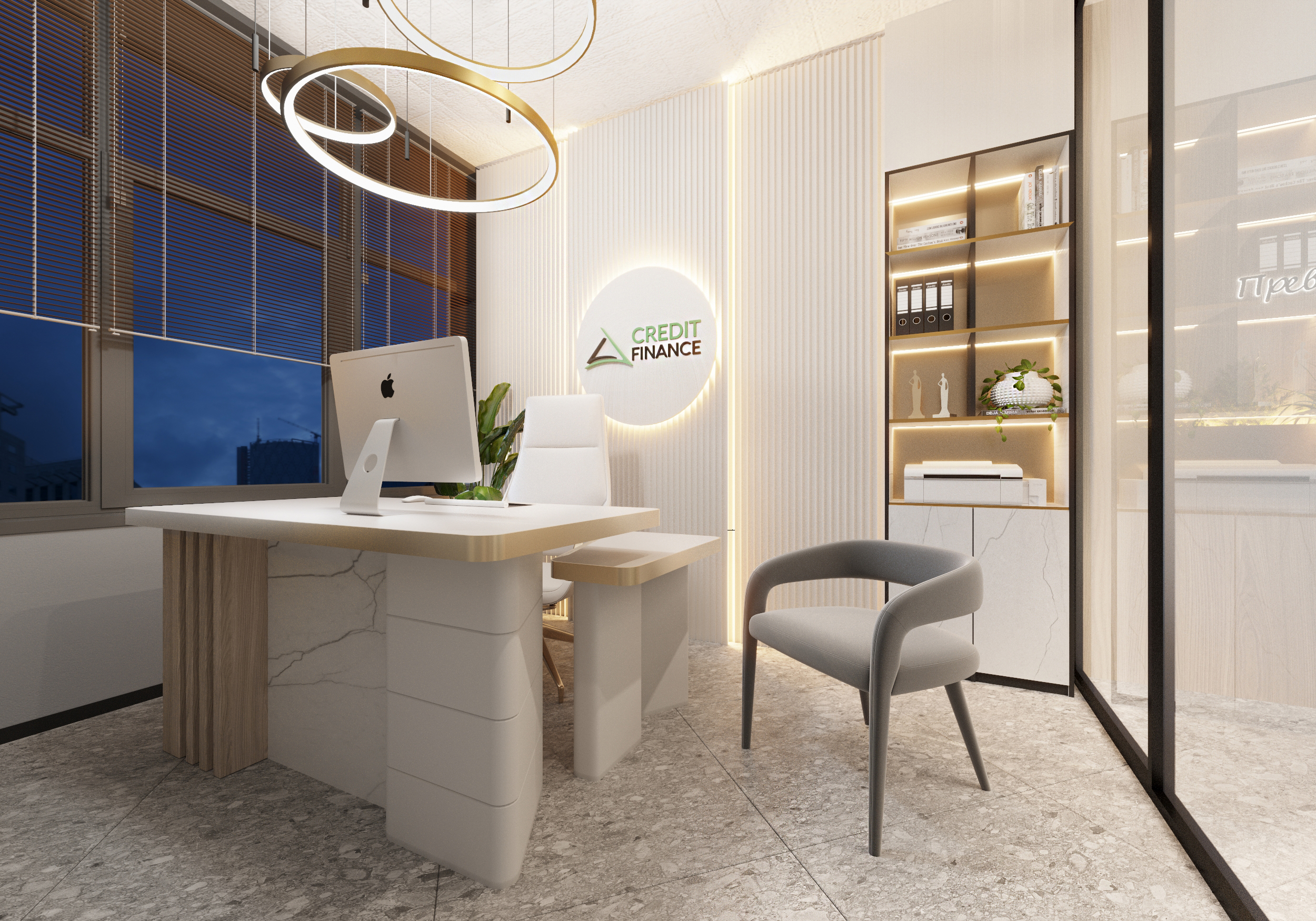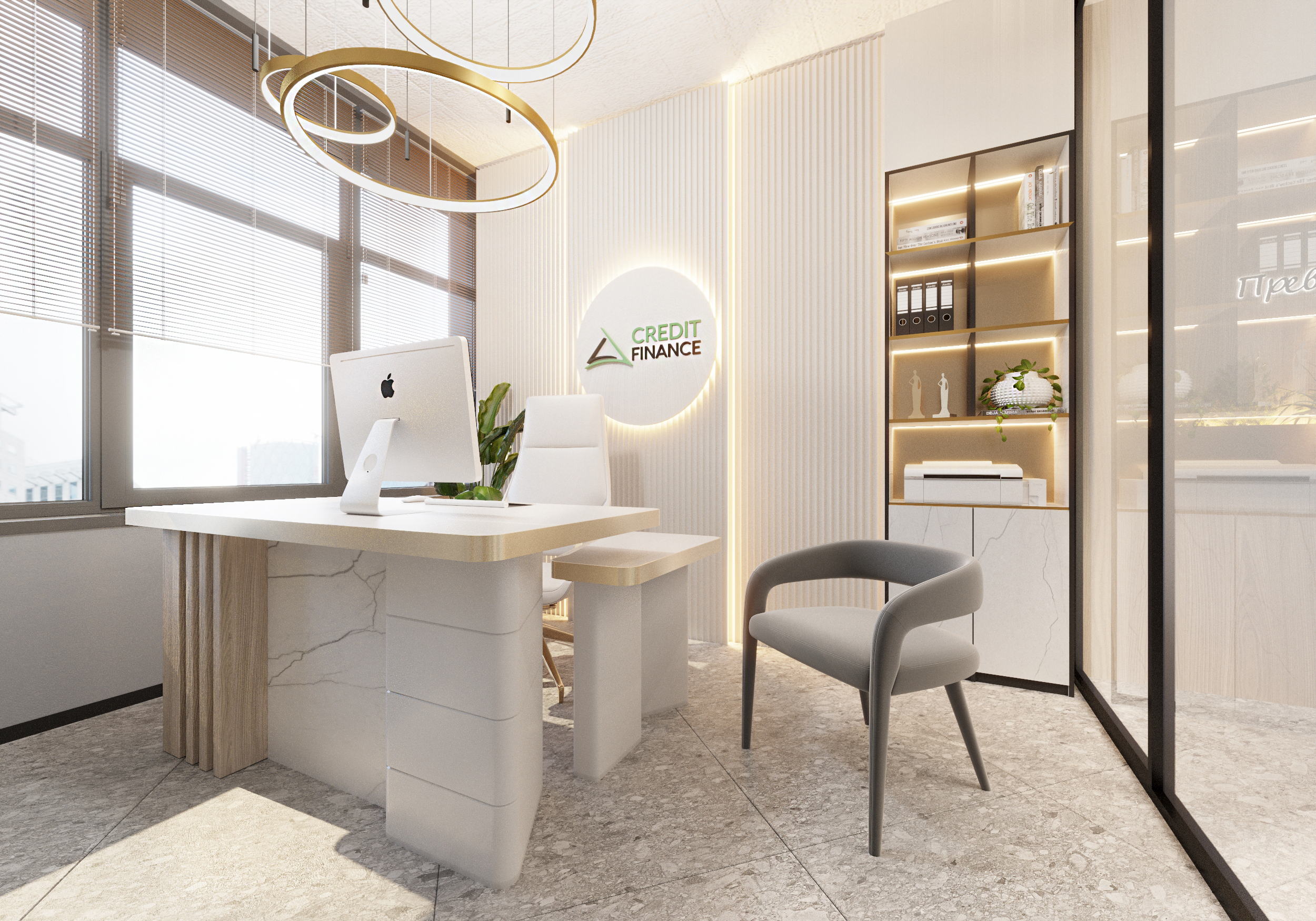 Дизайн-концепция офиса читается в светлом и динамичном интерьере, плавных линиях, ярких акцентах и парящих световых приемах.Светлая входная группа и зона ресепшн с эффектно представленным в интерьере брендом, визуально расскажет своим клиентам о философии и преимуществах компании.