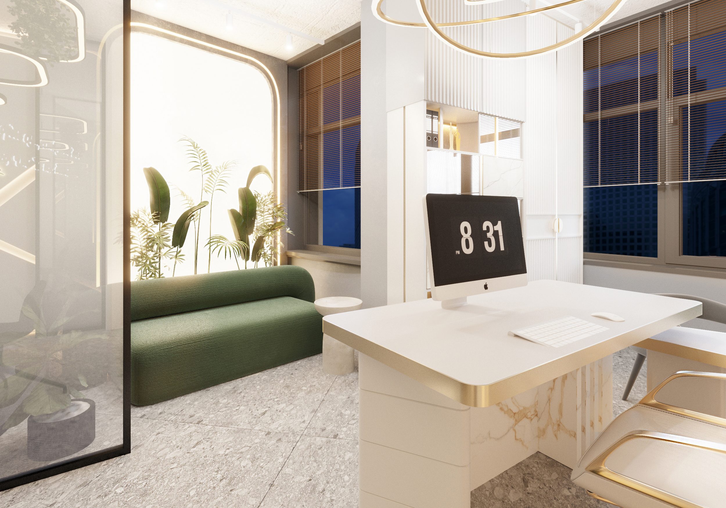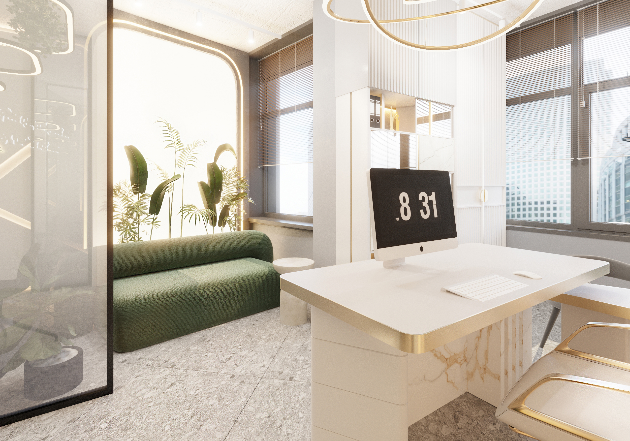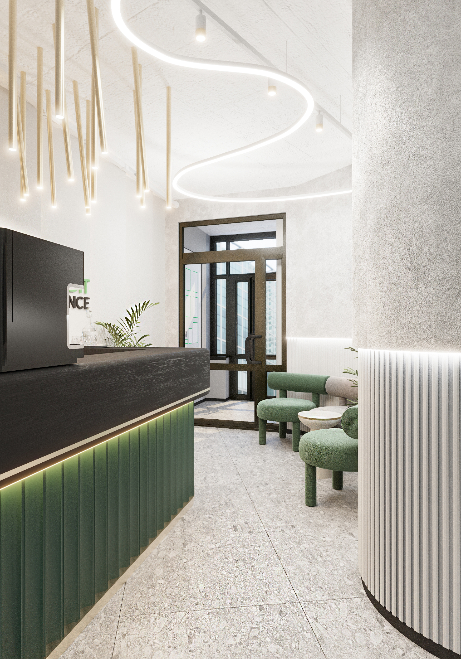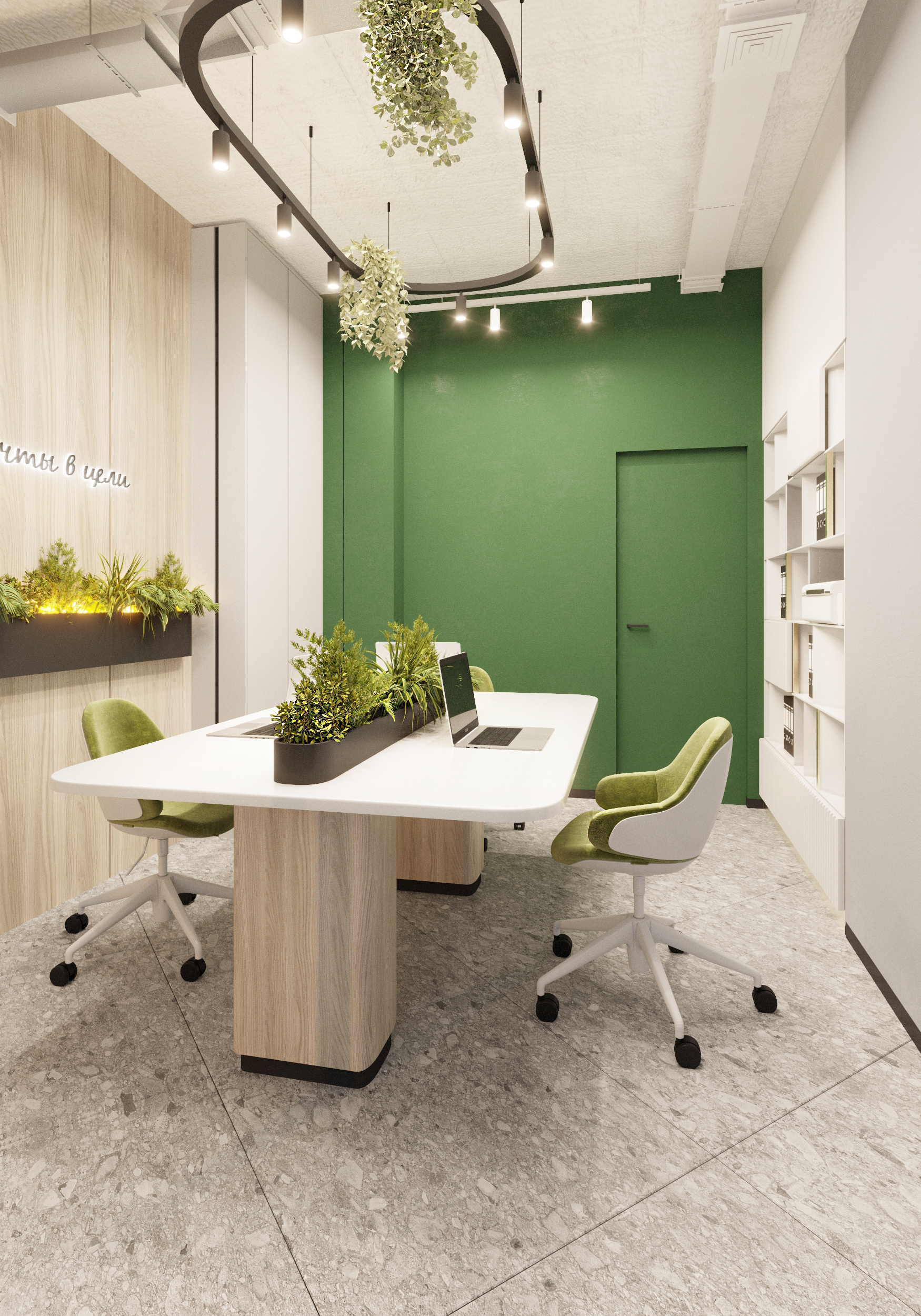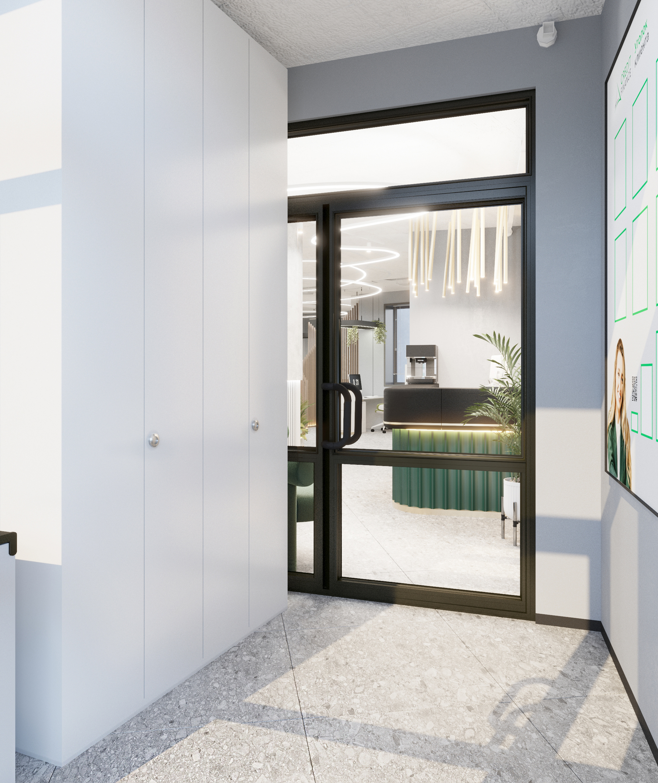 Дизайн-концепция офиса читается в светлом и динамичном интерьере, плавных линиях, ярких акцентах и парящих световых приемах.Светлая входная группа и зона ресепшн с эффектно представленным в интерьере брендом, визуально расскажет своим клиентам о философии и преимуществах компании.