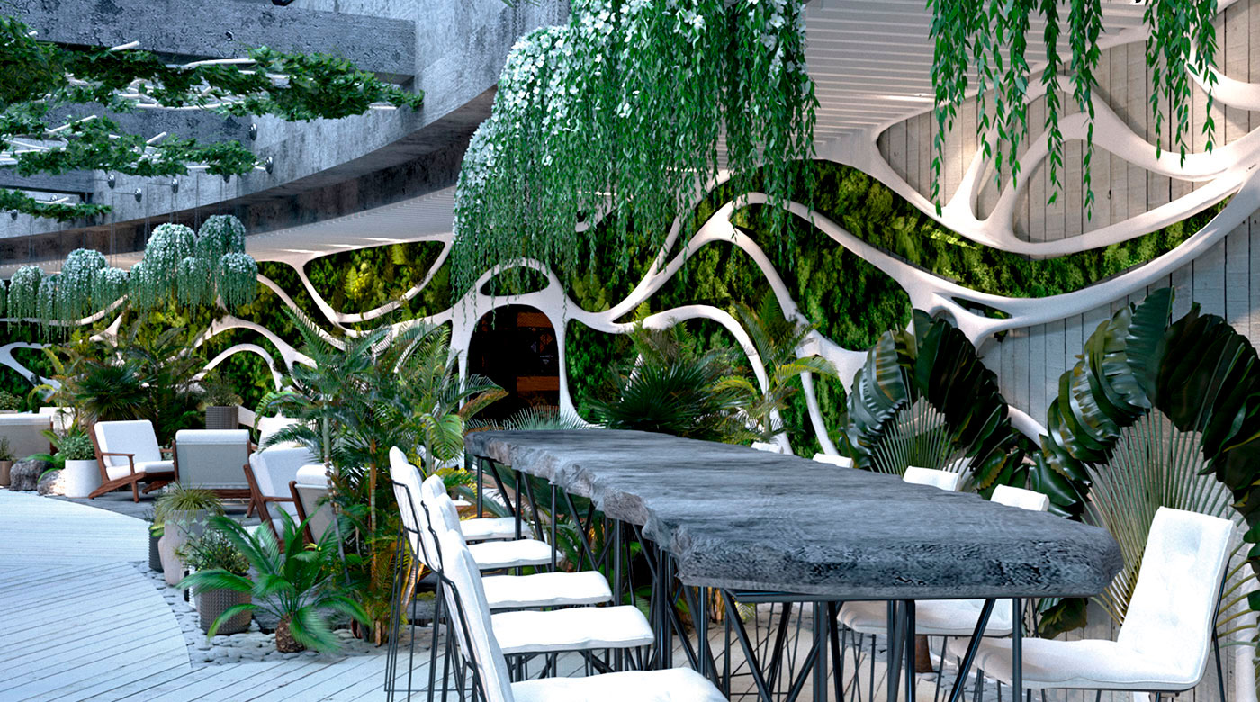 Ресторан WINTER GARDEN- это уникальный и концептуальный дизайн GREEN STUDIO, симбиоз бионических форм и неофутуризма в интерьере, профессиональные сценарии света и приятная атмосфера.