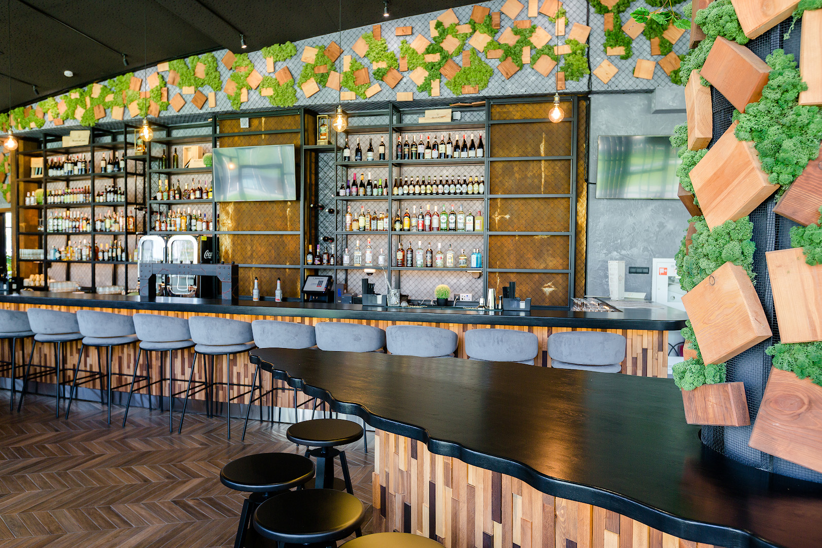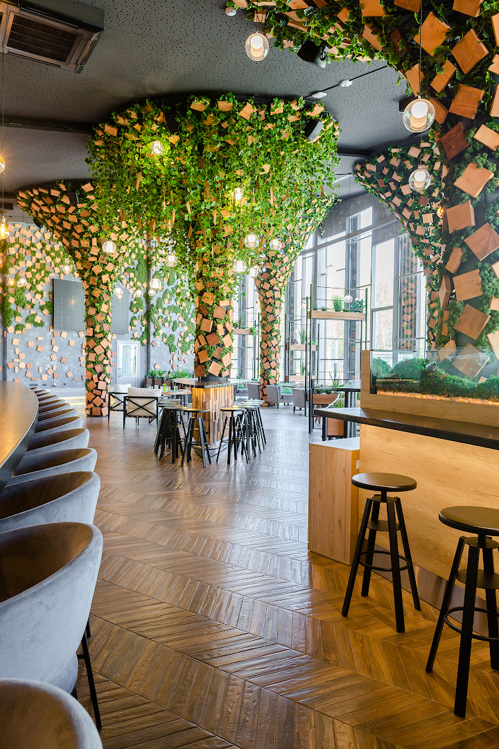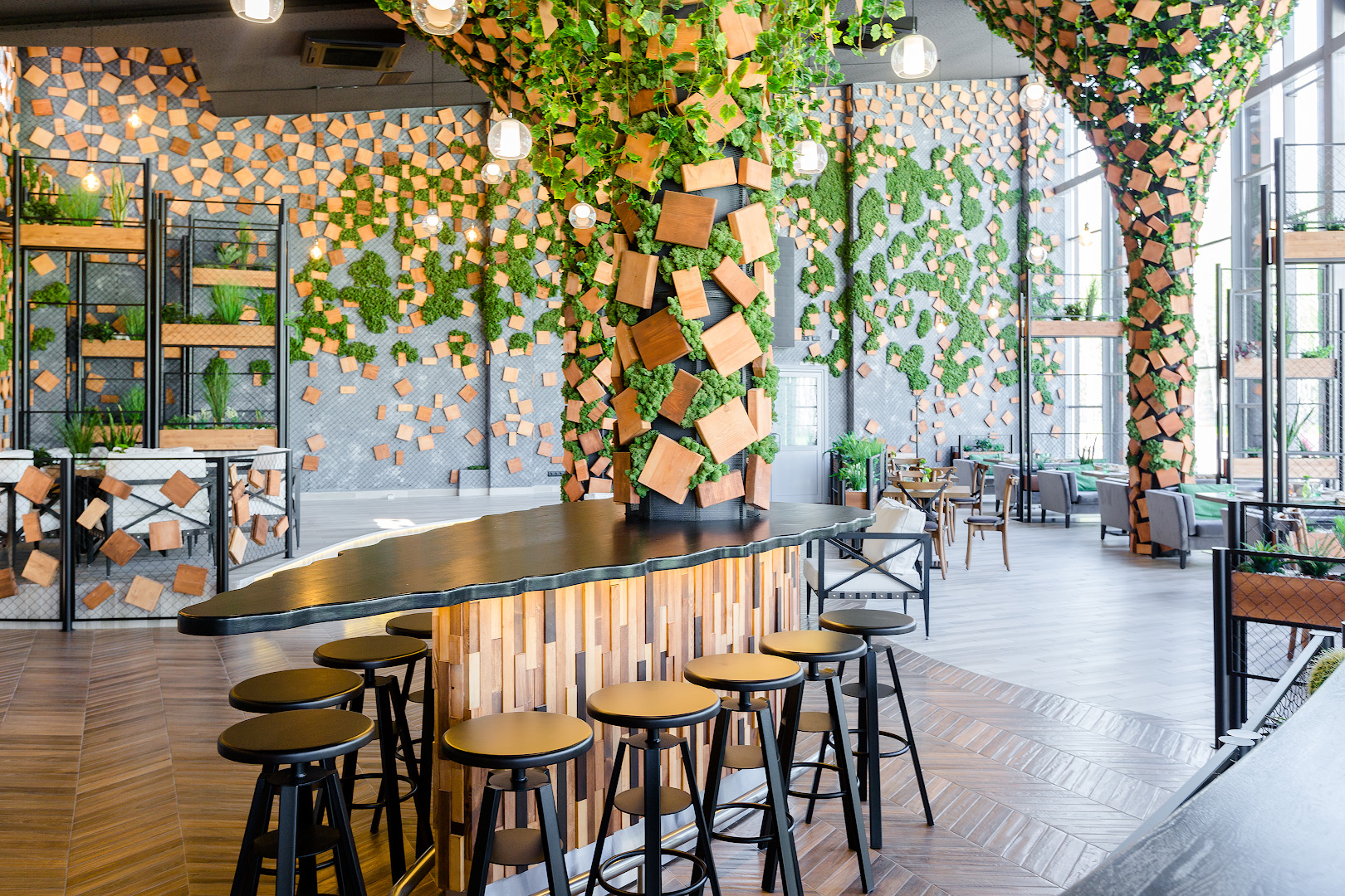 Основным акцентом пространства являются оформление колонн в виде впечатляющих футуристичных деревьев с внутренним металлическим каркасом и наружной деревянной отделкой, дополняют композицию из деревьев оформление стен и потолков аналогичными элементами деревянного декора и стабилизированной зелени.