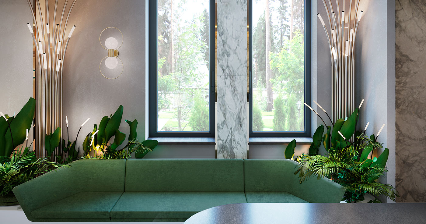 Дизайн концепция данных пространств разрабатывалась на основе природных форм окружения. В основу легли стилизованные деревья, чистые и лаконичные текстуры, обтекаемые контуры и линии.