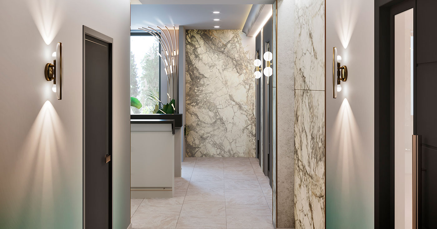 Освещение предусмотрено с настенных конструкций т колонн с приемом отражения, дающего мягкий заливающий свет, локальные группы декоративной теплой подсветки создают уют SPA