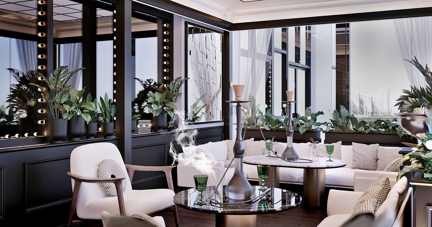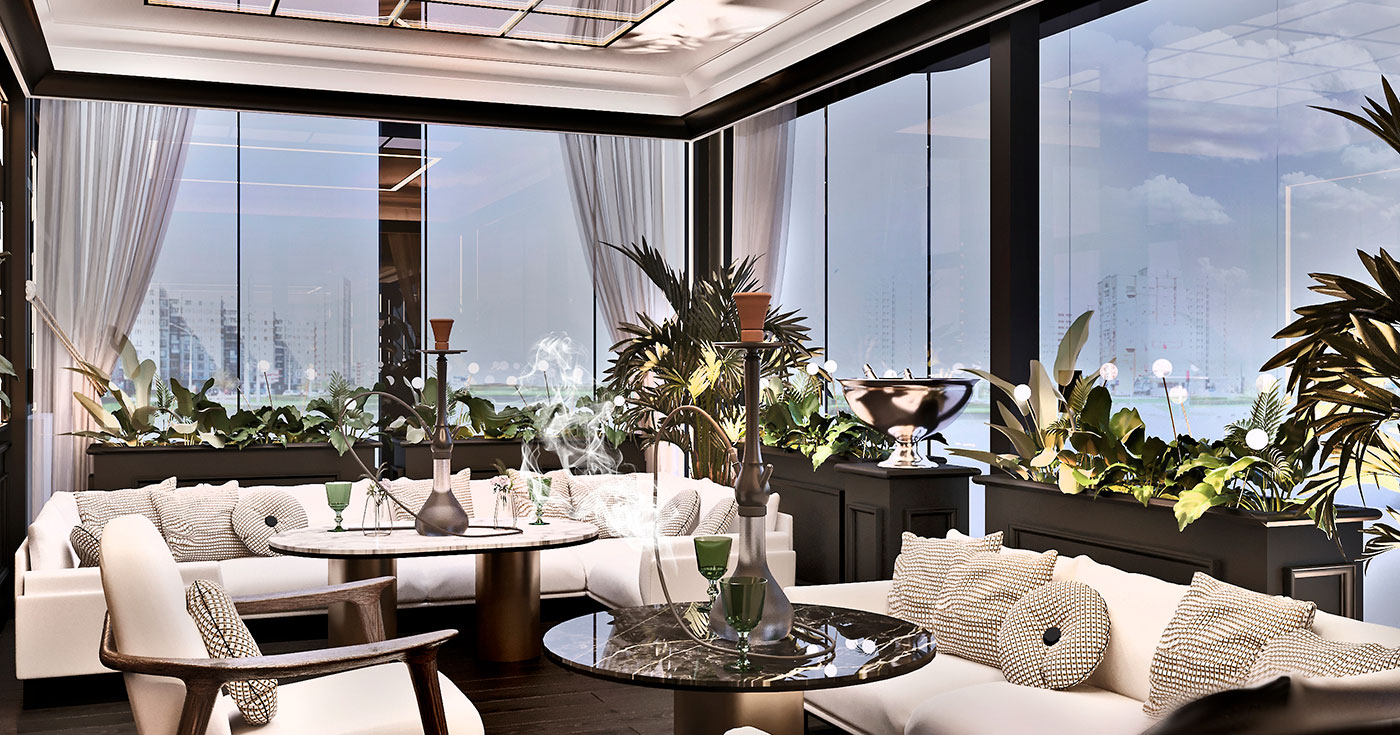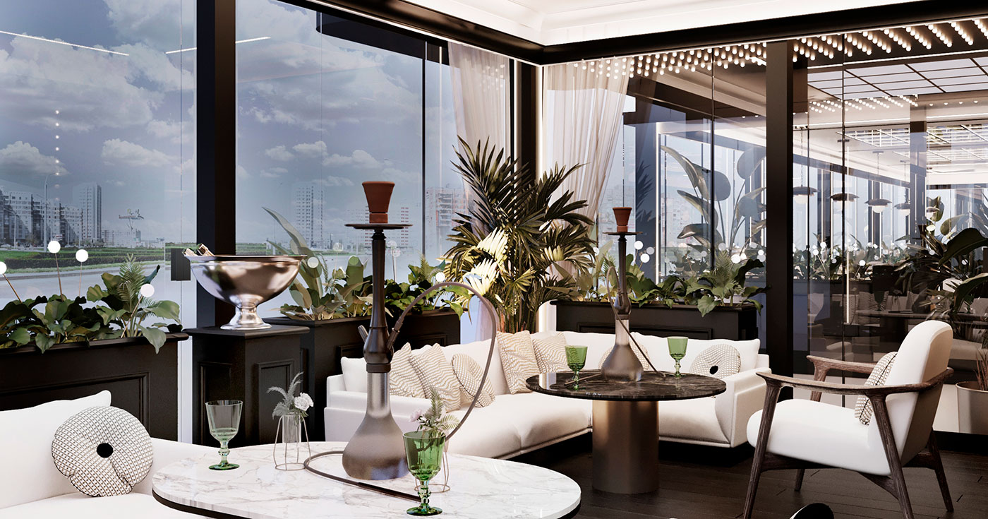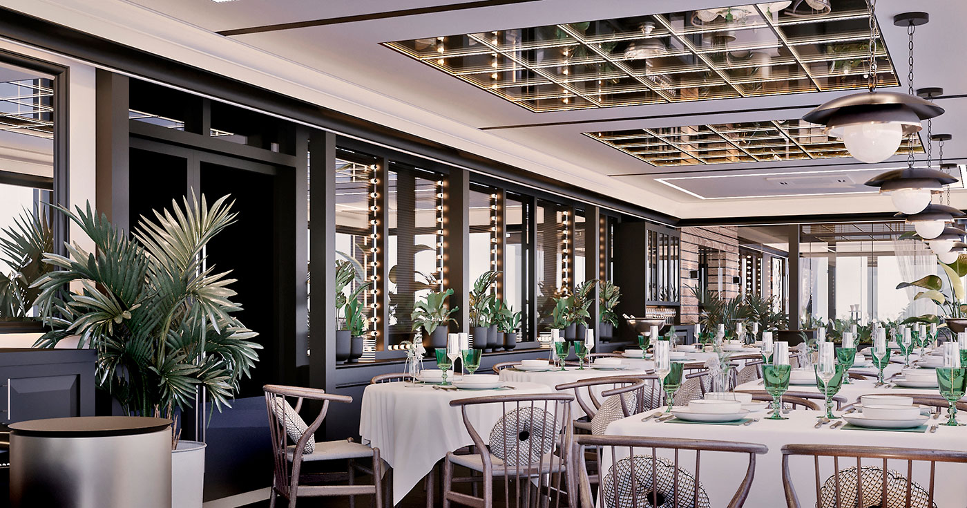 Основным акцентом террасы был выбран светлый потолок с графическими контурными потолочными инсталляциями и настенными зеркалами, применены строгие колонны с подсветкой, а многослойные подвесные светильники добавляют интерьеру брутальности. Общее пространство делится на две зоны: большую светлую террасу и уютную lounge-террасу.В lounge прослеживается формат и атмосфера отдыха.Периметр террасы наполнен озеленением с мягкой подсветкой. Поддерживают атмосферу в темное время суток точечные, встроенные в пол светильники.Особое внимание уделено решению потолка. В основной террасе потолочная инсталляция встречает гостя эффектом бесконечного зеркала с теплой подсветкой в поддержку интерьера ресторана PEAKY BLINDERS.В малой террасе потолок притягивает взгляд лайтбоксом с мягким свечением, дающего ощущение открытого неба.Развивают концепцию зеркальное сегментированное панно в lounge террасе и большое брендированное зеркало в лаунж-террасе. Матовые текстуры контрастируют с отражениями и бликами, большими зеркалами и акцентными металлическими деталями. В сочетании с белым потолком, озеленением и периметральной подсветкой создается ощущение летней свежести и уюта в террасе PEAKY BLINDERS.